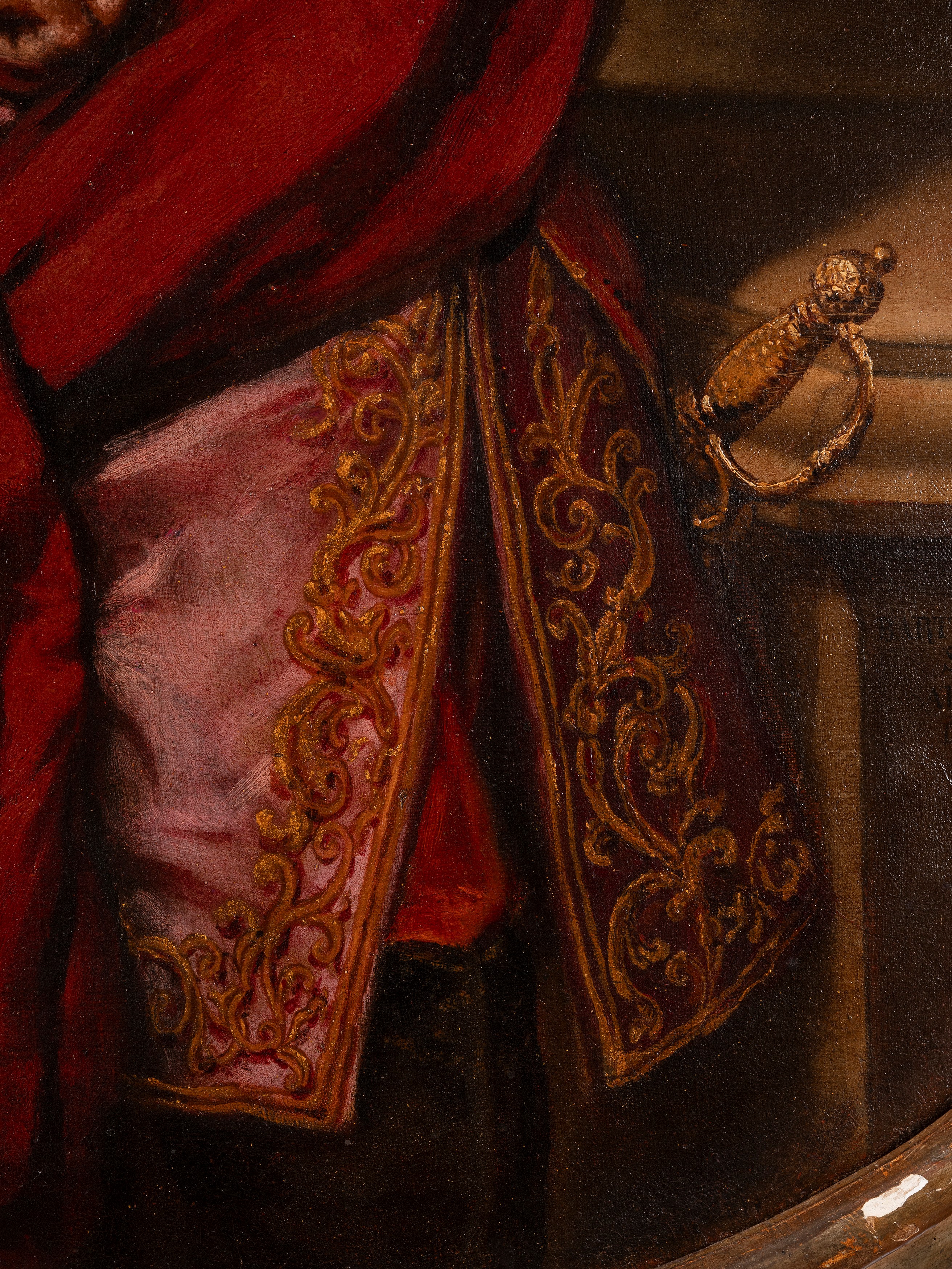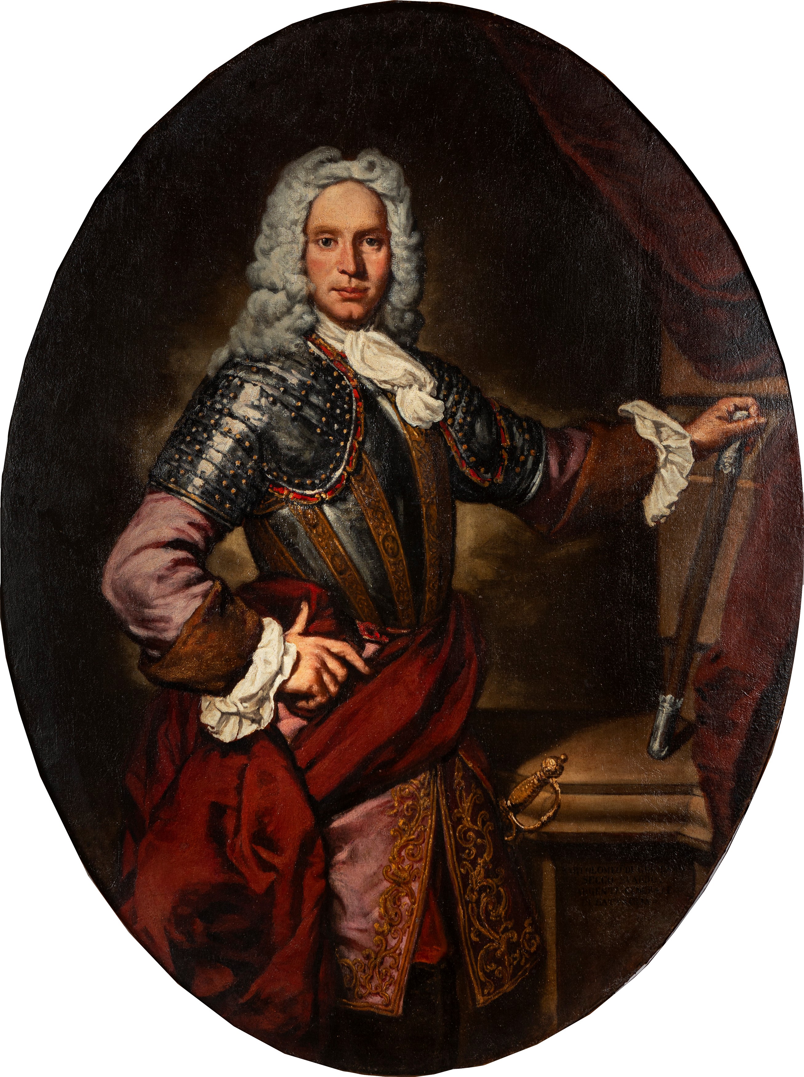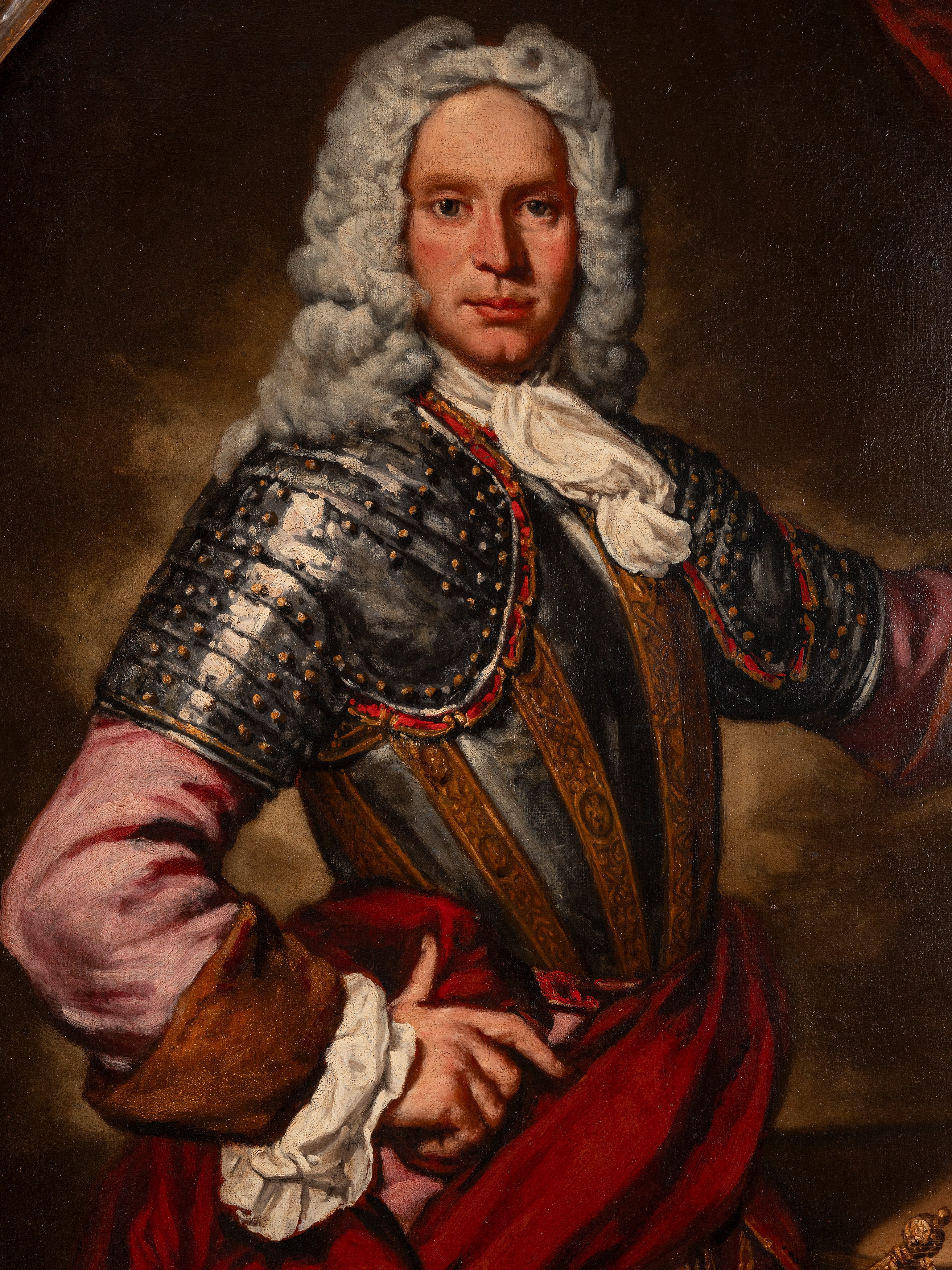 The portrayed is depicted two-thirds full-length, in armour, with a grey wig, a pink jacket with gold embroidery, a red cloak around the waist, white scarf and cuffs; at his side he has a ceremonial sword, in his left hand he holds a staff.