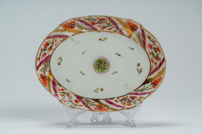 The moulded border painted with iron-red floral sprigs alternating with gilt ears of wheat and purple bands; the cavetto centered by a green medallion among scattered flowers. Chip along the rim.