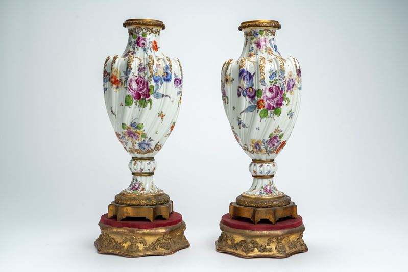 Pair of porcelain vases with fluted torchon design, decorated in polychrome with flowers and raised gilding. Höchst manufactory, 19th century