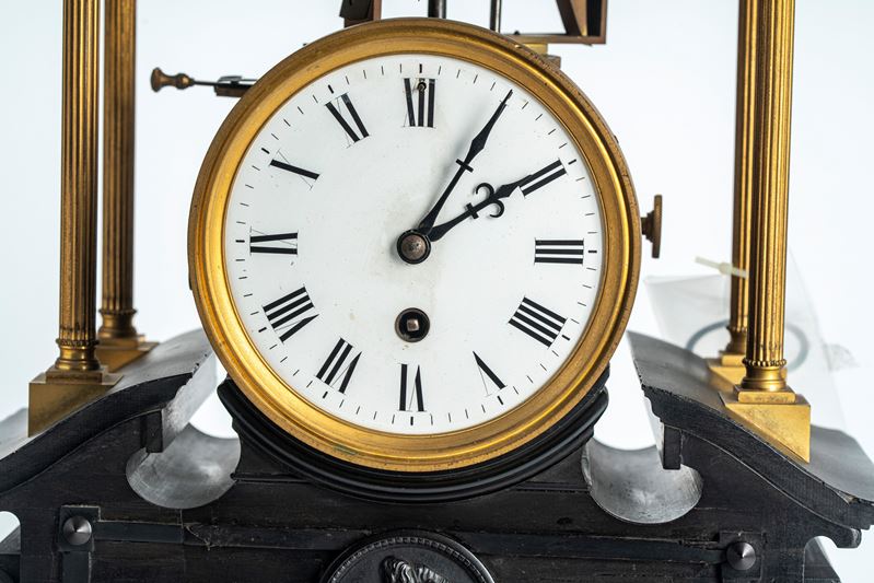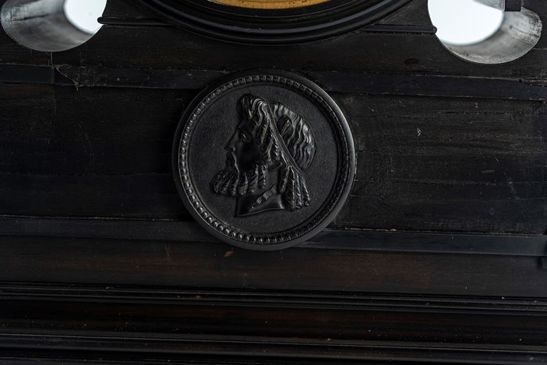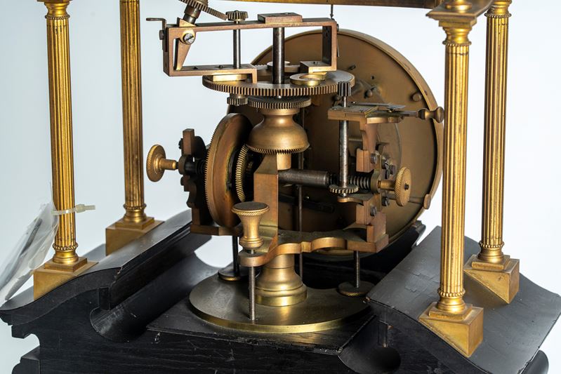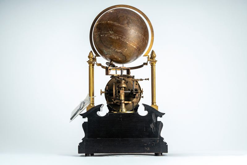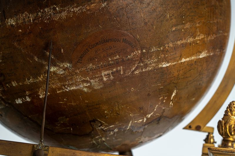On an ebonized wood plinth case surmounted by a white enamel dial with Roman numerals for the hours. The globe inscribed “Pendule Cosmographique Mouret B.S.G D.C. France & Étranger …”.