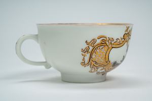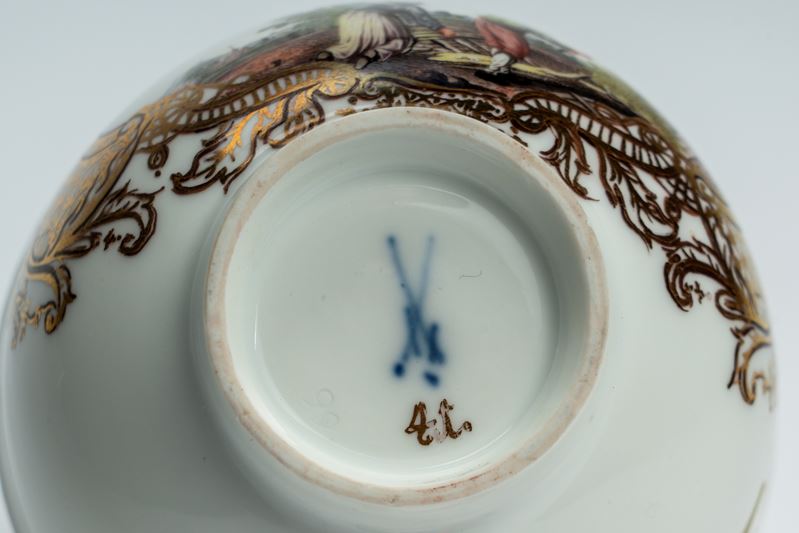 Porcelain cup decorated in polychrome with a genre scene within a gilt cartouche. Meissen manufacture, circa 1770.