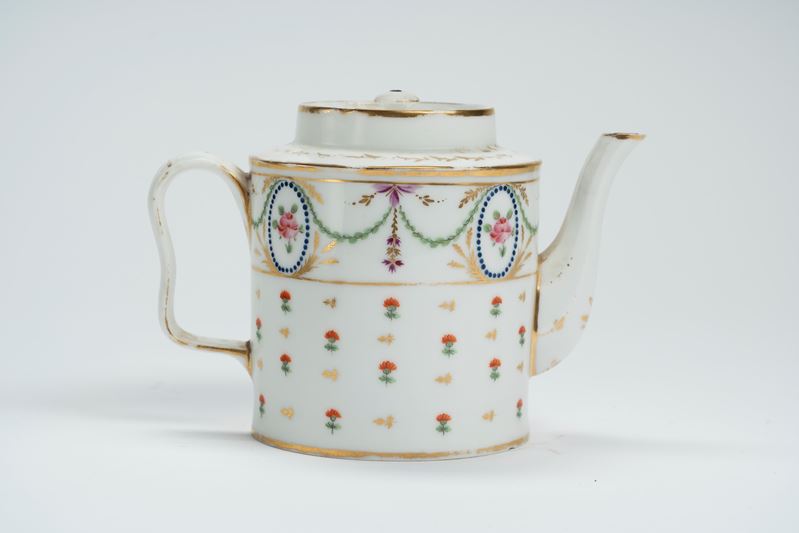 Porcelain teapot with cover, decorated in polychrome and gilt with geraniums and roses within blue beaded medallions and festoons. French manufacture, late 18th – early 19th century