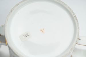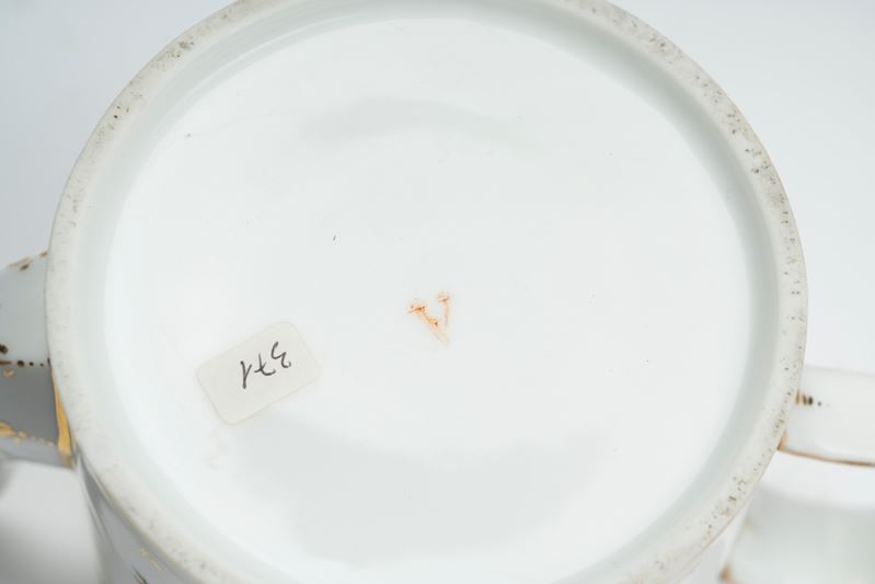 Pair of porcelain cups with saucers, gilt-edged and painted in polychrome with bouquets and...