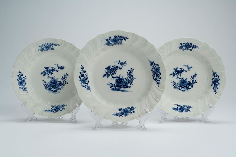 Three porcelain plates with shaped and ribbed molded rim, decorated with oriental-style cobalt-blue floral motifs. Possibly Belgium, Tournai, second half of the 18th century