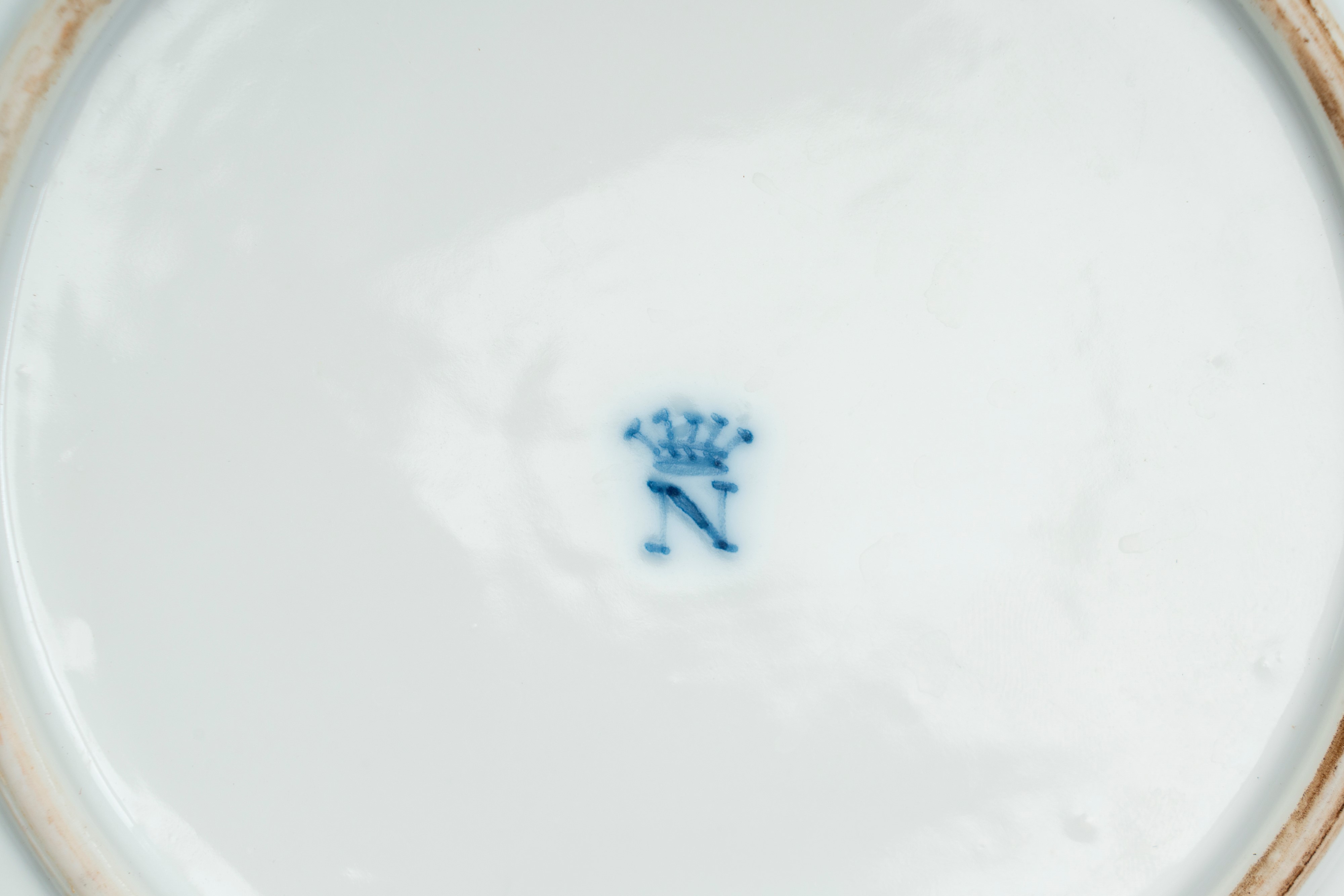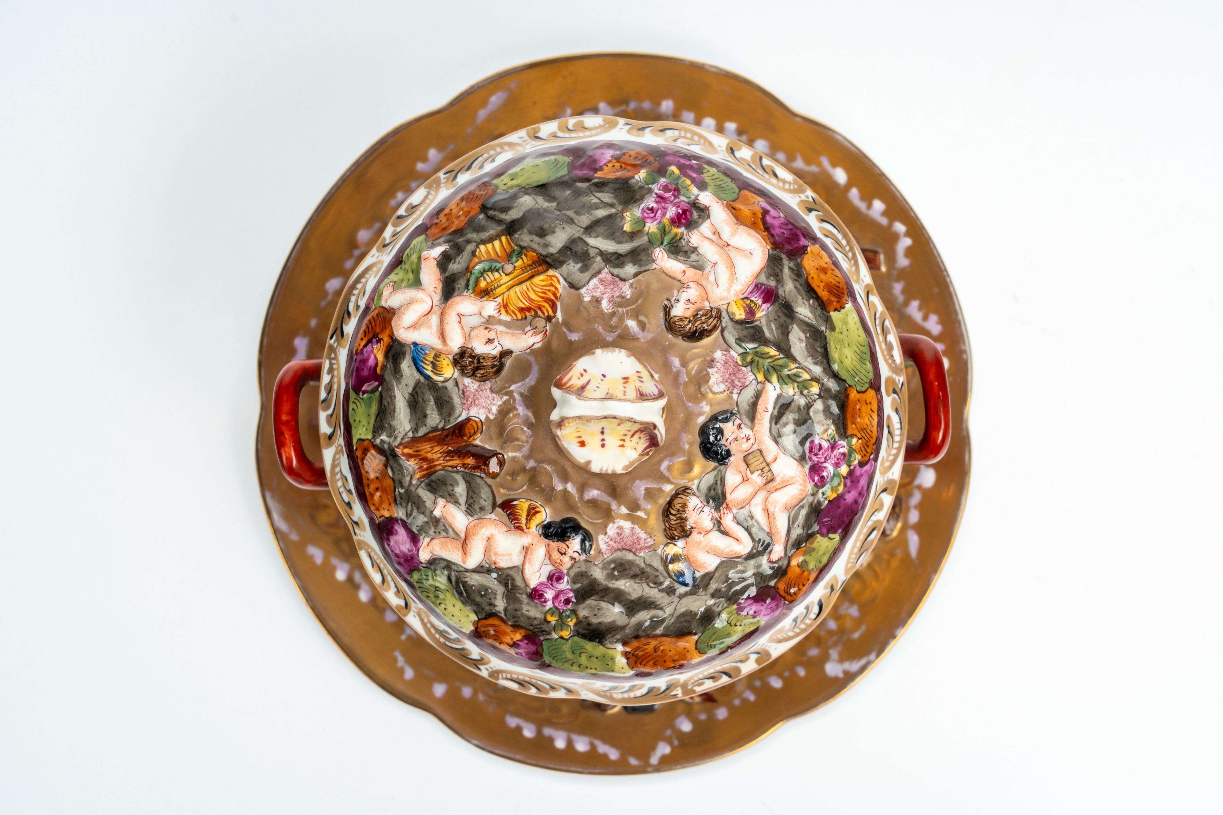 Decorated with putti in a landscape; cover with shell-shaped finial; interior painted with scattered polychrome flowers.