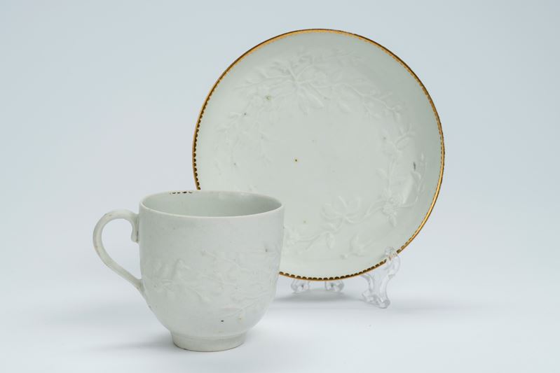 Decorated with trailing leaves and flowers, saucer and cup handle with gilt profiles. Hairline to the cup and chip to the foot of the saucer.