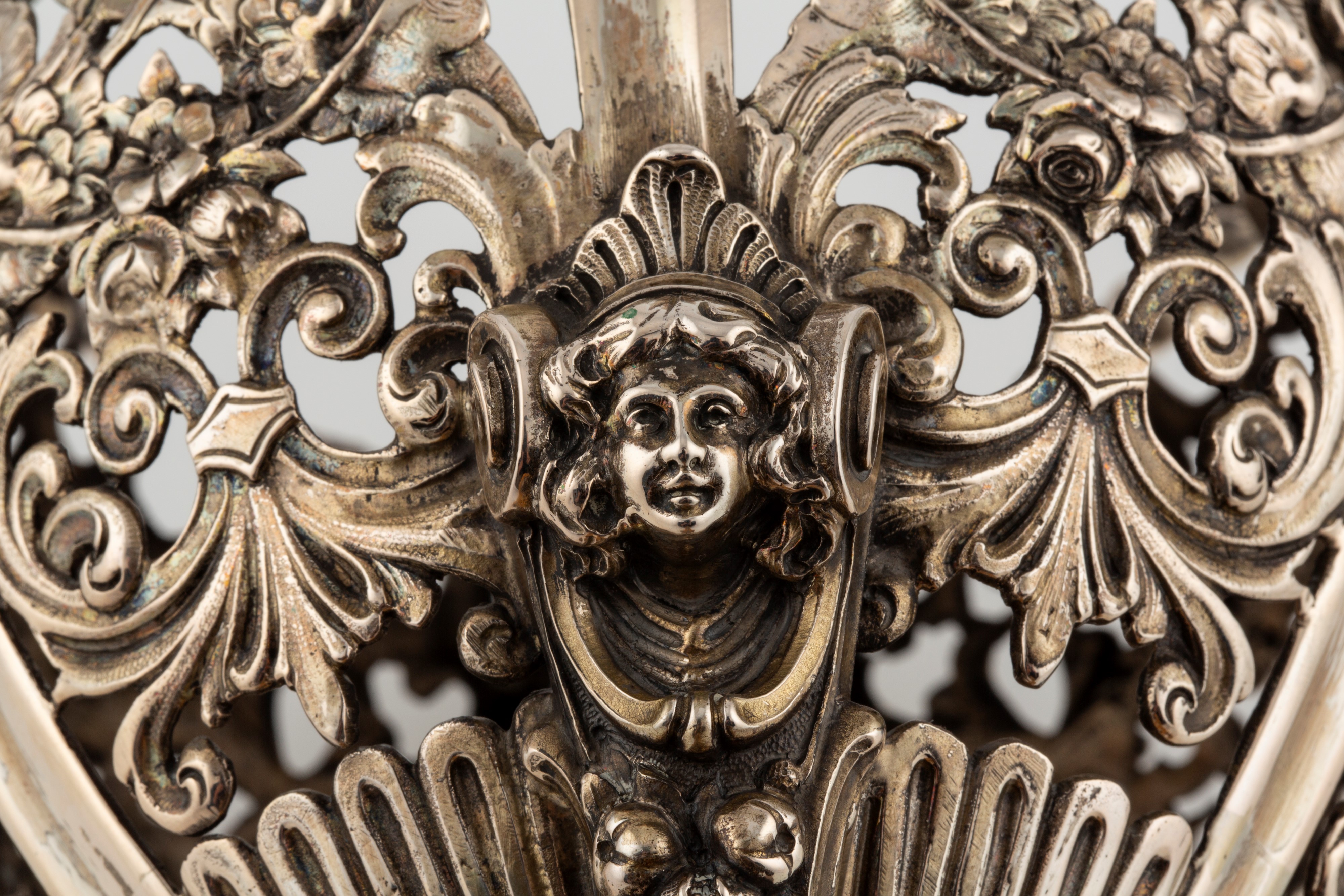 resting on three volute feet ending in elegant masks with festoons, the body is finely embossed and perforated with intertwined floral motifs and cornucopias, on a marble base, defects.