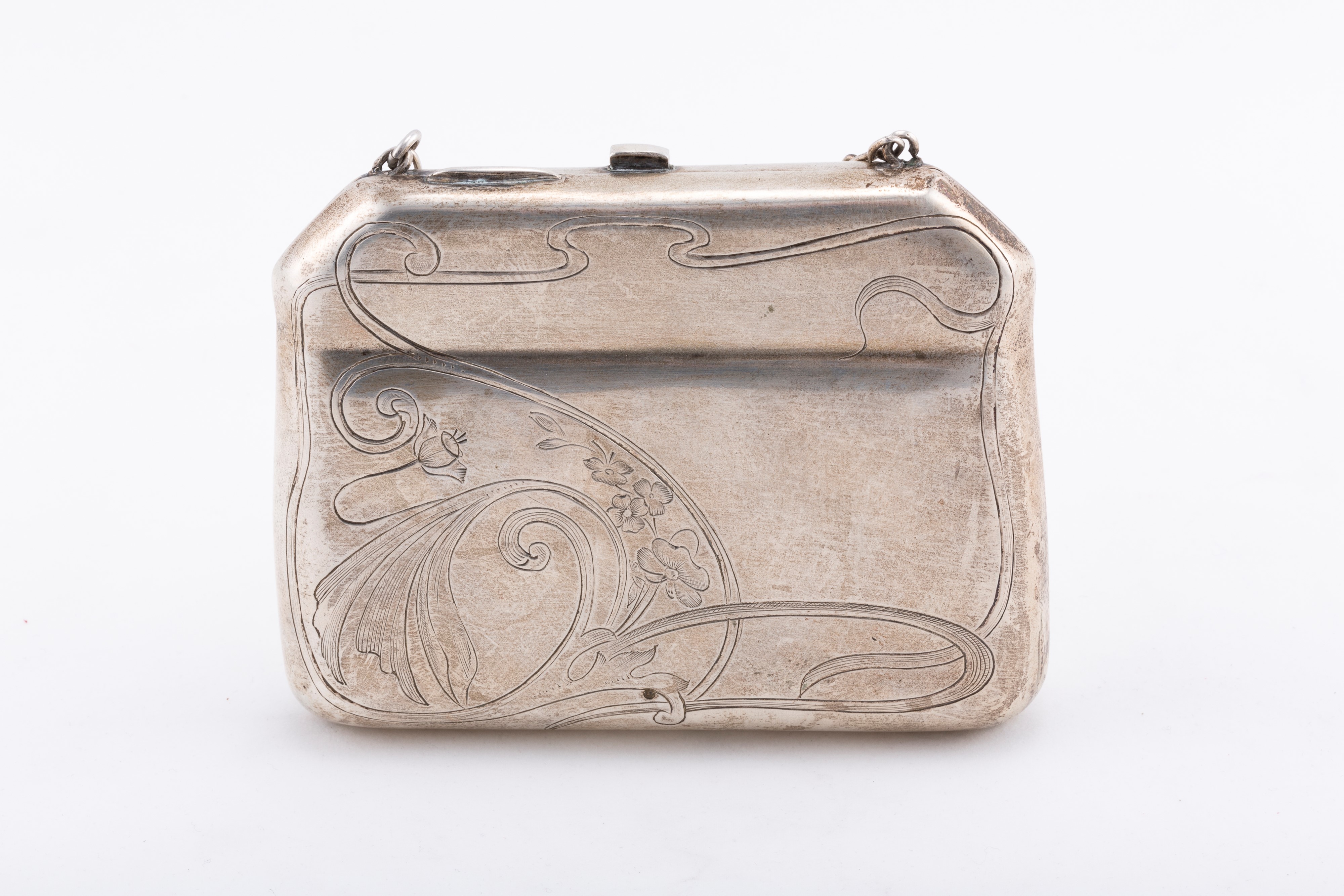 in the shape of a handbag, engraved on the body with Liberty-style floral motifs, (slight defects).