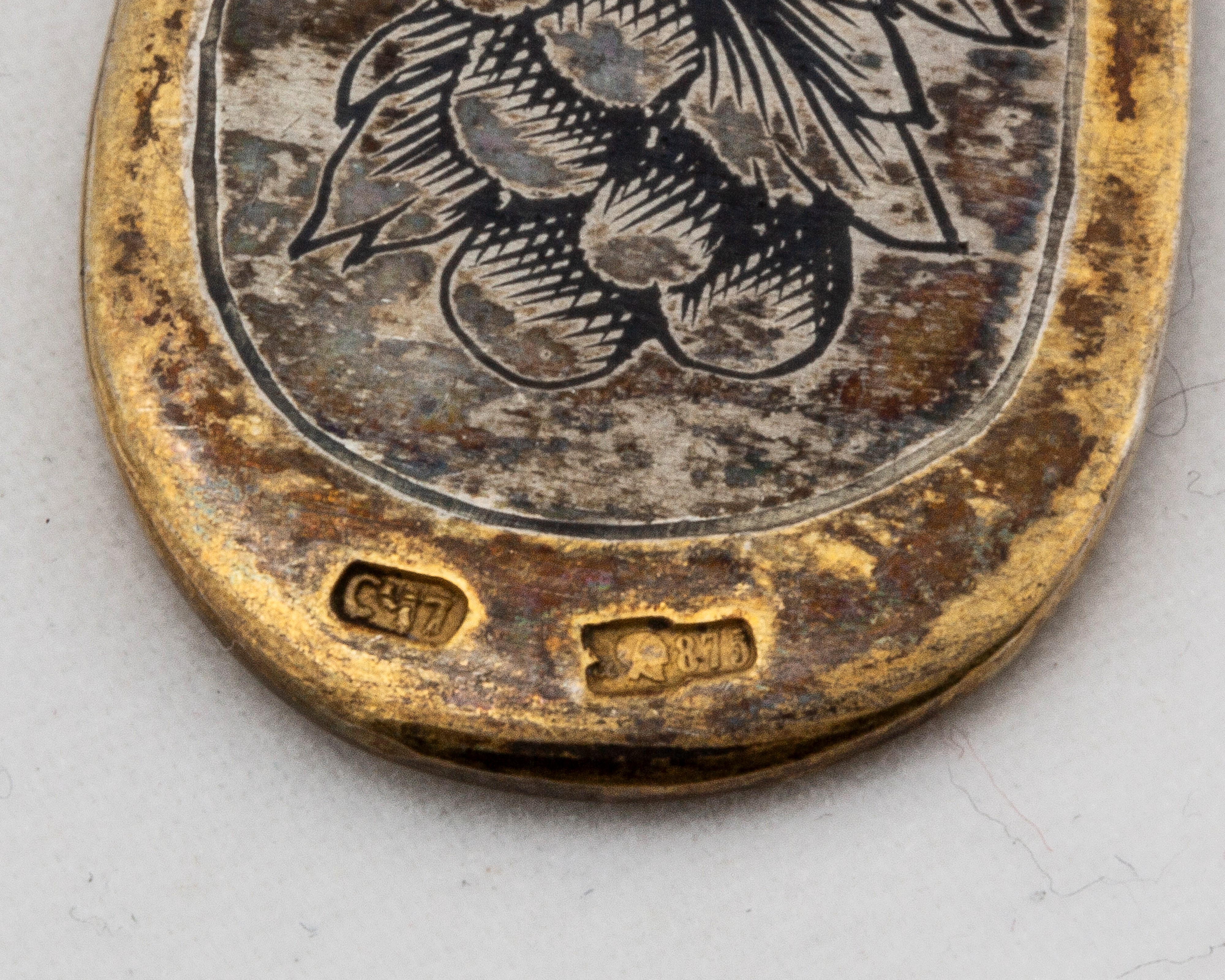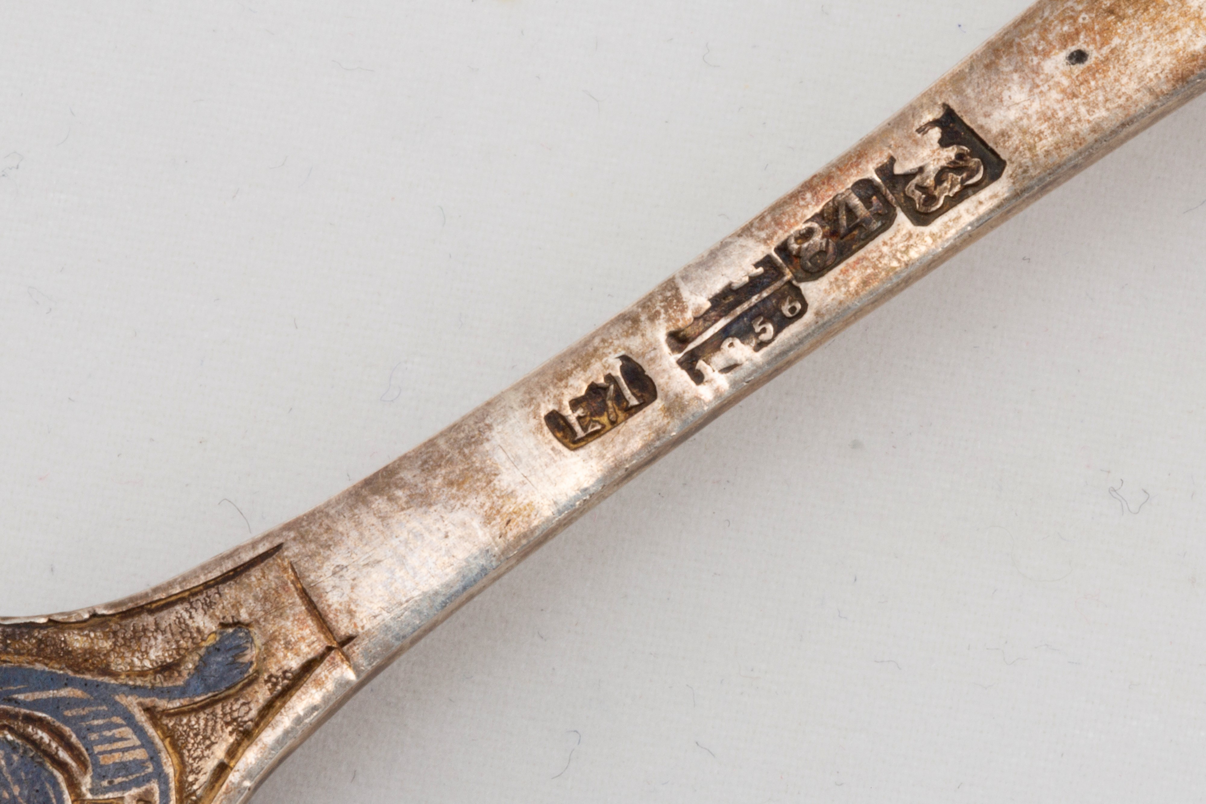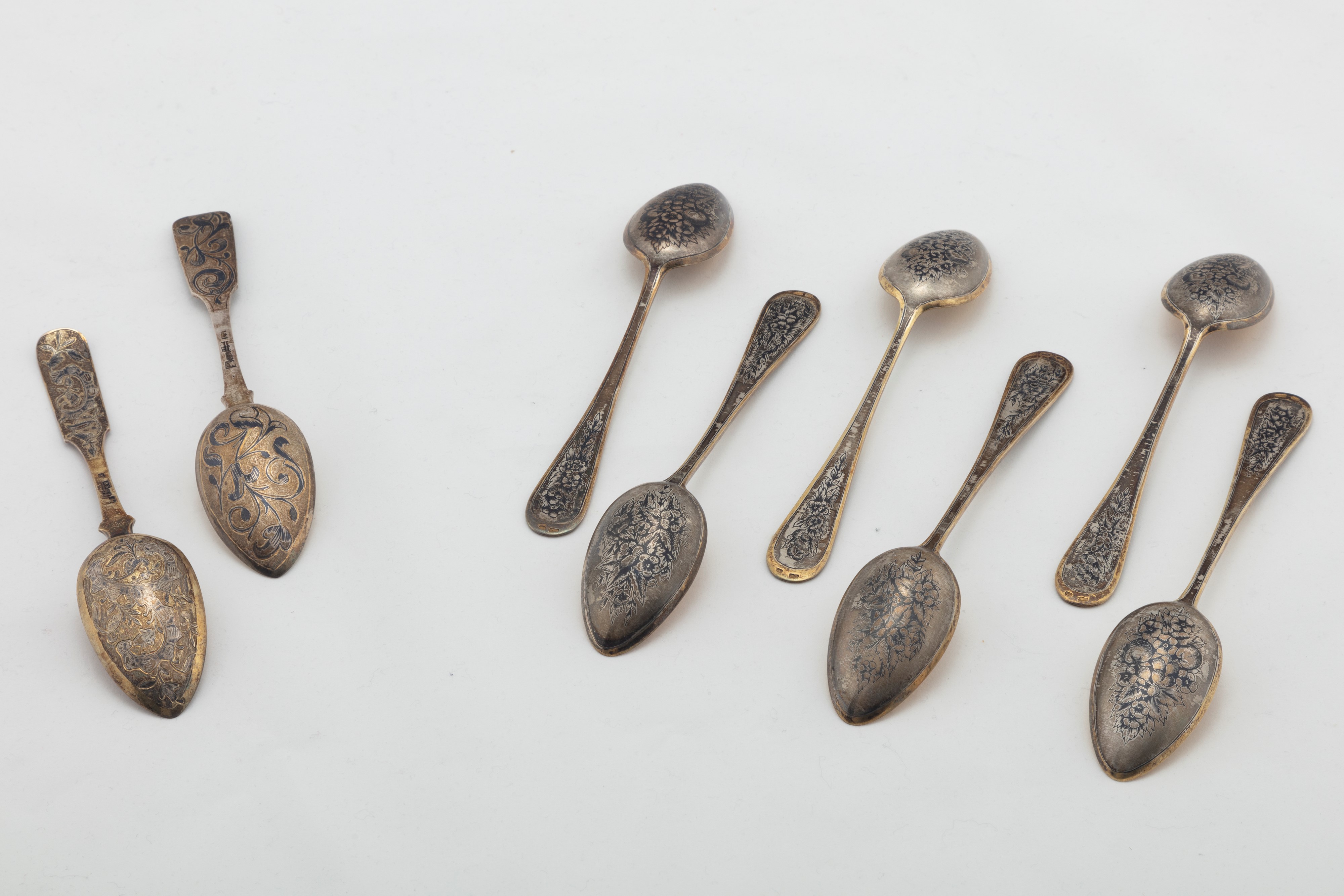 two spoons nielloed and decorated with floral motifs, hallmarks of the city of Moscow, second half of the 19th century, assayer AK 1856;