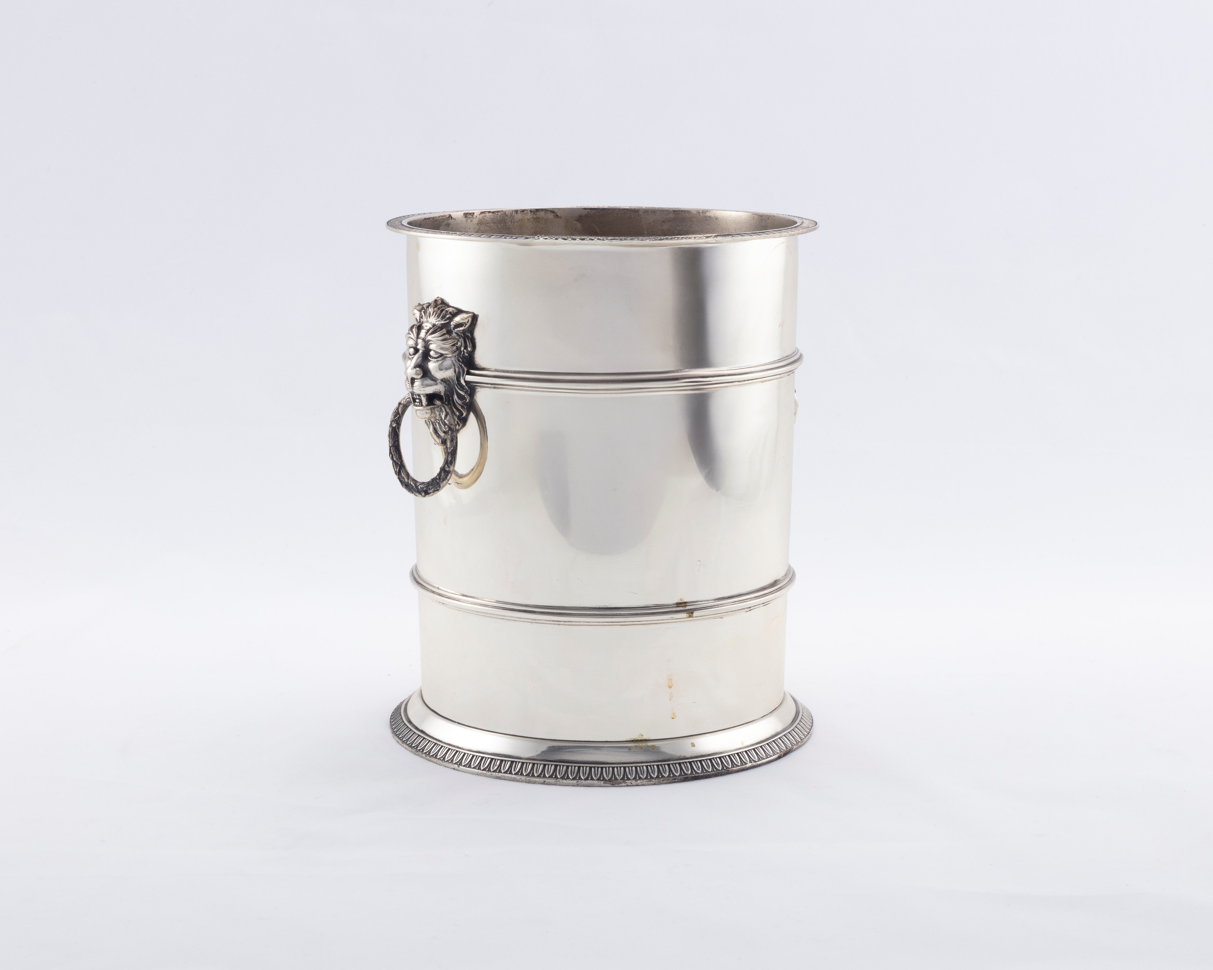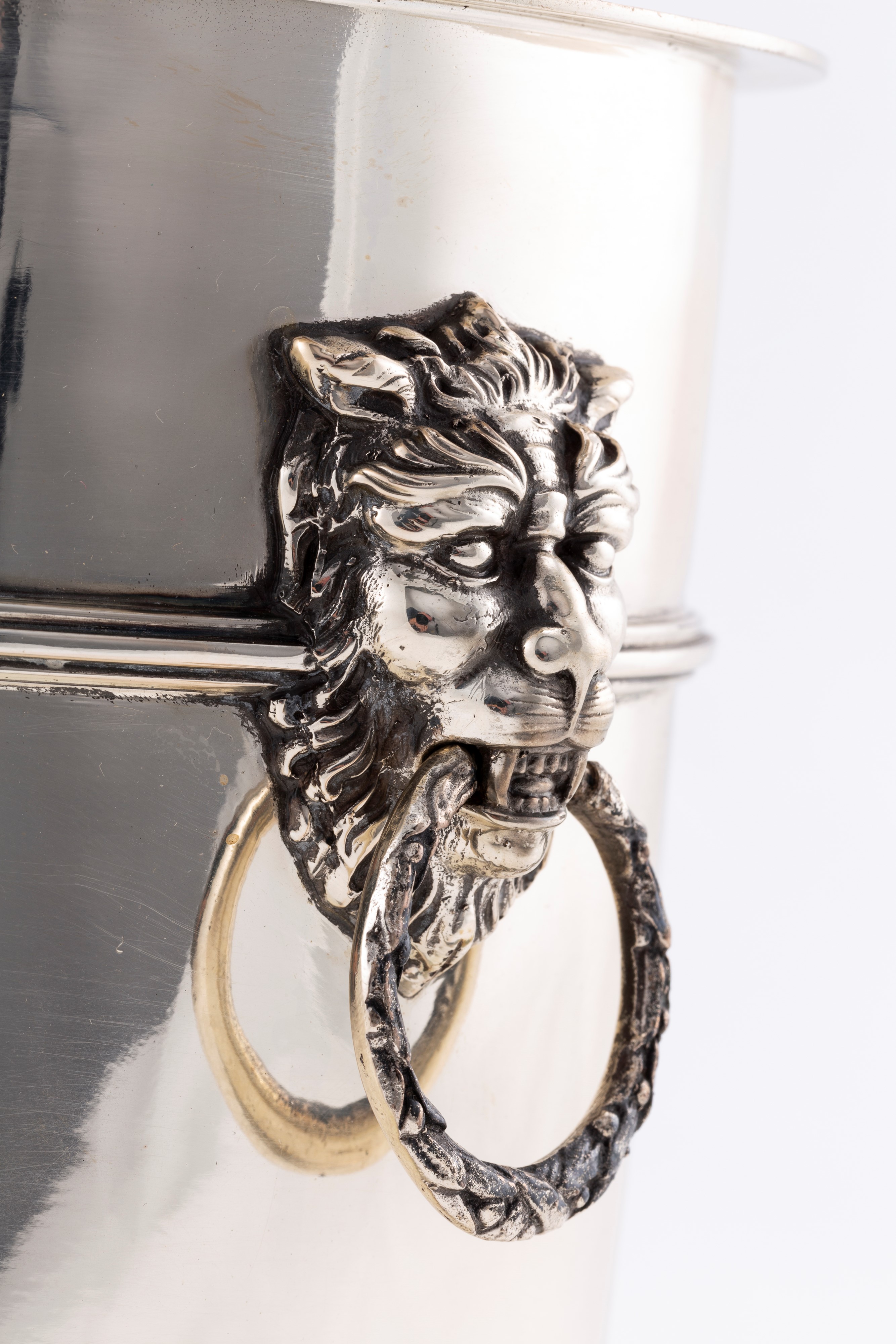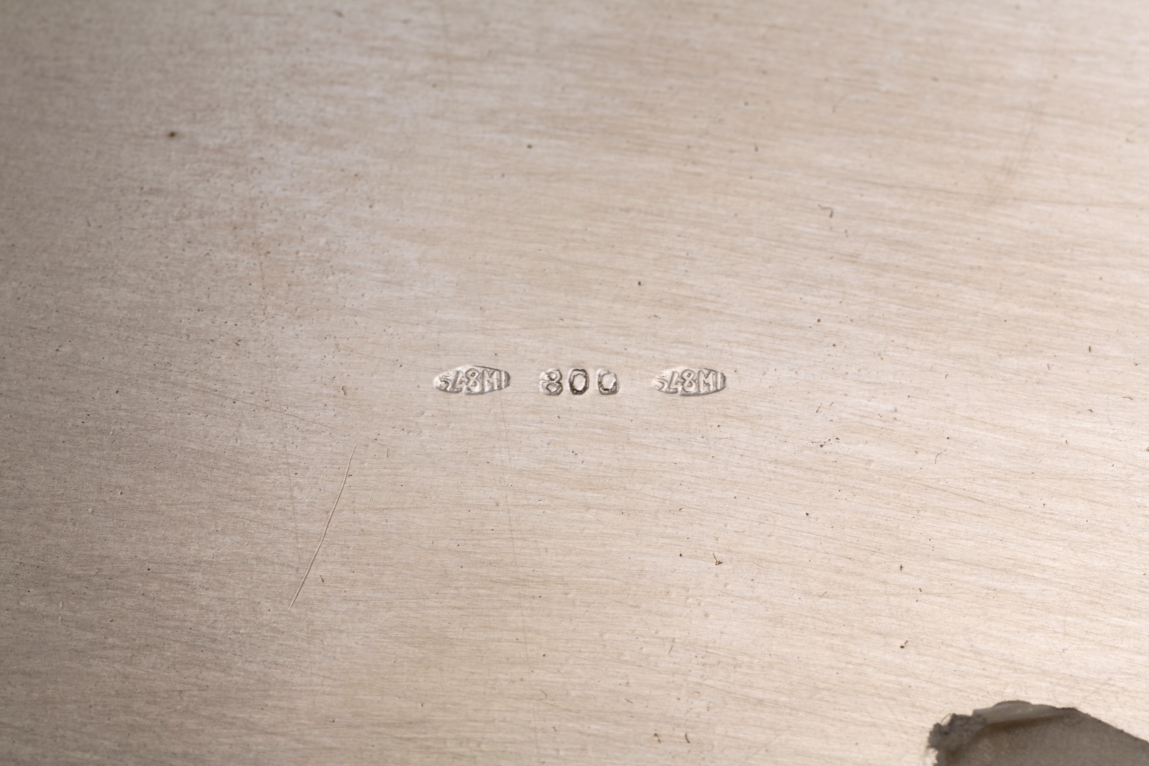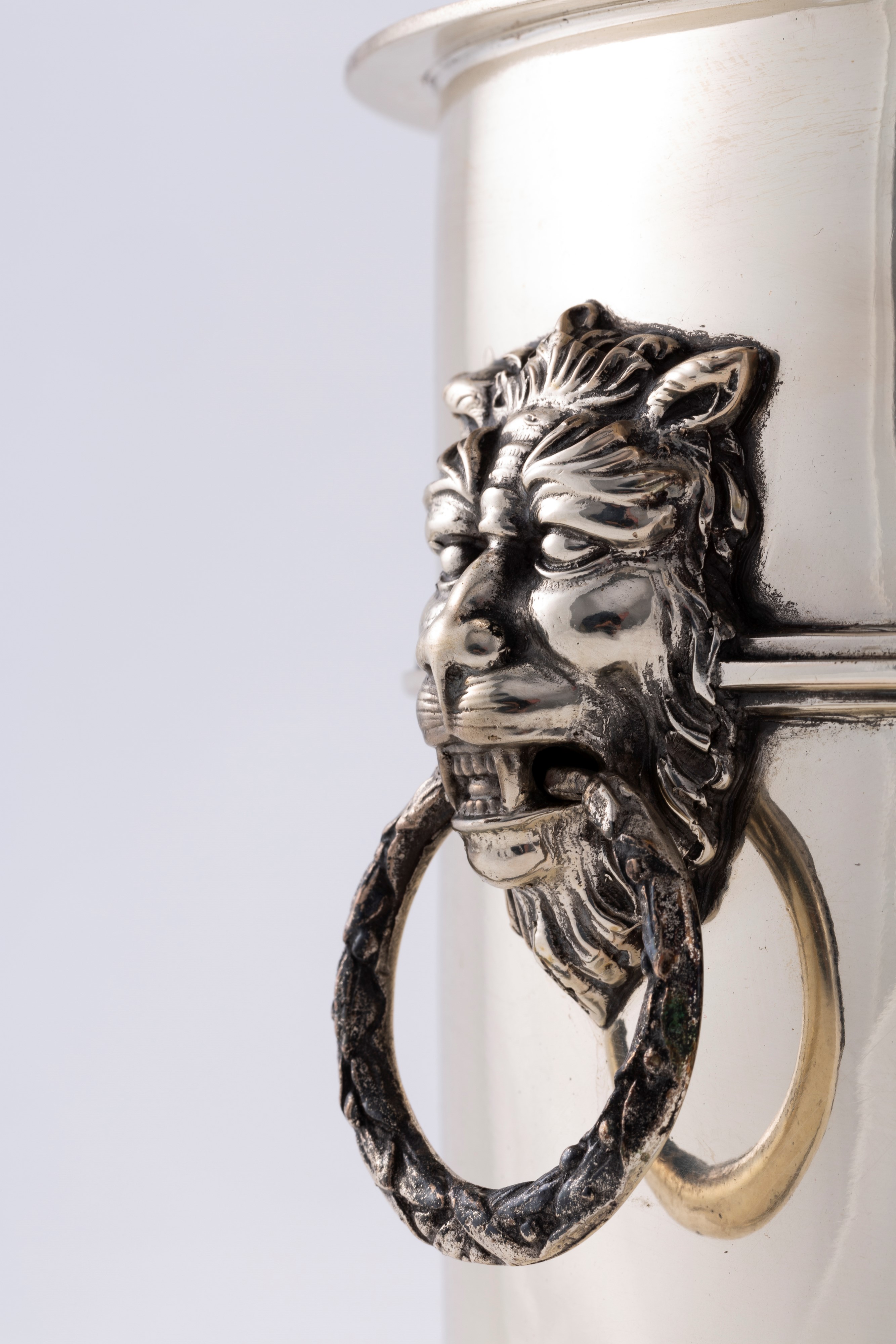 in silvercast and shaped, base and edge decorated with palmettes, handles with zoomorphic motifs with rings.