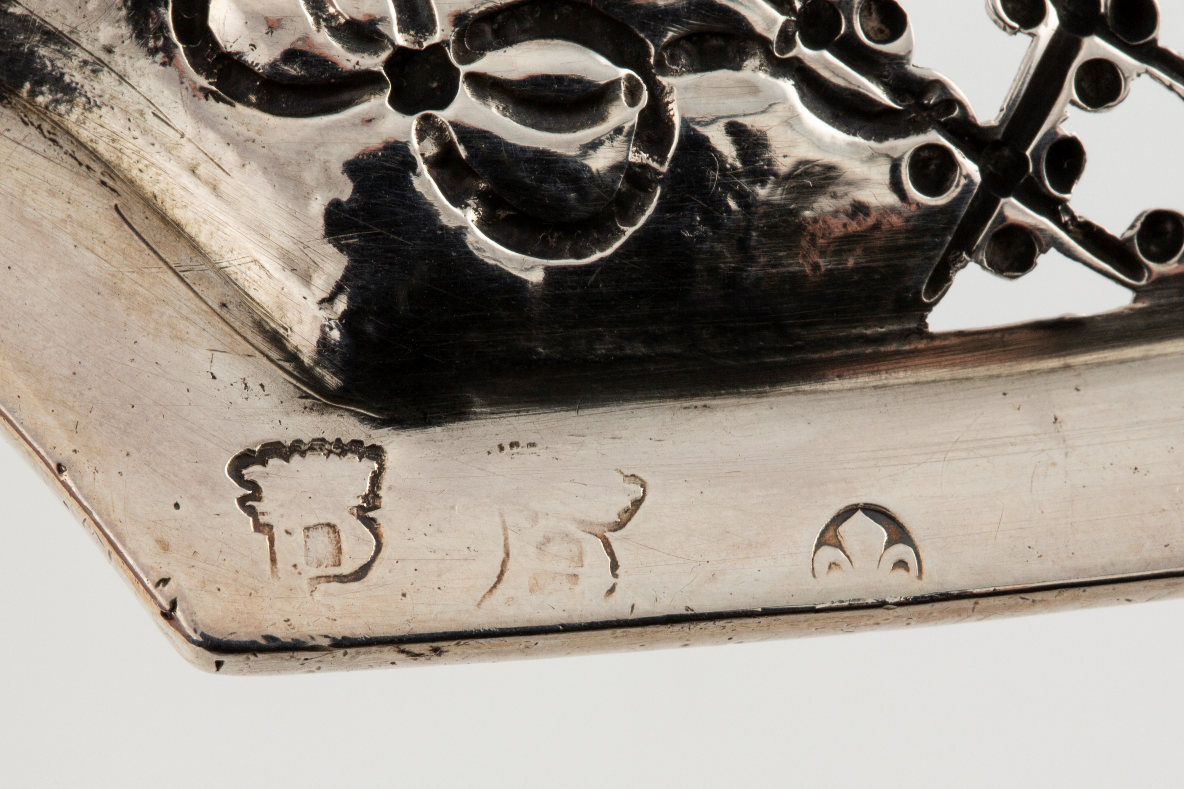 in silver and vermeilthe finely embossed plate with a convivial scene (l cm 20,00, defects); the reticulated stand with a tapered edge, engraved with bows and leaf motifs (l cm 20,50).
