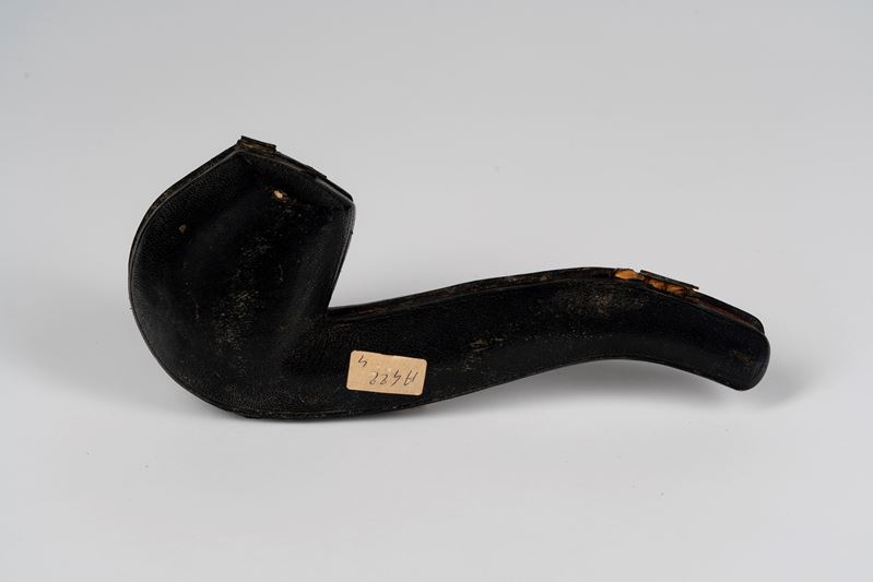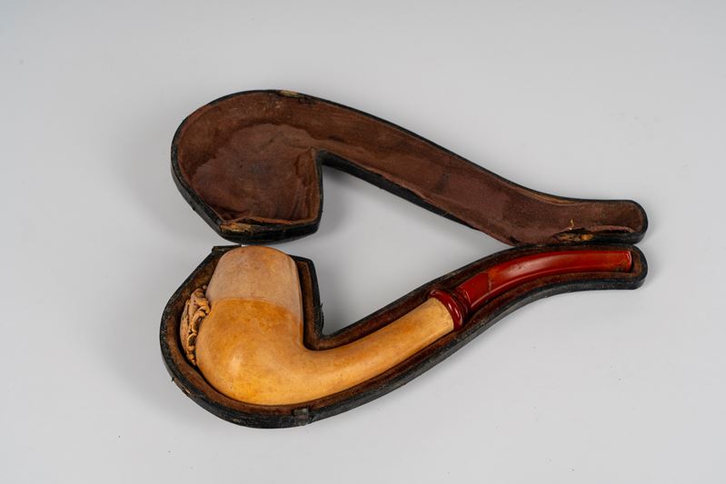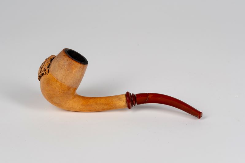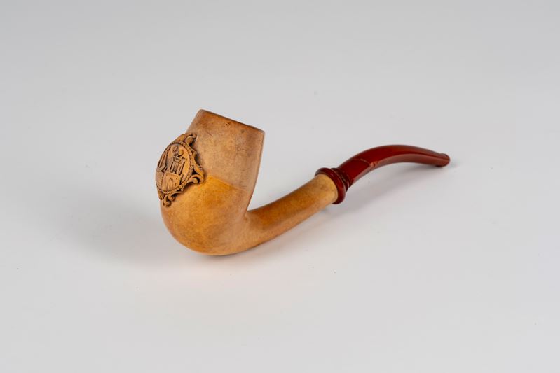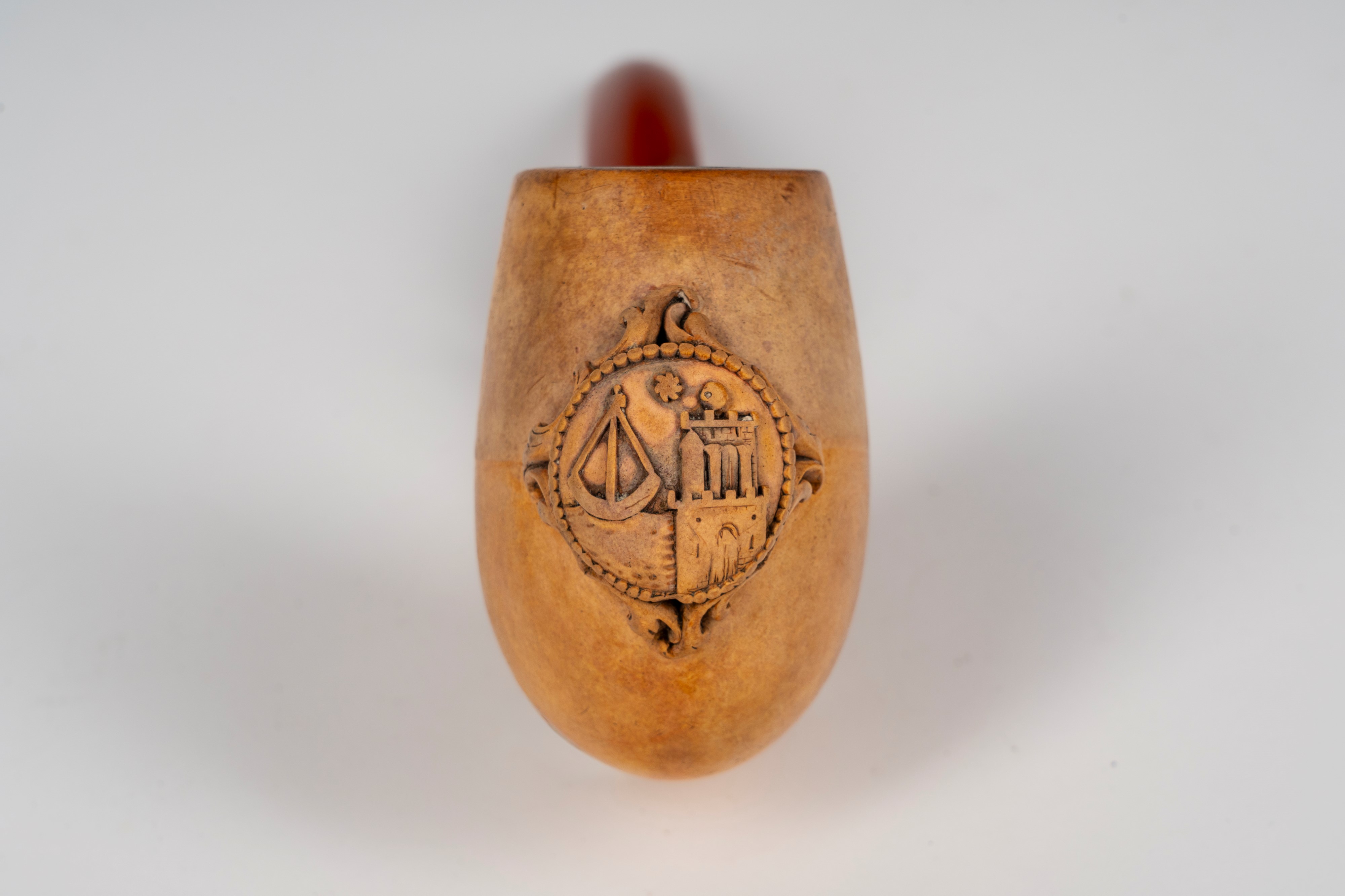 A carved meerschaum pipe decorated with a coat of arms featuring a tower and sextant. 19th century.