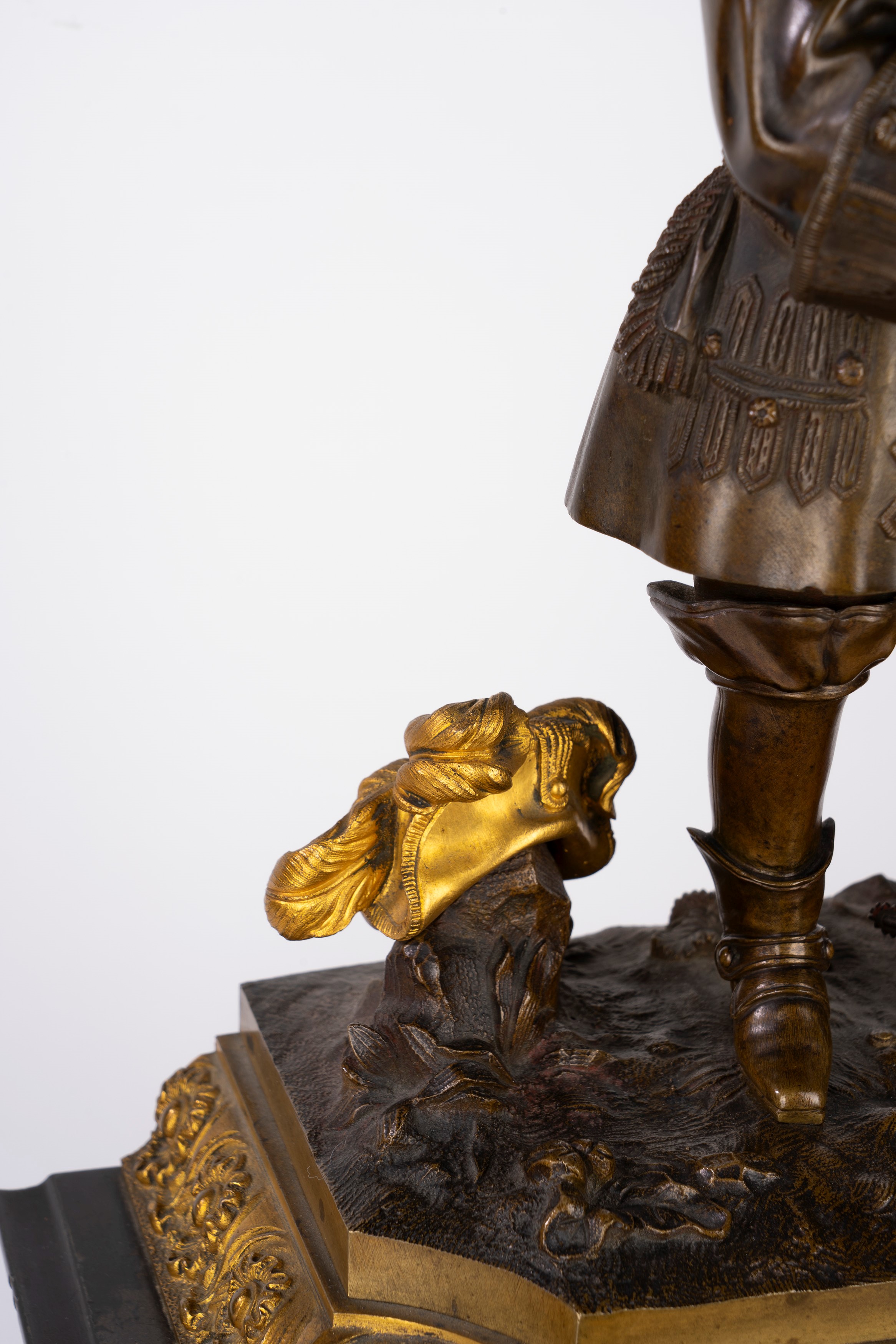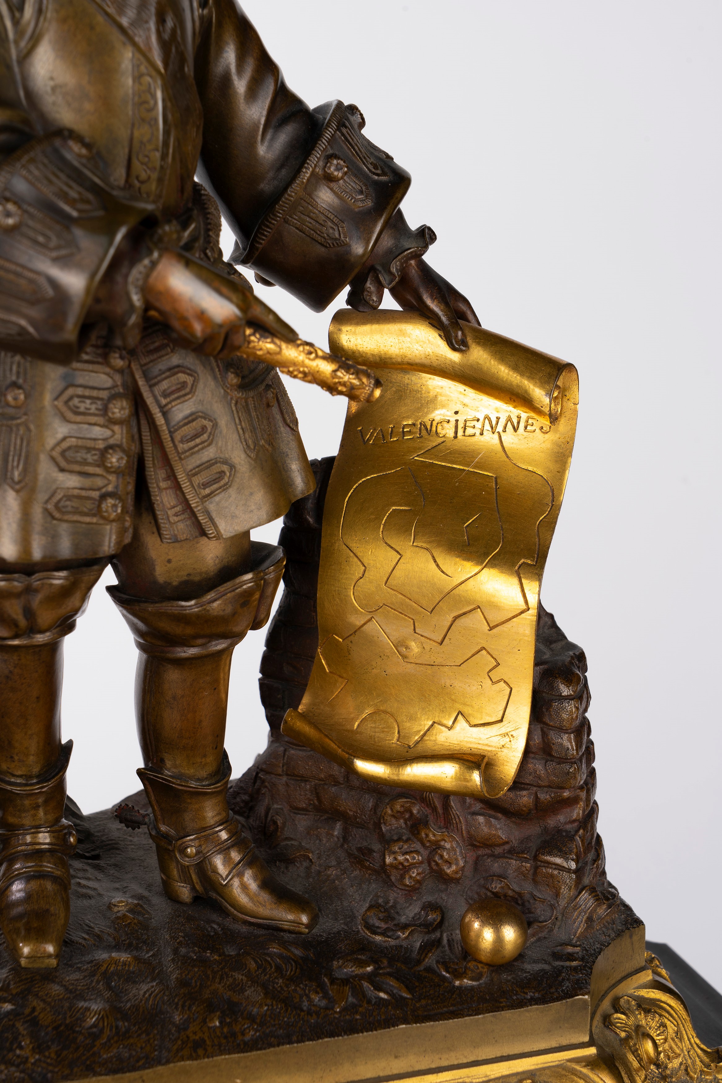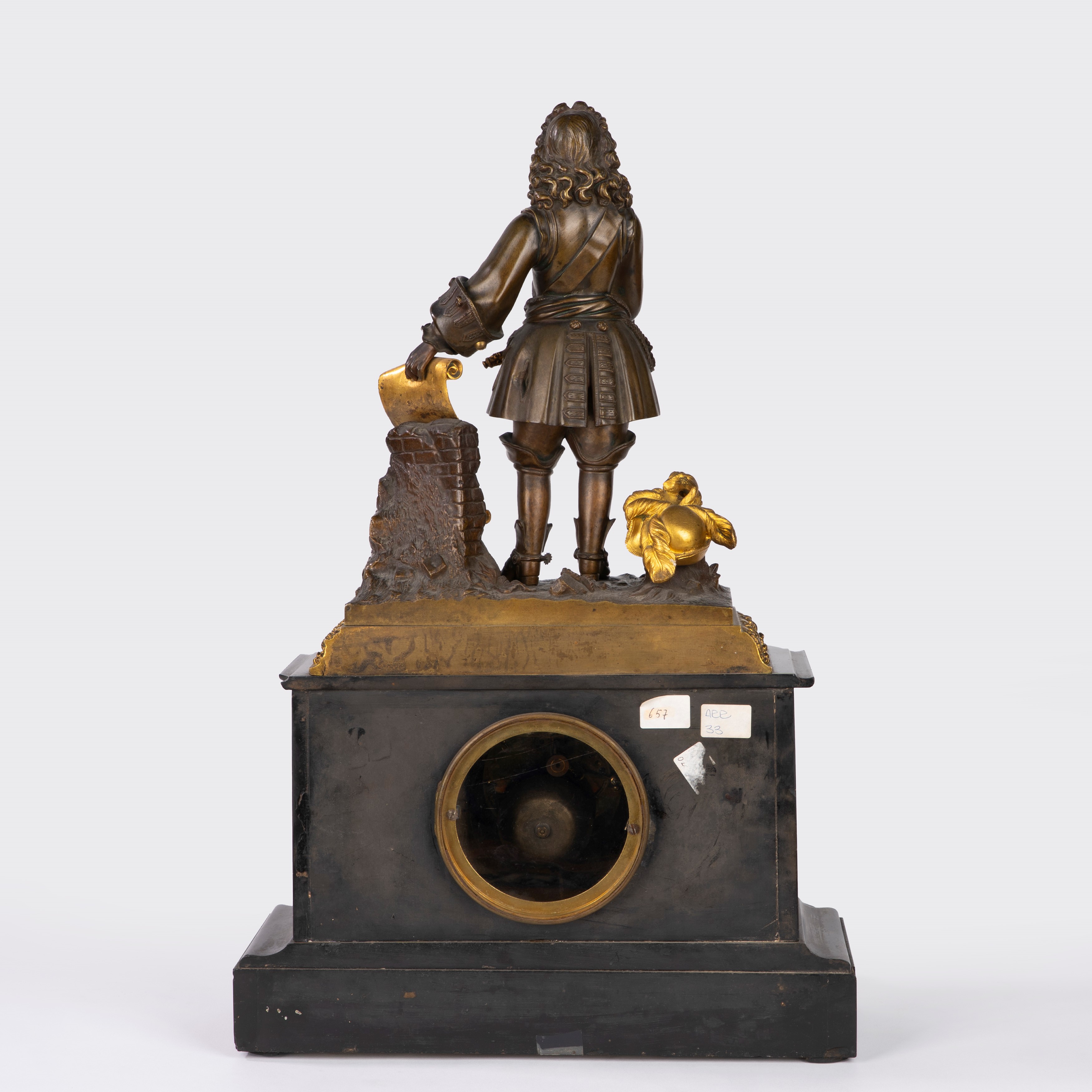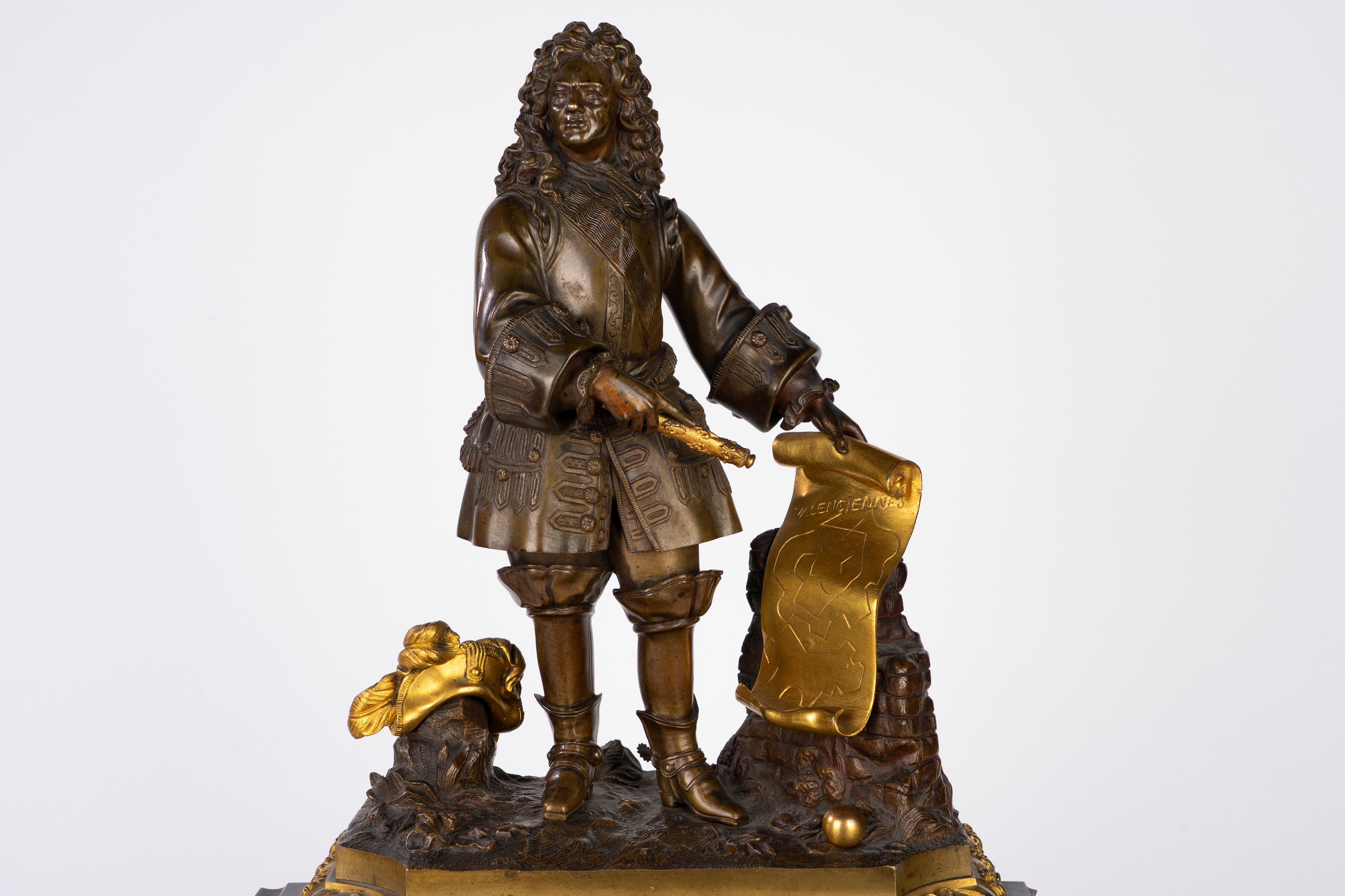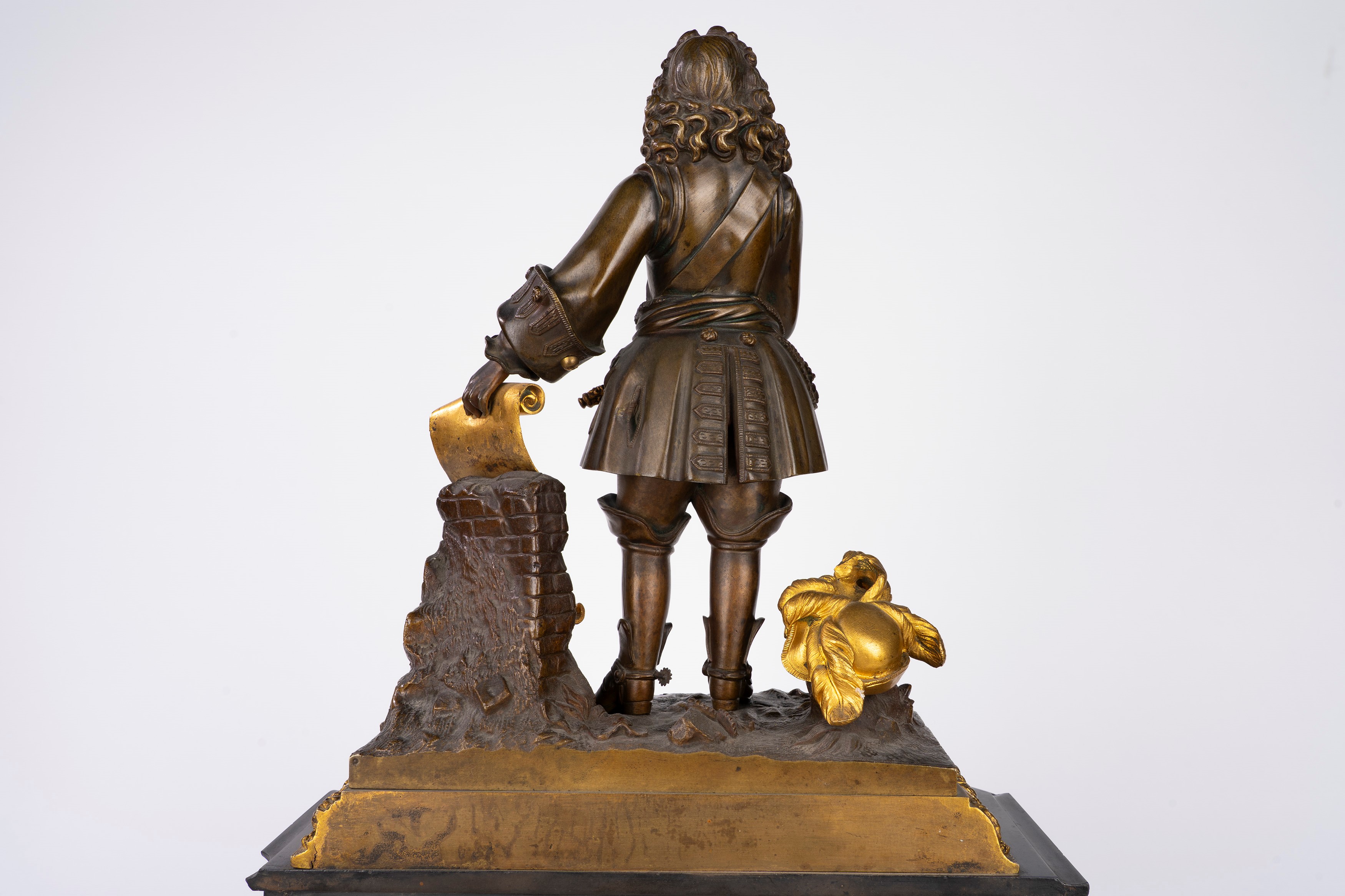 Plinth base surmounted by a gentleman with a cartouche and hat standing on a naturalistic base. White enamel dial with Roman numerals and Breguet-type hands.