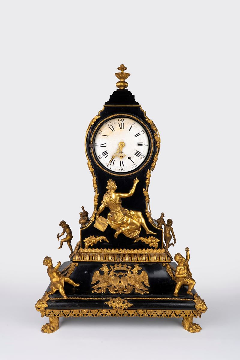 The base rests on feral feet with lion heads at the corners, adorned with cherubs in the round and a frieze on the front with two eagles with outstretched wings holding a crown. The upper part features a frieze with an allegorical female figure beneath the white enamel dial with Roman numerals for the hours and Arabic numerals for the minutes.