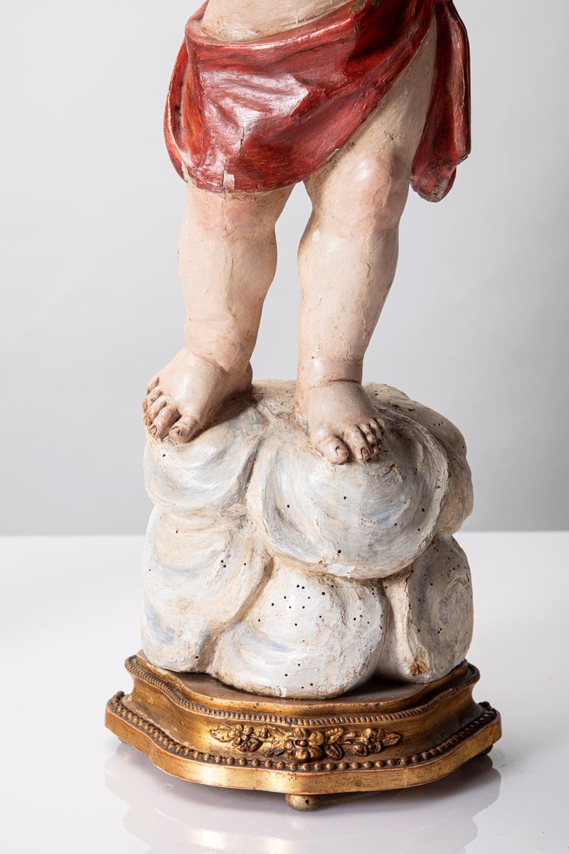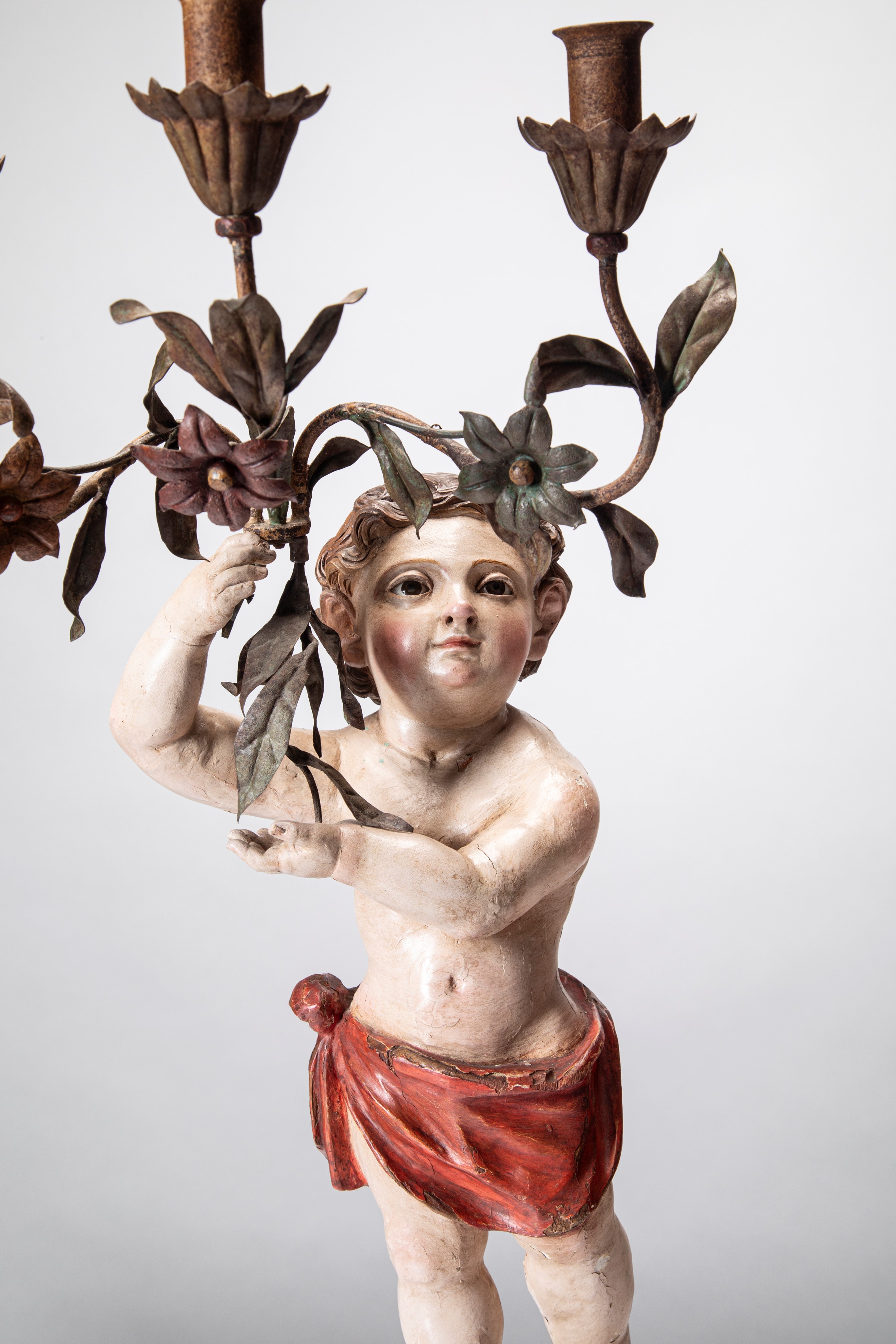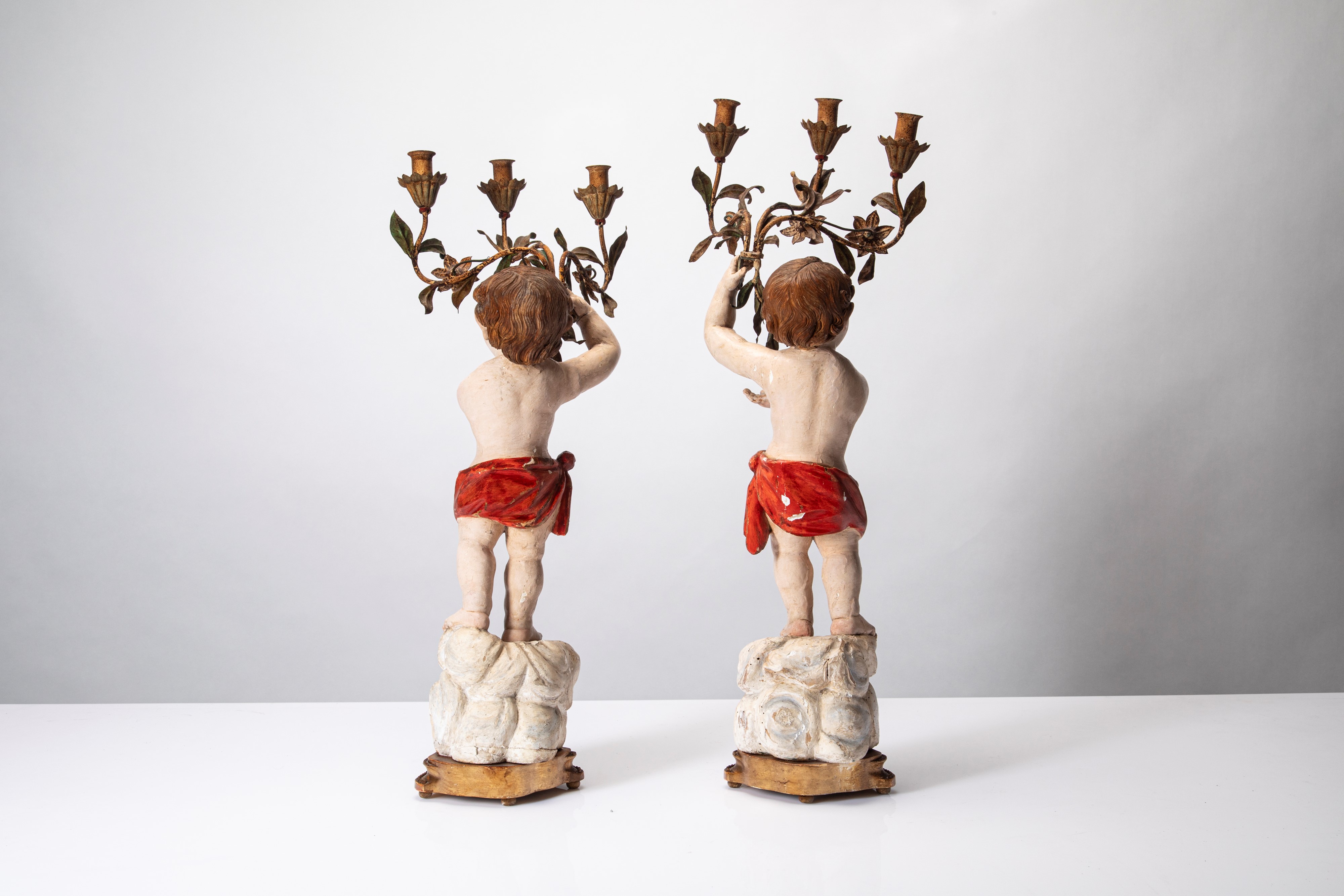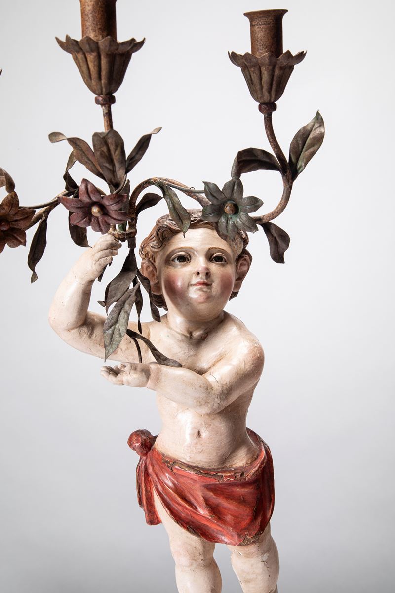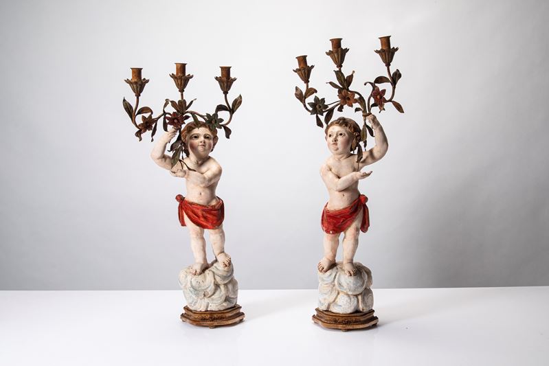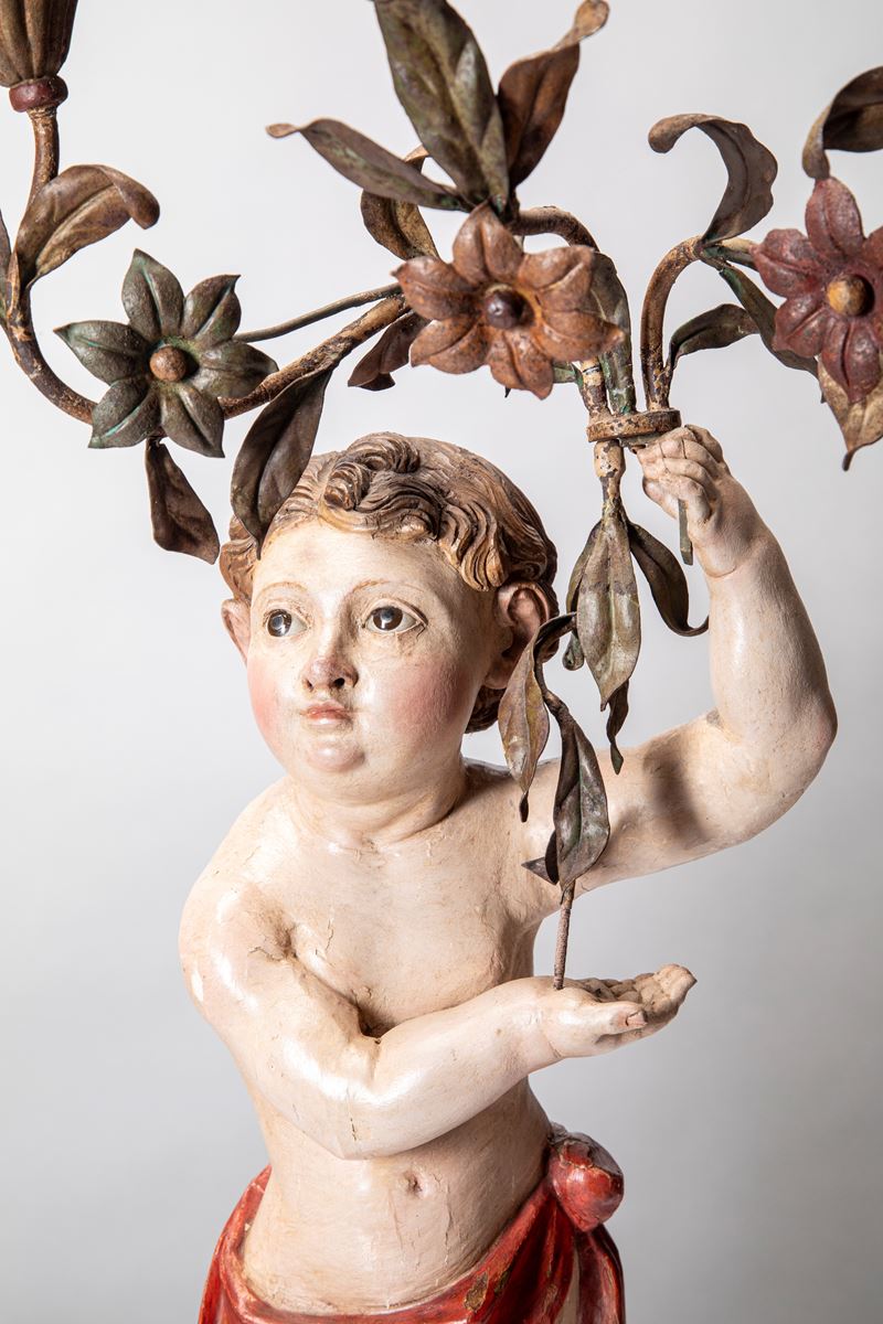 Standing on clouds, they hold three-light candelabras shaped like branches of leaves and flowers. They rest on circular gilded bases. Restorations