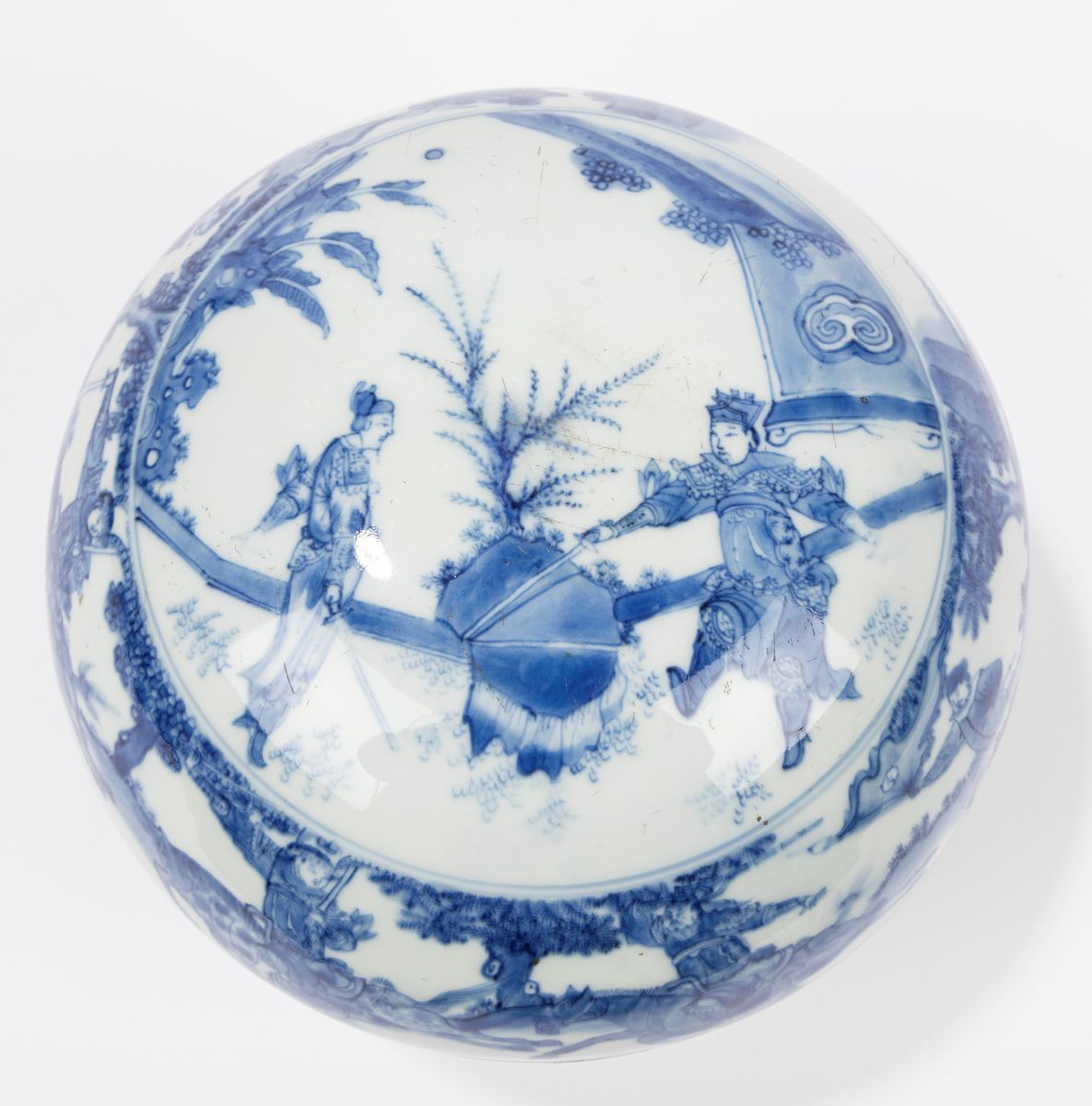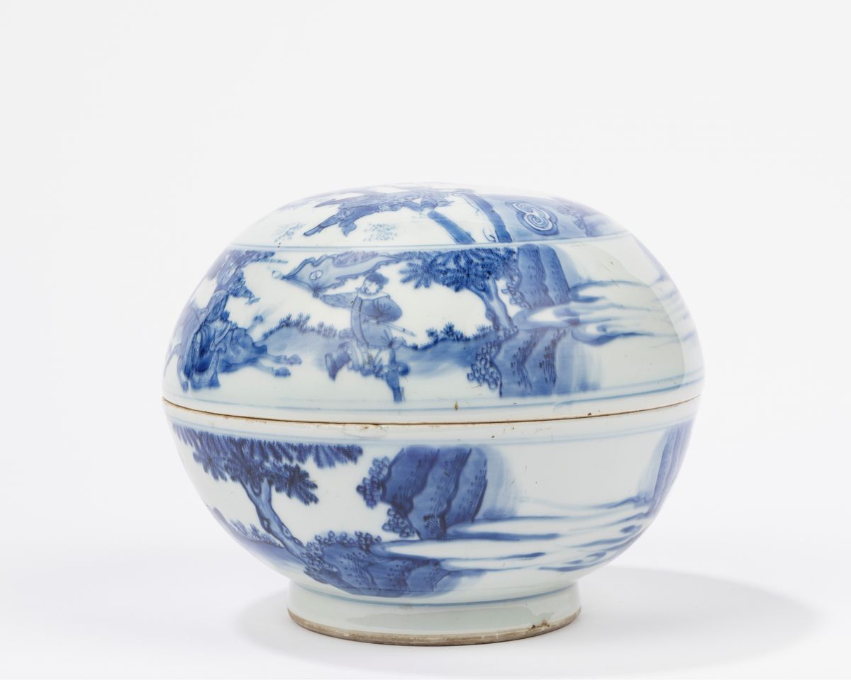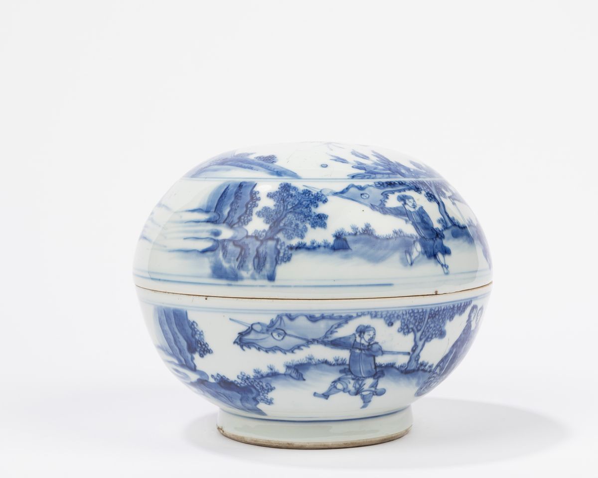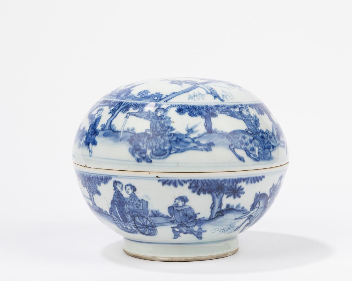 青花瓷盒。 中国,崇祯时期(1627-1644)装饰有《三国奇缘》中的场景; 成化伪标