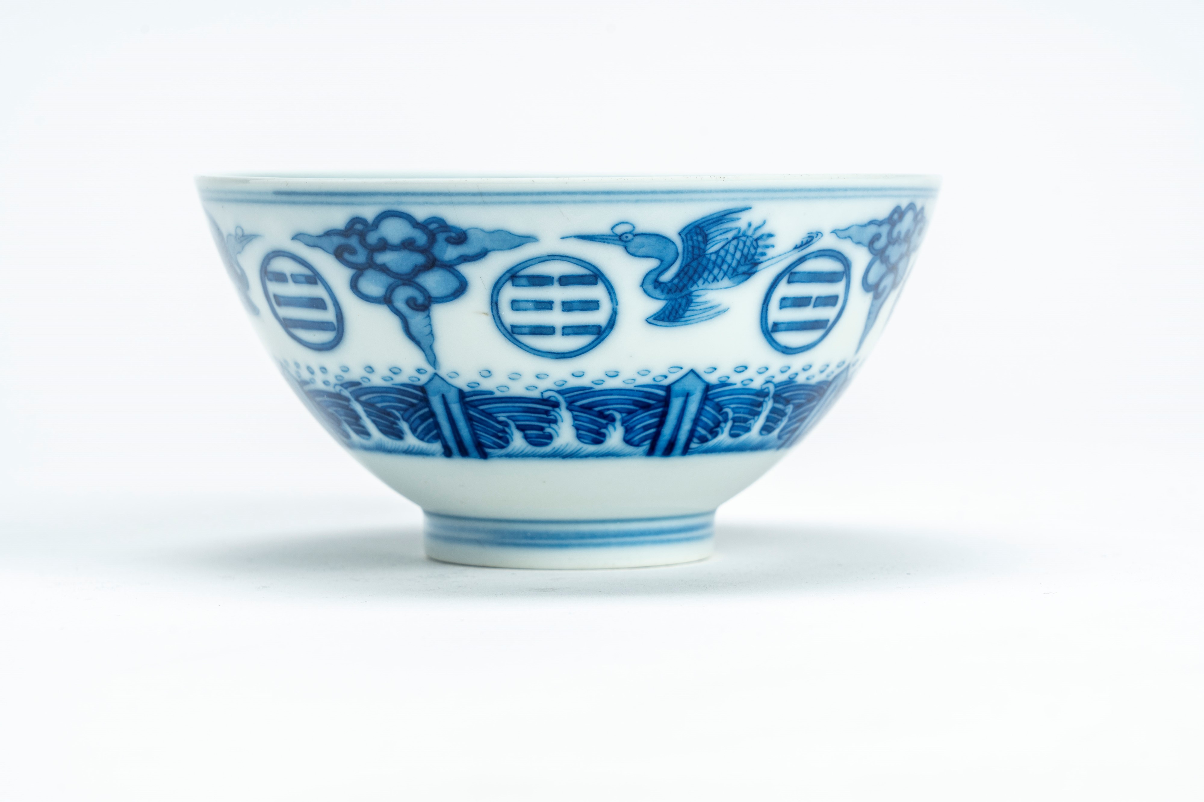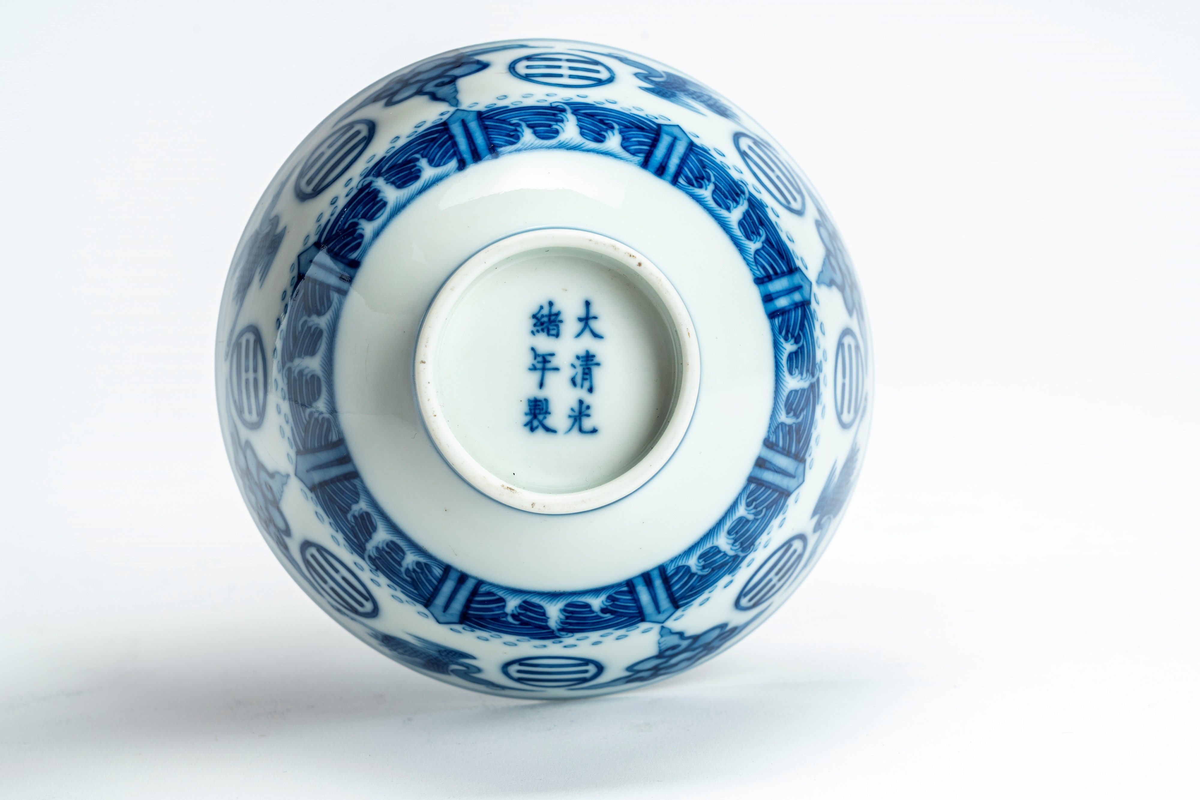 BLUE AND WHITE PORCELAIN BOWL DECORATED WITH PHOENIXES AND STYLIZED CLOUDS, BEARING APOCRYPHAL GUANGXU MARK, CHINA, 20TH CENTURY