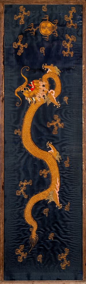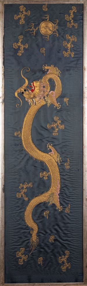 Embrodered silk panel with gold-thread dragon on blue ground with stylized clouds, China, 19th century