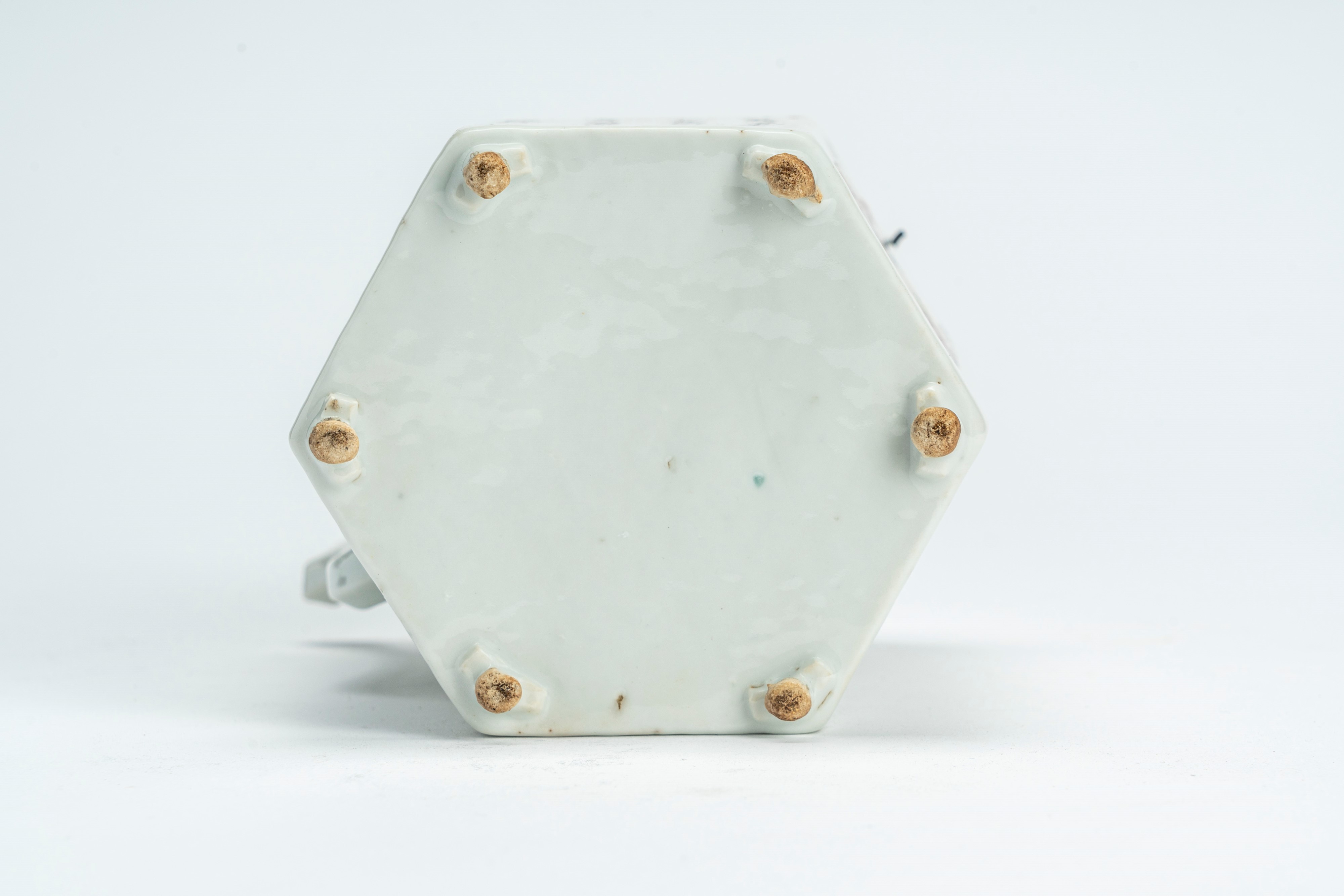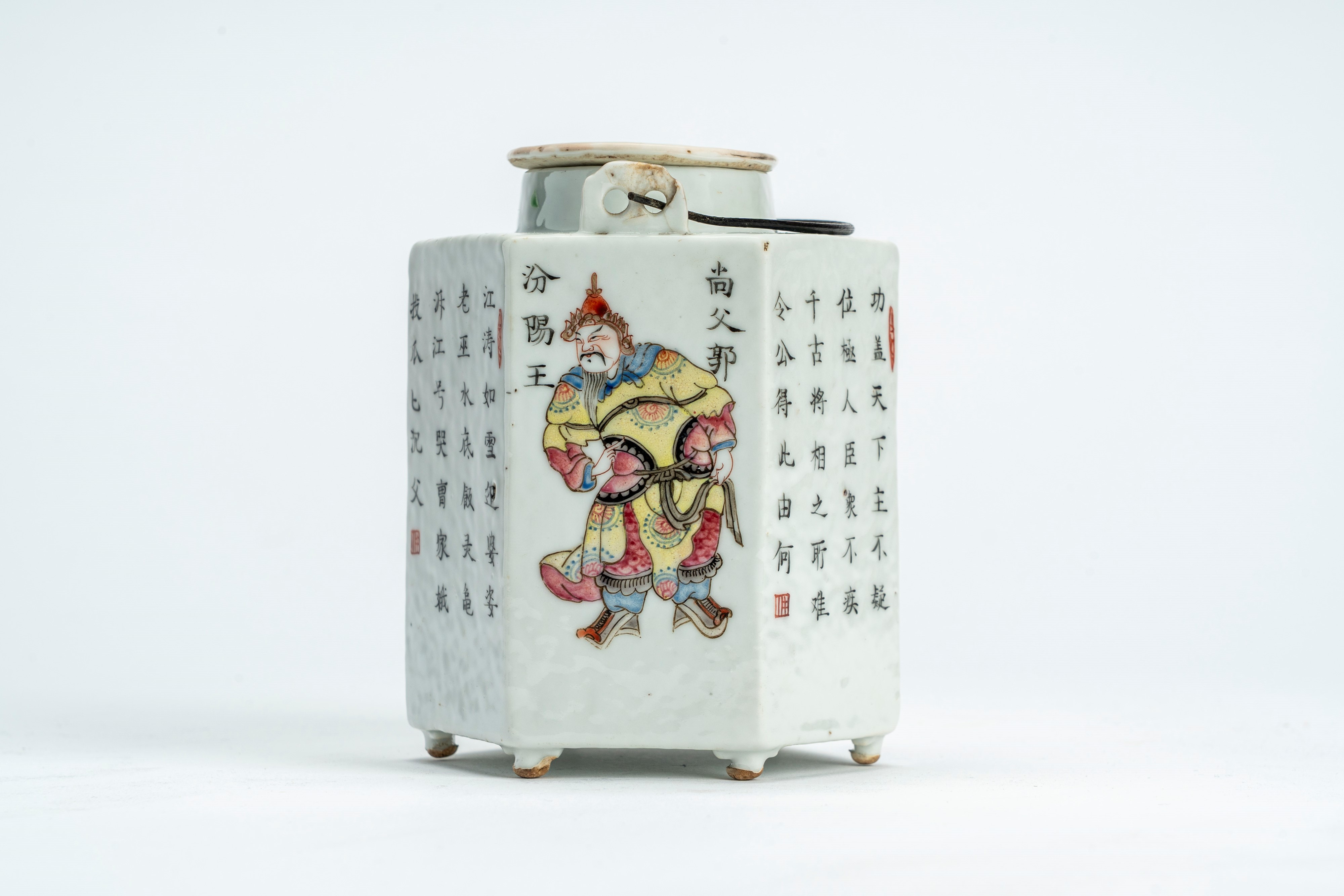 Famille rose porcelain hexagonal teapot decorated with figures and characters, China, early 20th century