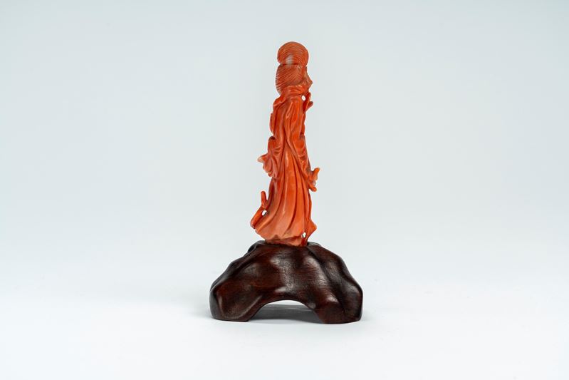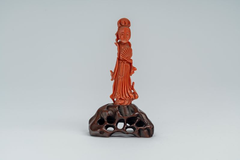 ☼ 珊瑚小雕仕女持扇,木座,中国,20世纪初