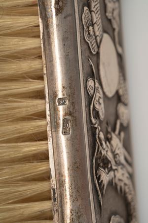 Toilet set of eight pieces in repoussé and chiseled silver with dragon and cloud motifs, China, late Qing dynasty