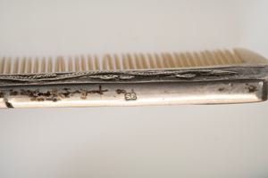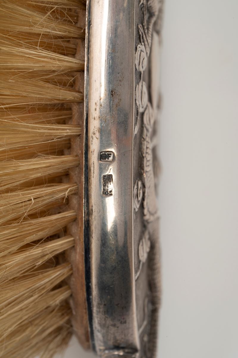 comprising eight pieces: a hand mirror, a comb, two brushes, a lidded box, a lace puller, a shoehorn and tweezers.