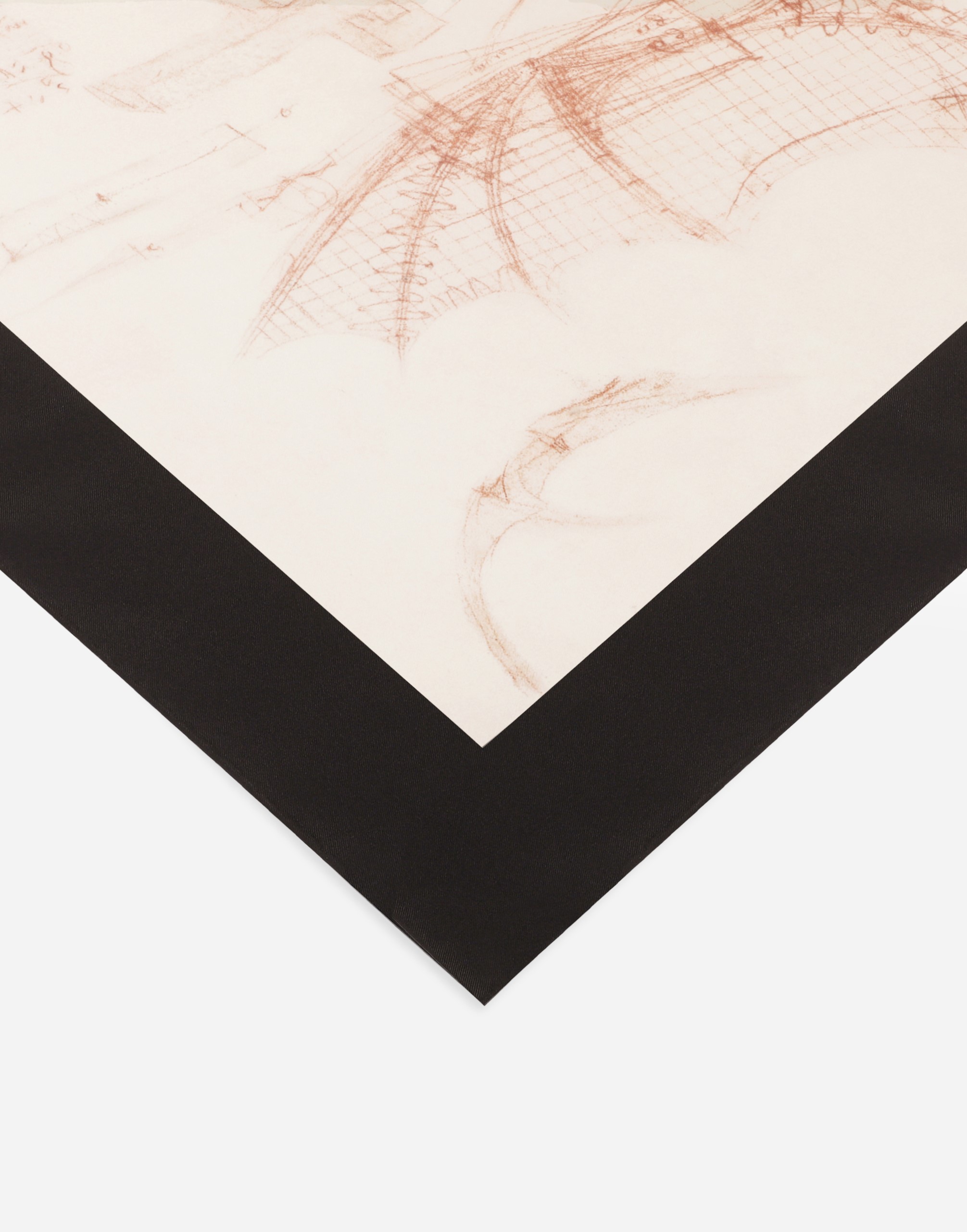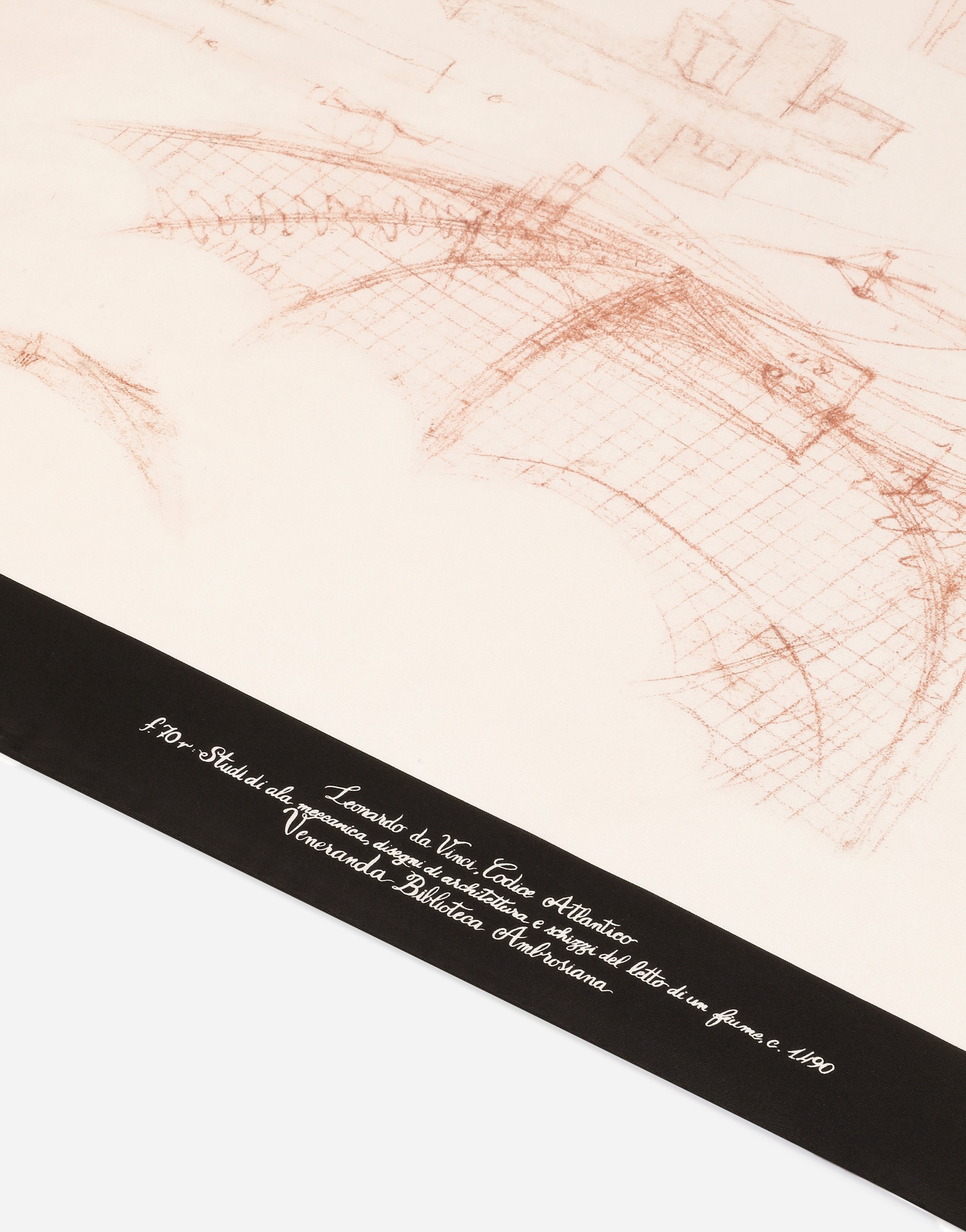 Foulard in silk twill printed with Leonardo Da Vinci’s drawings, refined with hand-rolled edge.