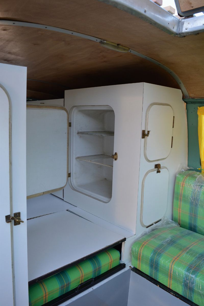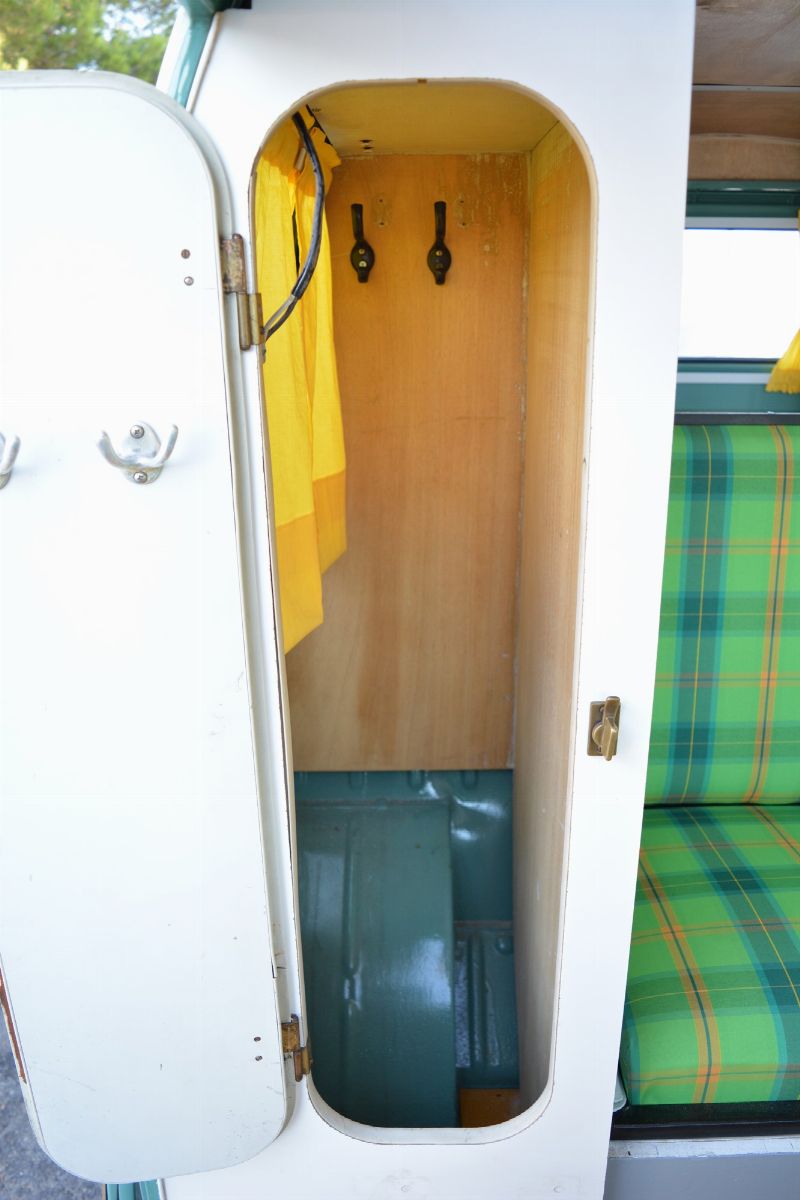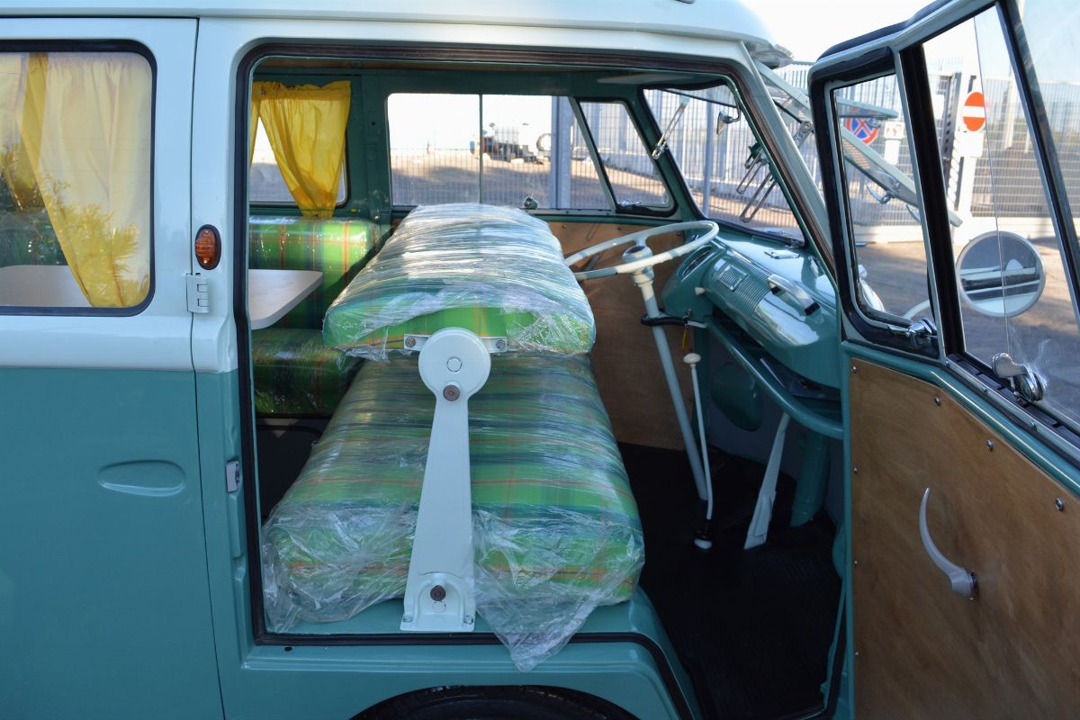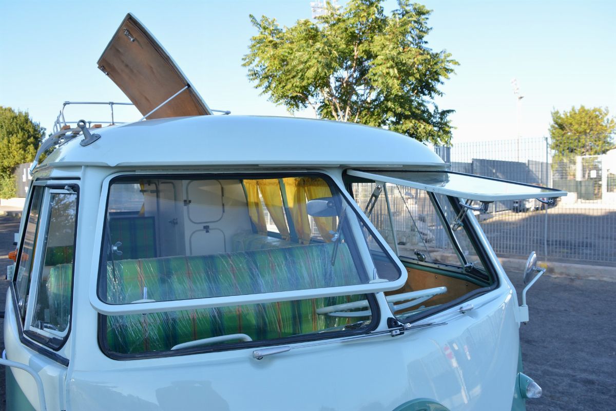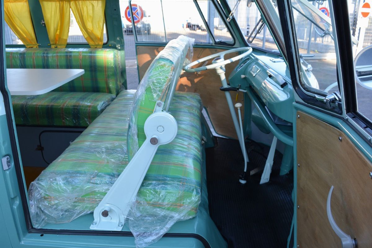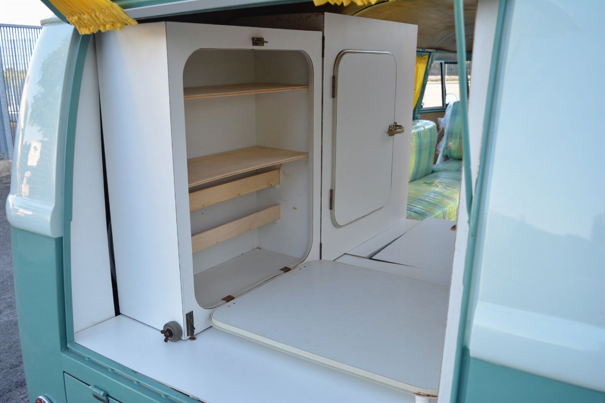 The Volkswagen Typ 2 in Westfalia camper van equipment with chassis no. 757100, is an example of 1961. Presumably the set-up is the SO34 "Westfalia camper with small roof hatch and white laminate cabinets". The vehicle has been completely restored in bodywork, mechanics and above all in the interior design which are the particularity if not the uniqueness of this vehicle. Dating back to the early Westfalian era in which all furniture and cupboards are still made of wood, they are finished in this case in white laminate. The seats are upholstered in vibrant Scottish fabric. The “double-face” front seat is characteristic: a bench that can be the driver's and passenger's seat, while on the move, and a sofa in the dinette behind, simply by folding the seat back. The small hatch on the roof anticipates the “pop-up” roofs that will make Westfalia famous. Accessories include the chromed luggage rack with wooden crossbars and side ladder and the “Safari Windows” opening windshield.