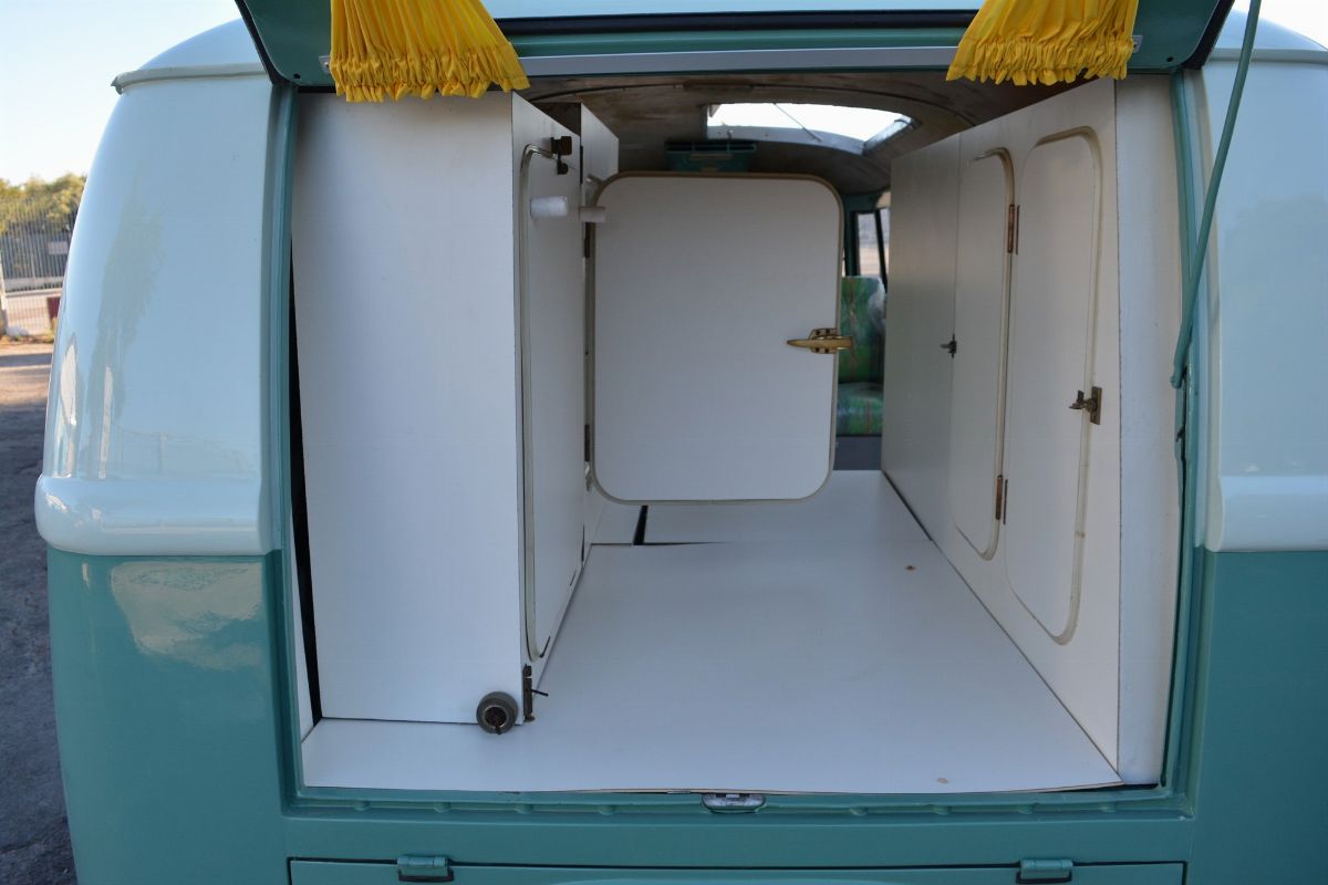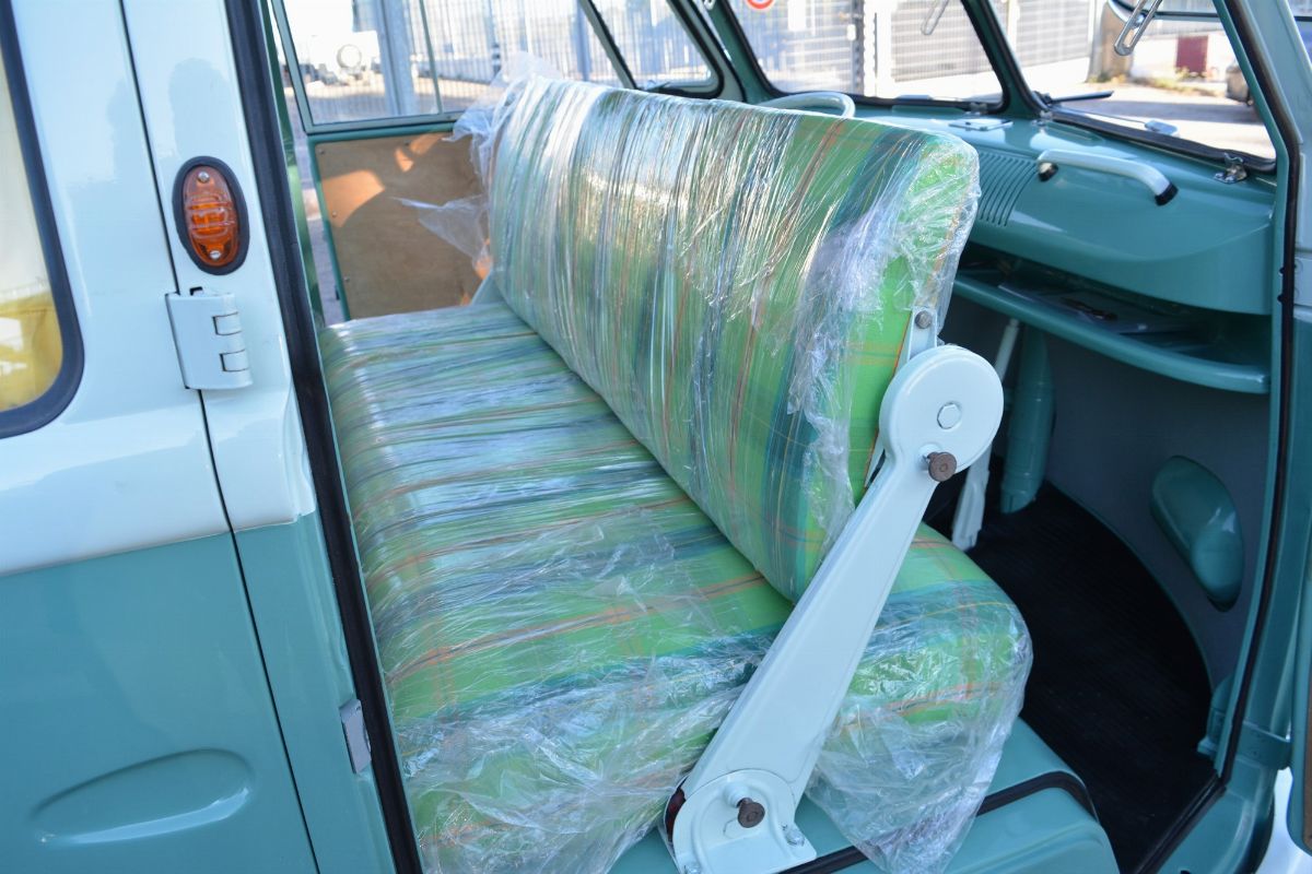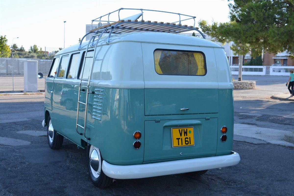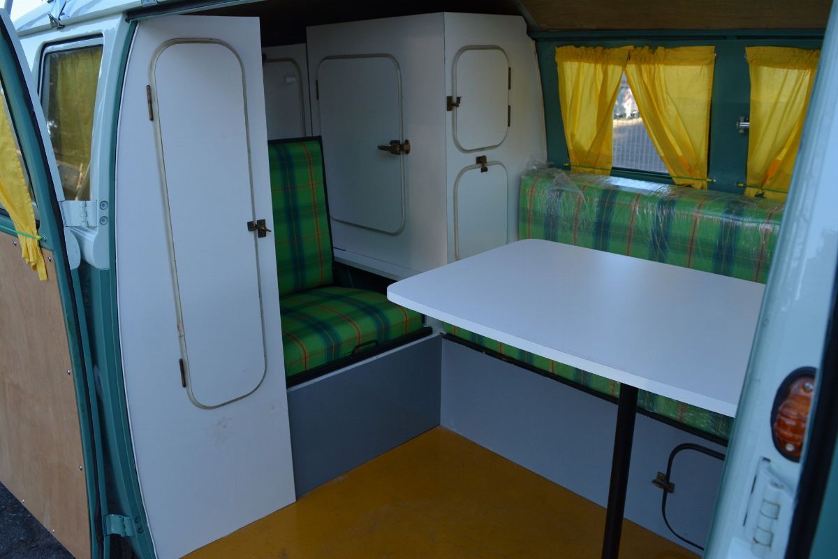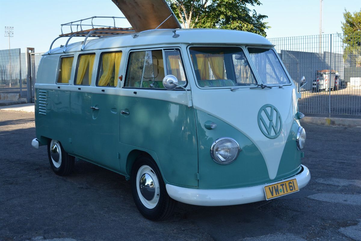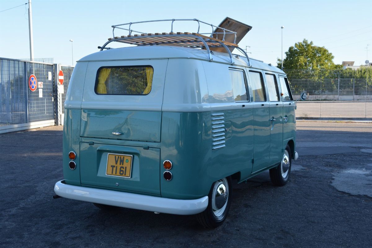 The Volkswagen Typ 2 in Westfalia camper van equipment with chassis no. 757100, is an example of 1961. Presumably the set-up is the SO34 "Westfalia camper with small roof hatch and white laminate cabinets". The vehicle has been completely restored in bodywork, mechanics and above all in the interior design which are the particularity if not the uniqueness of this vehicle. Dating back to the early Westfalian era in which all furniture and cupboards are still made of wood, they are finished in this case in white laminate. The seats are upholstered in vibrant Scottish fabric. The “double-face” front seat is characteristic: a bench that can be the driver's and passenger's seat, while on the move, and a sofa in the dinette behind, simply by folding the seat back. The small hatch on the roof anticipates the “pop-up” roofs that will make Westfalia famous. Accessories include the chromed luggage rack with wooden crossbars and side ladder and the “Safari Windows” opening windshield.