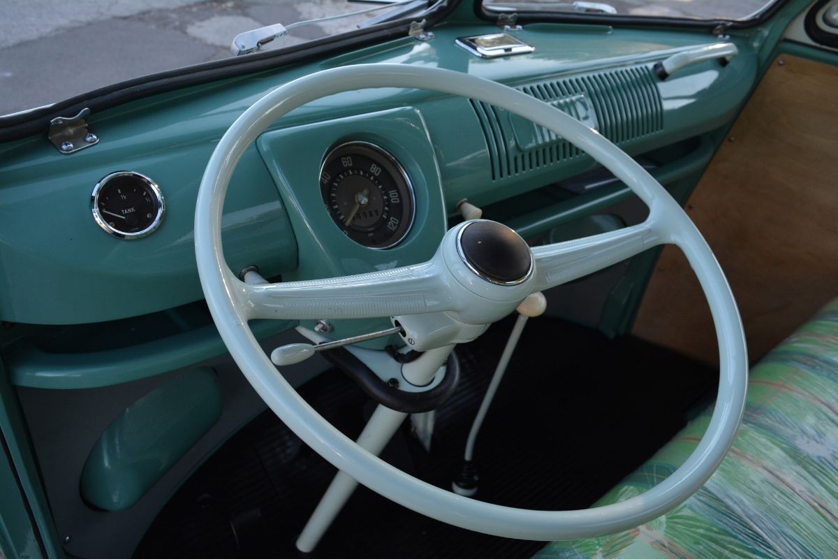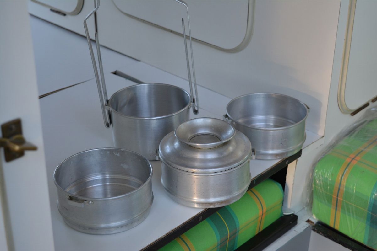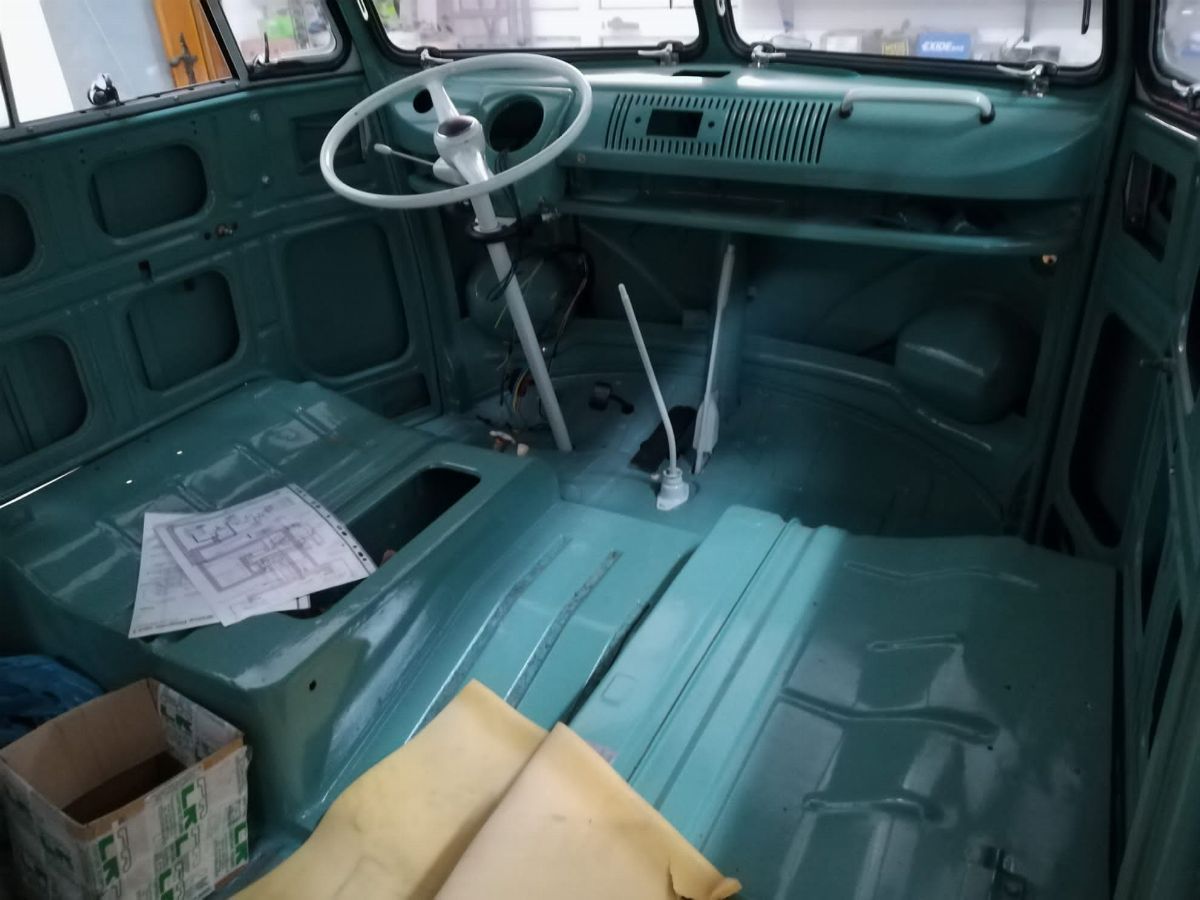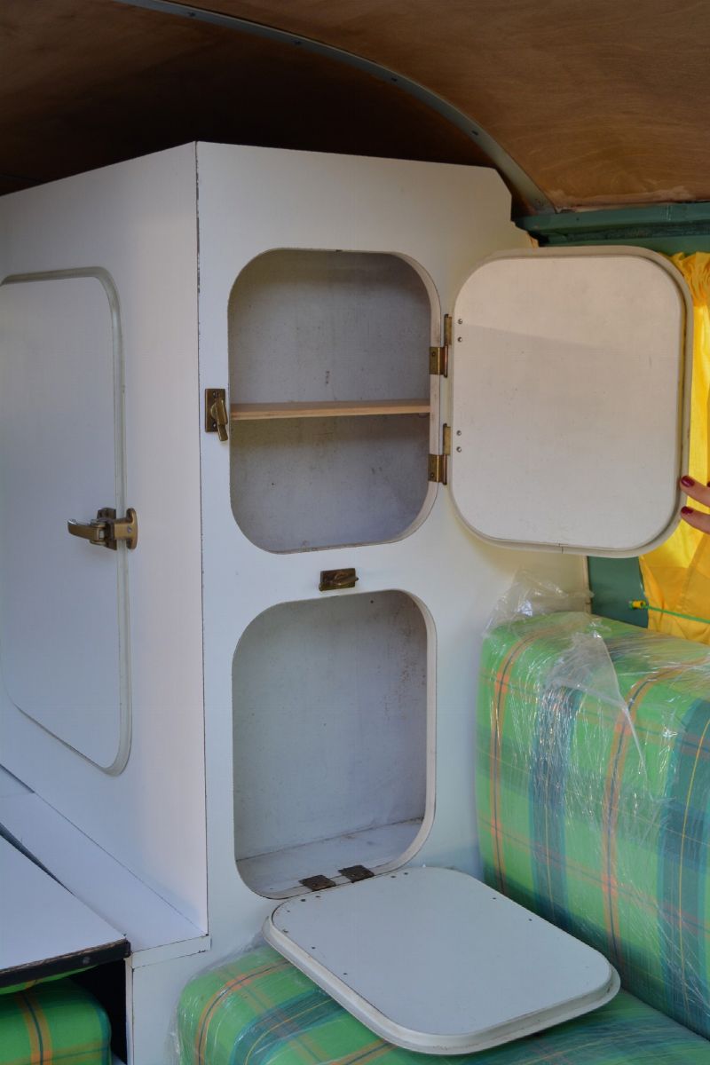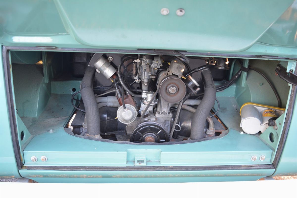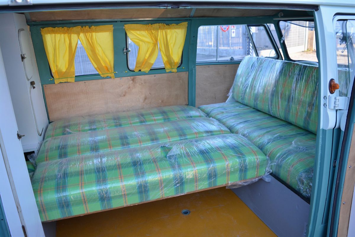 The Volkswagen Typ 2 in Westfalia camper van equipment with chassis no. 757100, is an example of 1961. Presumably the set-up is the SO34 "Westfalia camper with small roof hatch and white laminate cabinets". The vehicle has been completely restored in bodywork, mechanics and above all in the interior design which are the particularity if not the uniqueness of this vehicle. Dating back to the early Westfalian era in which all furniture and cupboards are still made of wood, they are finished in this case in white laminate. The seats are upholstered in vibrant Scottish fabric. The “double-face” front seat is characteristic: a bench that can be the driver's and passenger's seat, while on the move, and a sofa in the dinette behind, simply by folding the seat back. The small hatch on the roof anticipates the “pop-up” roofs that will make Westfalia famous. Accessories include the chromed luggage rack with wooden crossbars and side ladder and the “Safari Windows” opening windshield.