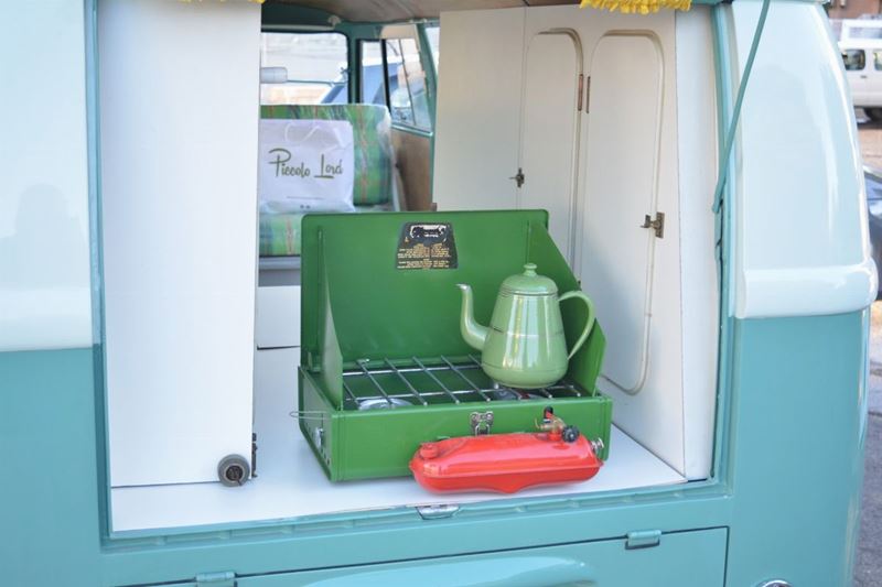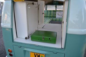 Il Volkswagen Typ 2 in allestimento camper Westfalia con telaio no. 757100, è un esemplare del 1961. Presumibilmente l’allestimento è lo SO34 “Camper Westfalia con piccola botola sul tetto e armadietti in laminato bianco”. Il veicolo è stato completamente restaurato di carrozzeria, meccanica e soprattutto nell’allestimento degli interni che sono la particolarità se non l’unicità di questo mezzo. Risalente alla prima era Westfalia in cui tutti i mobili e le armadiature sono realizzate ancora in legno, sono rifiniti in questo caso in laminato bianco. I sedili sono rivestiti nel vivace tessuto scozzese. Caratteristico il sedile anteriore “double-face”: una panchetta che può essere sedile di guida e passeggero, in marcia, e divanetto nella dinette alle spalle, semplicemente ribaltando lo schienale del sedile. La piccola botola sul tetto anticipa i tetti “pop-up” che renderanno famosa Westfalia. Accessori il portapacchi cromato con traverse in legno e scaletta laterale e il parabrezza apribile “Safari Windows”.