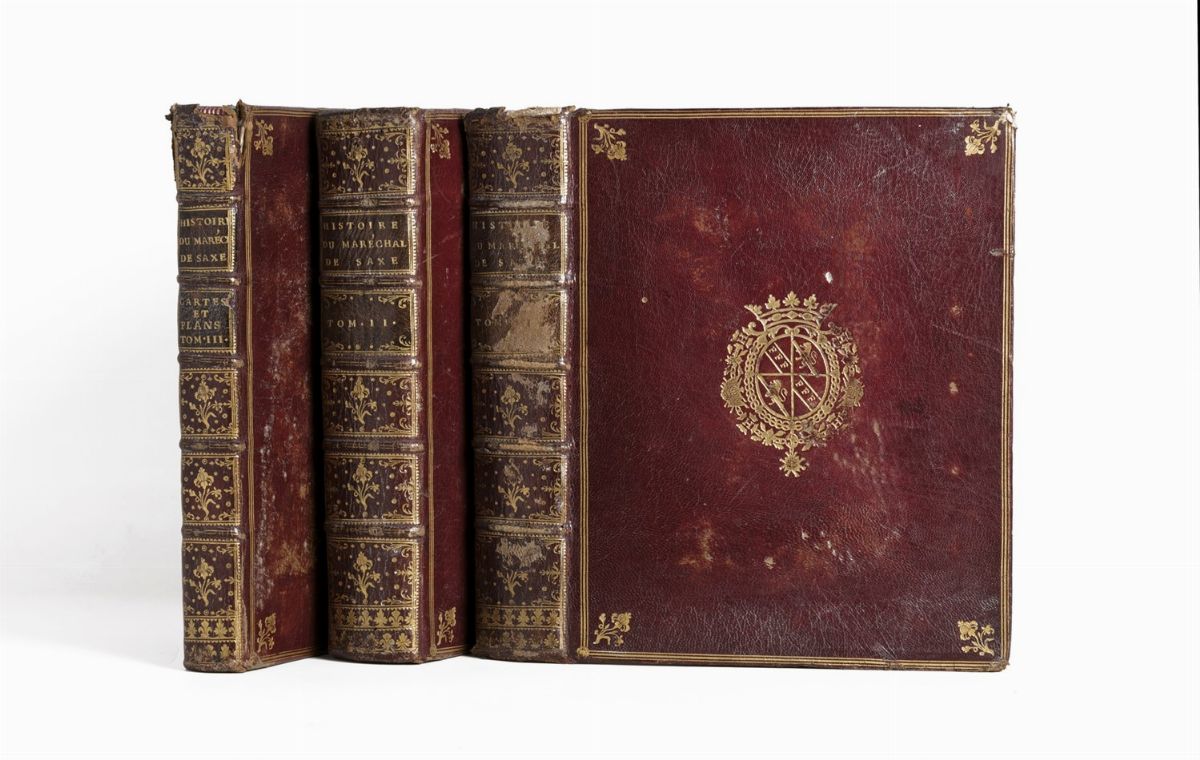 Parigi, de l'imprimerie de Philippe-Denys Pierres, 1775. In 4° grande, 300 x 240 mm. 3 voll. Ritratto in antiporta del I volume, inciso da Petit su disegno di Rigaud, testate, finalini e capilettera calcografici, al III volume tavole ripiegate raffiguranti piante di città anche a volo d'uccello, splendide legature in marocchino rosso con ai piatti cornice di triplici filetti in oro e fleurons agli angoli, al centro campeggia arma nobiliare di un Duca con al centro leoni rampanti e lettere F ripetute, dorso a 5 nervi con comparti decorati in oro, unghiatura, tagli dorati, spellature, difetti e mancanze.