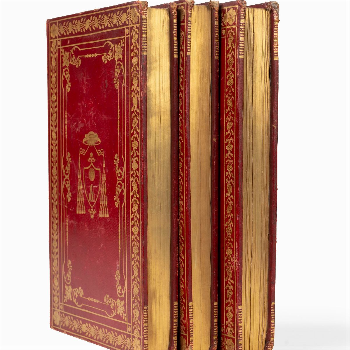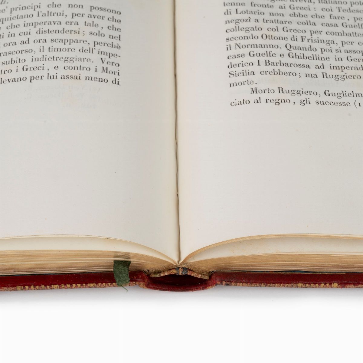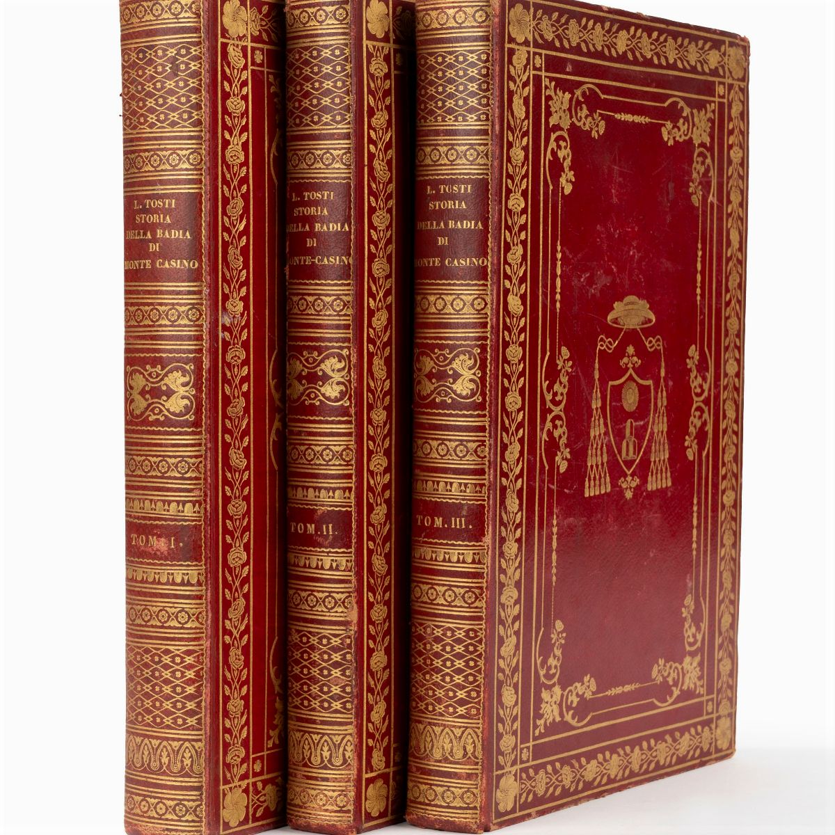 Naples, Cirelli, 1842-1843. In 4th, vols. 3, small views of the Abbey engraved on the frontispieces, XII-428; 322; 384 with 23 plates engraved on copper f.t., figured initials and engraved headpieces, rare marginal flourishes, artistic coeval binding in full red morocco, title and friezes in gold on the spine, large cardinal's coat of arms engraved in gold on the plates, dentelles, gilt cuts, some peeling and slight defect.