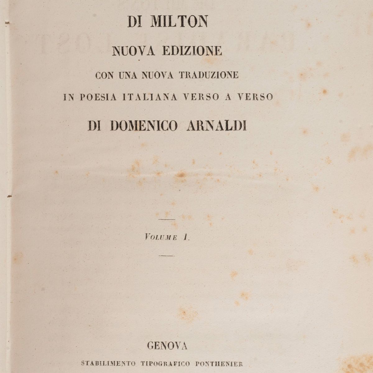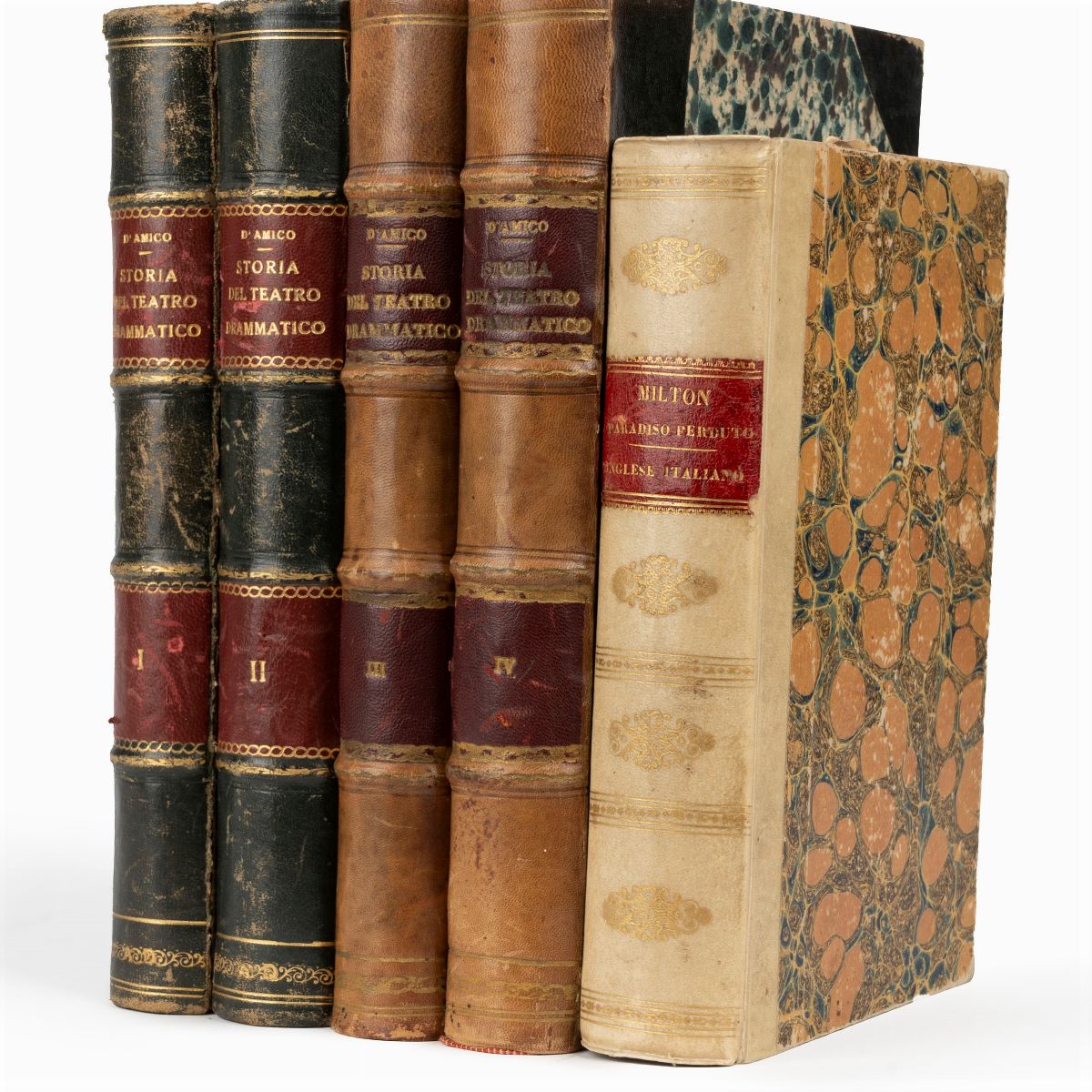 Genoa, Ponthenier, 1852. In 8th. Scattered foxing, half-parchment binding, red leather tag on the smooth spine with author and title in gold. § Silvio D'Amico. History of dramatic theatre. Milan; Rizzoli 1939 - 40. In 8th major. 4 vols. With numerous illustrations and color plates, period binding in green half leather, spine with 4 bands, compartments with red leather inserts with gold titles, slight defects.