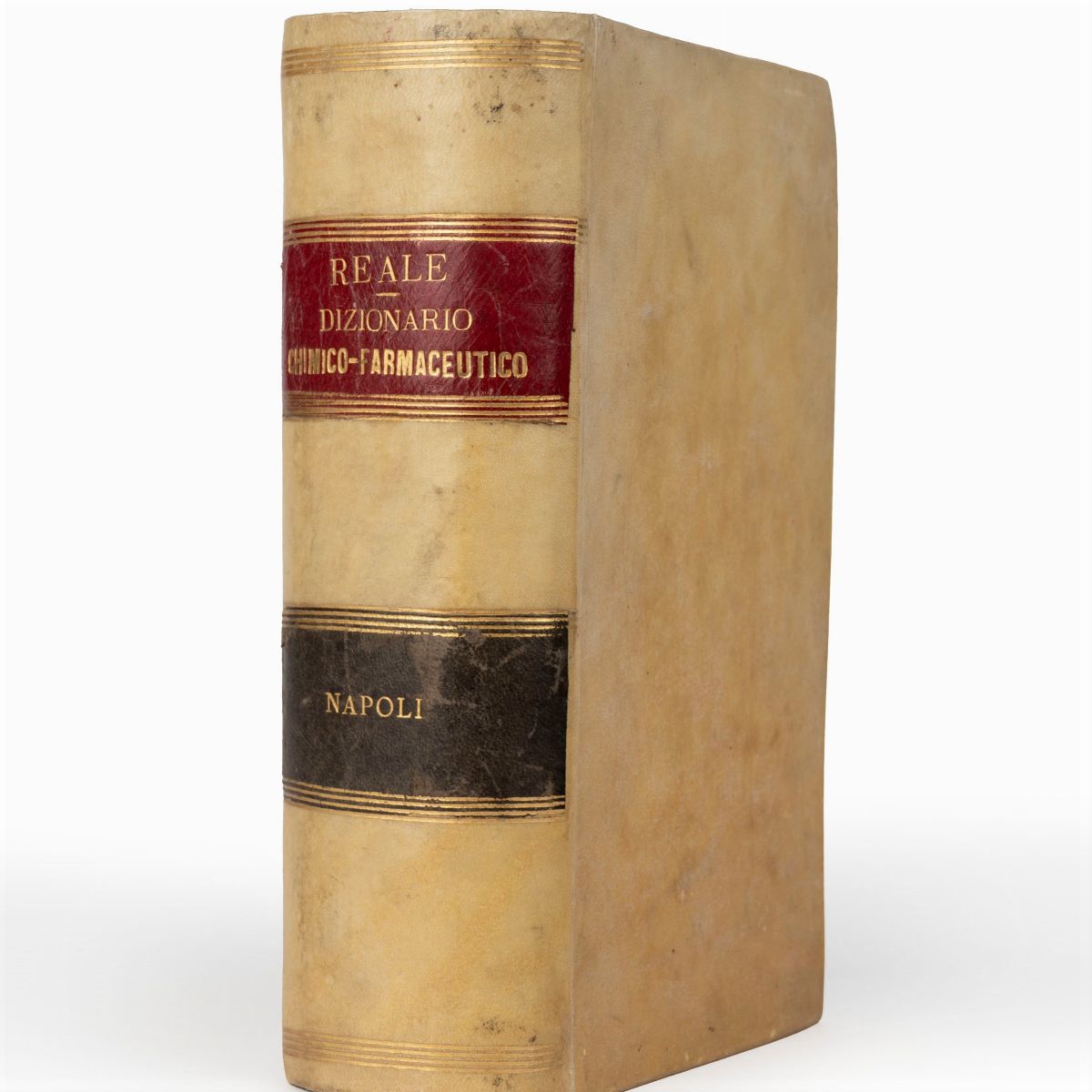 Naples, Tipografia della R. Accademia delle Scienze, 1887. 8th, 3 volumes bound into one, pp. 1414 (continuous numbering) with 288 wood engravings interspersed in the text depicting plants, animals, drugs and the chemical devices most used in pharmacies and 2 large chromolithograph plates, folded several times, depicting 52 different types of mushrooms. Contemporary binding in full parchment, double gusset, title and gold friezes on the spine.