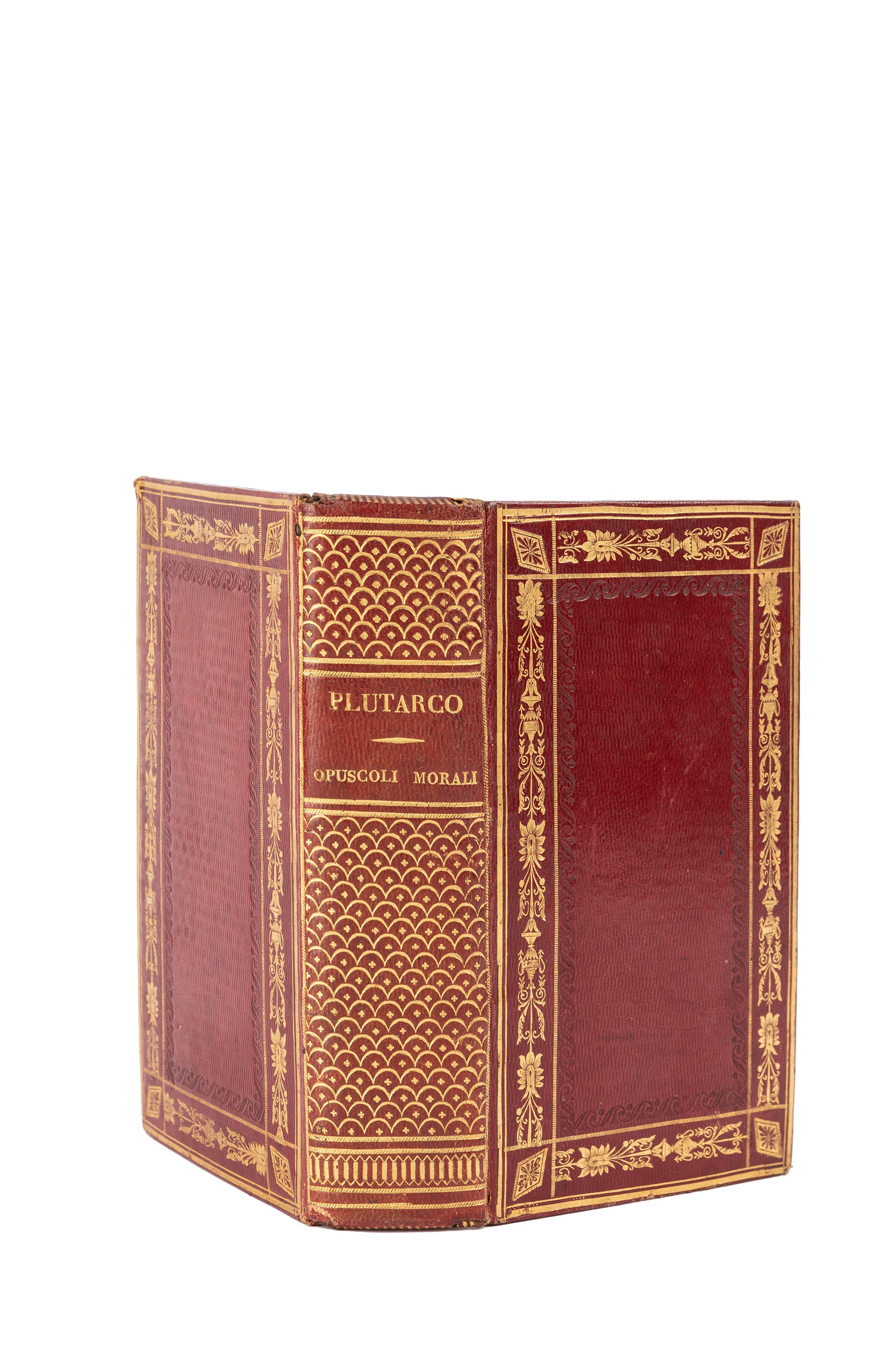 Brescia, from the typ. Foresters and Christians, 1823. In 12th. Splendid romantic binding in long-grain red morocco with frames on the plates finely decorated with geometric and figurative motifs, spine decorated with golden motifs, gold title, golden edges.