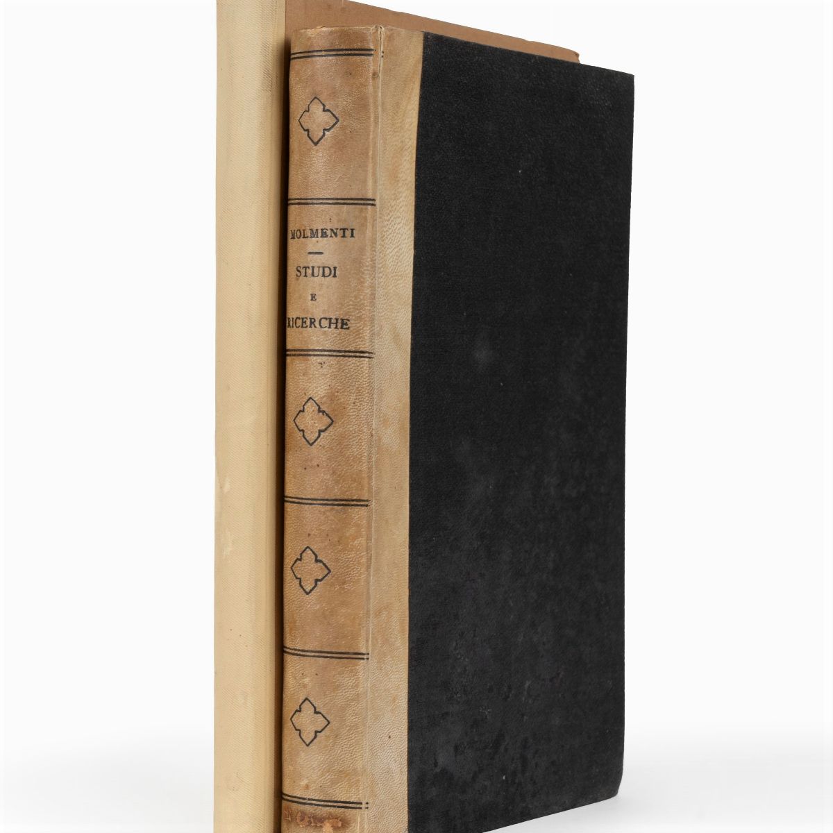 Turin, L. Roux and C., 1892. 8th, pp. 350-(2). Contemporary binding mz. parchment, title and friezes in black on the spine. Original edition. - San Marco (The legends and historical memories - Giuspatronato del Doge - The procurators - The Holy Office). The Bellini painters - Research and documents. Venice in French art and literature. A revenge in the 16th century. A slanderer - Venetian society at the end of the republic. § Together and: Valmaggi, Luigi. The Cicisbei. Contribution to the history of Italian costume in the century. XVIII. Turin, Chiantore, 1927. 8th, pp. 259-(3) with tables f.t. Editorial binding mz. canvas with title and color illustration on plate.