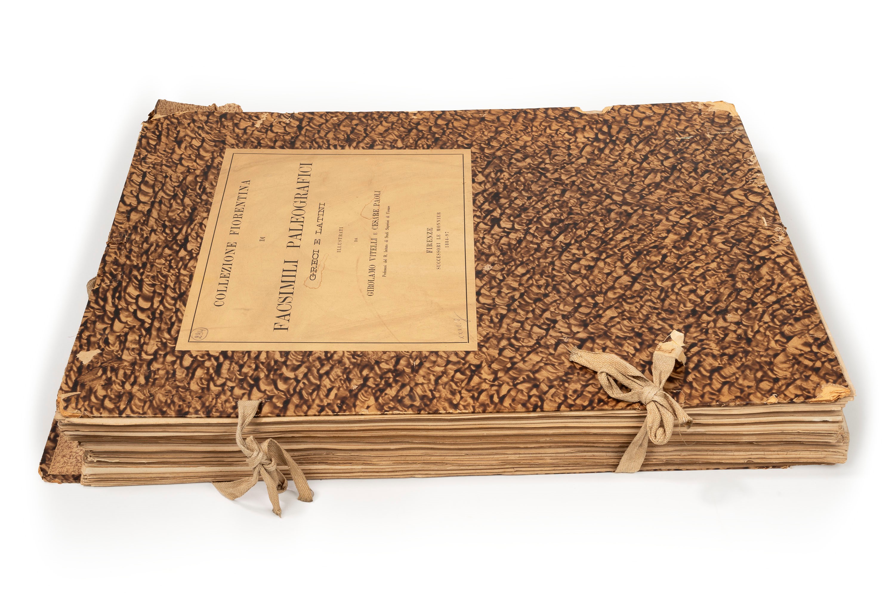 Florence, Le Monnier Successors 1884 - 97. In 2nd. Loose sheets and 50 reproduced plates, some rare foxing and marginal redness, within folder with ties, some defects. § Mancone Ambrogio, The Cassino documents of the 10th century with formulas in the vernacular., Rome, State Polygraphic Institute, 1960. In 2°. With 4 tipped-in plates reproducing facsimile manuscripts, editorial paperback.