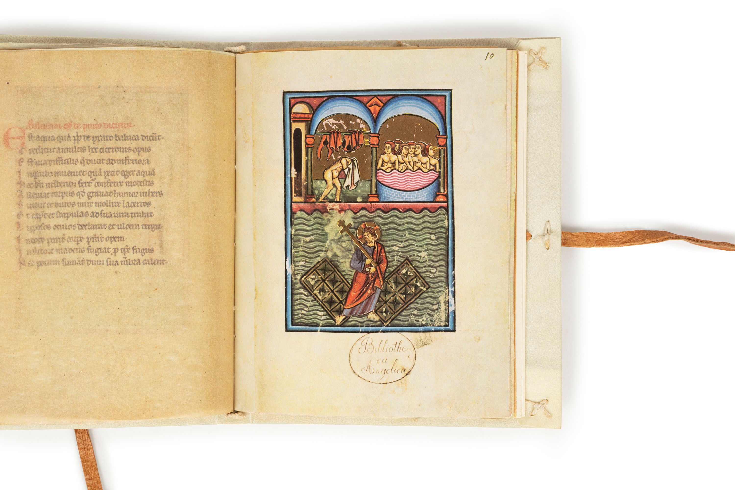 Rome, Istituto Poligrafico dello Stato, 1962. Box containing a paperback of the text and a volume bound in parchment with color reproductions of the text by Pietro da Eboli. Defects in the box.