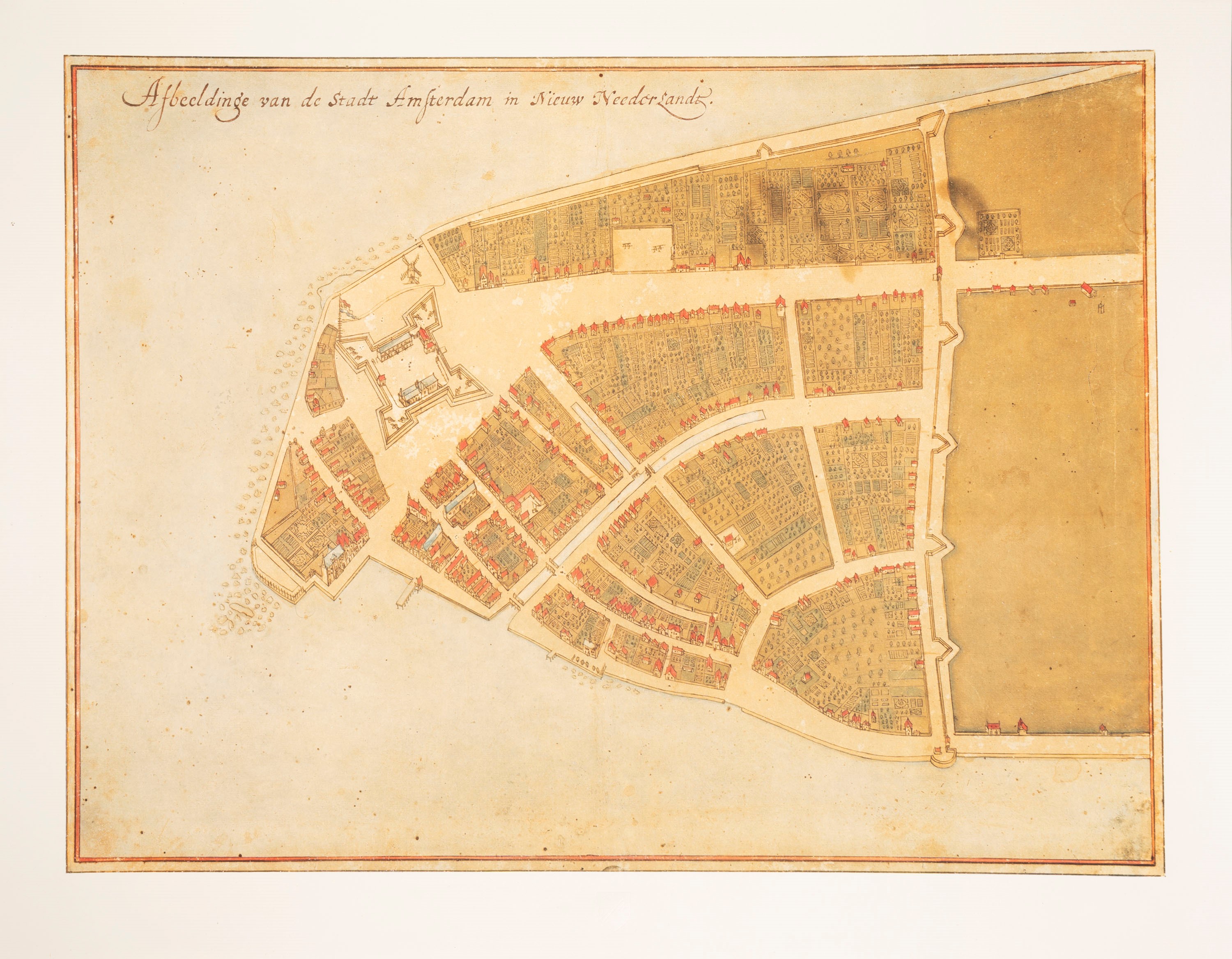 Facsimile reproduction of the original plan and view of Nieuw Amsterdam by Johannes Vingboons, preserved at the Laurentian Library in Florence; the view at the Algemein Rijksarchief in The Hague. The Plan and View were printed by Jaffé Lichtdrucker und Lithographen of Vienna. Number 147 and 195 of a limited edition of 500 copies.