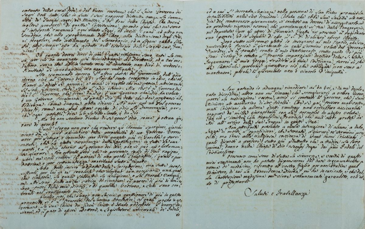 This is a famous letter cited from bibliographies in which the cardinal, Alessandro & nbsp; Mattei, & nbsp; writes to the commissioner of the executive power of Ferrara, then under French occupation; all citizens should have taken an oath to the Republic, but the cardinal & nbsp; Mattei & nbsp; refused with this letter writing his reasons and following this choice he was exiled.