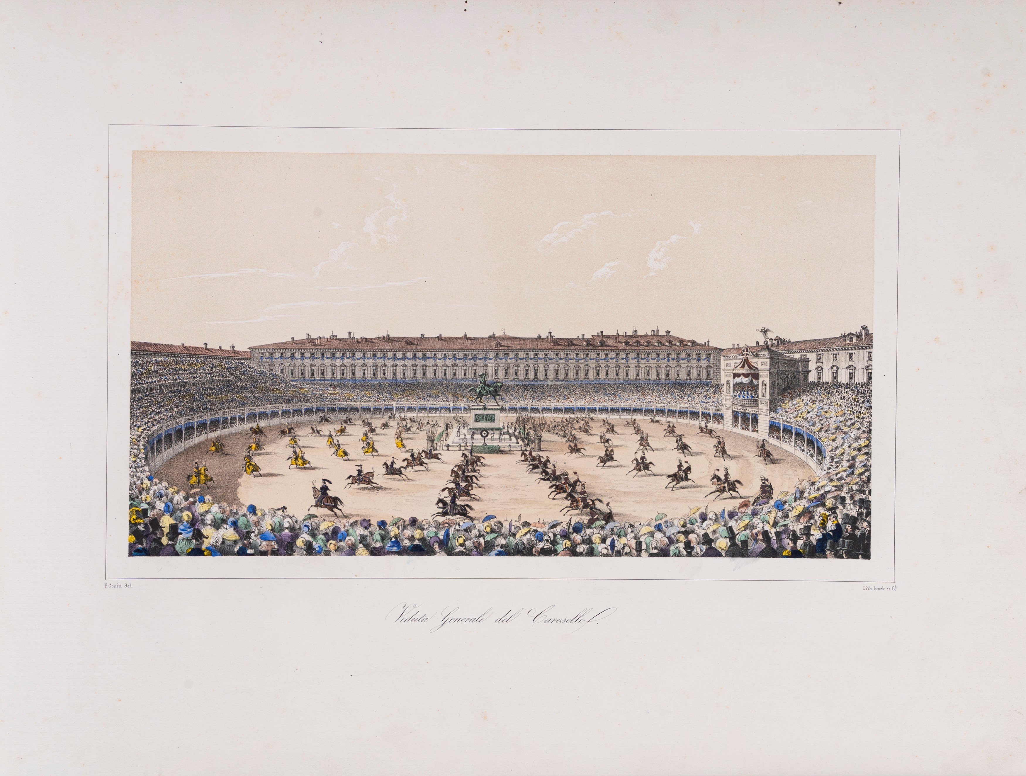 Single edition. Album composed of eight large watercolor lithographs illustrating the monumental carousel that took place in Piazza San Carlo in Turin on April 22, 1842, to celebrate the wedding between Maria Adelaide of Habsburg-Lorraine and Victor Emmanuel of Savoy, then King of Sardinia, but future first King of Italy in 1861. Particularly evocative is the first plate, which depicts a general view of the Carousel, with the royal box on the right and the large temporary amphitheater, set up in the square for the occasion. The other plates depict the various riders (on horseback or on foot), in costume and ceremonial attire.