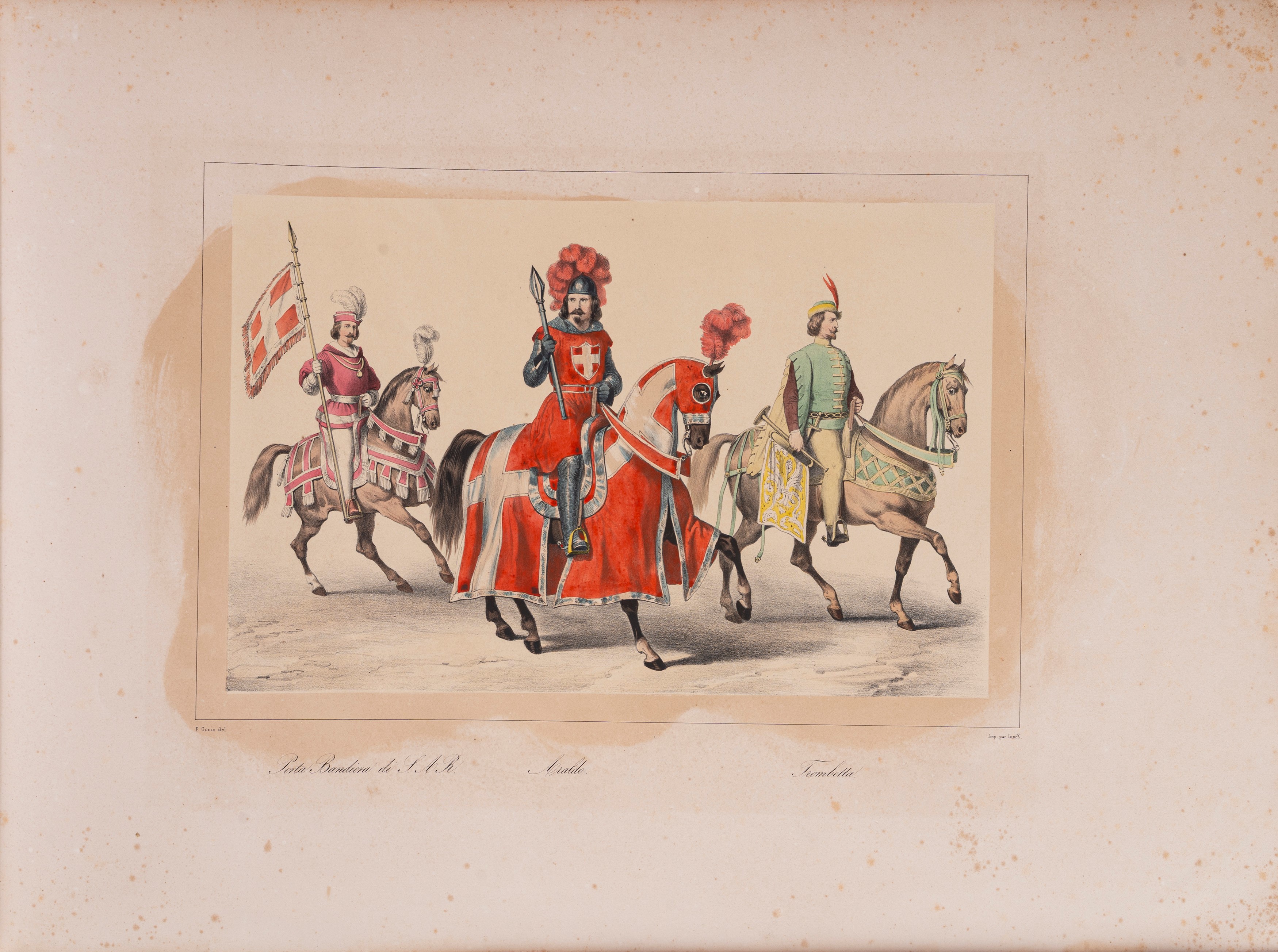 Turin, 1842. Large oblong folio; title framed by a richly lithographed border by Junck, with a crowned coat of arms and figures of knights, 2 cc. of explanatory pages and 8 large plates finely colored in contemporary watercolors, drawn by Gonin and lithographed by Junck himself, light browning and foxing, very small gap in the white outer margin of one leaf, publisher's binding in all brown cardboard, printed title on the front cover, reinforced spine, browning, slightly loose front cover, some staining and staining on the covers, in a Modena cloth slipcase. Printed bookplate on the inside cover.