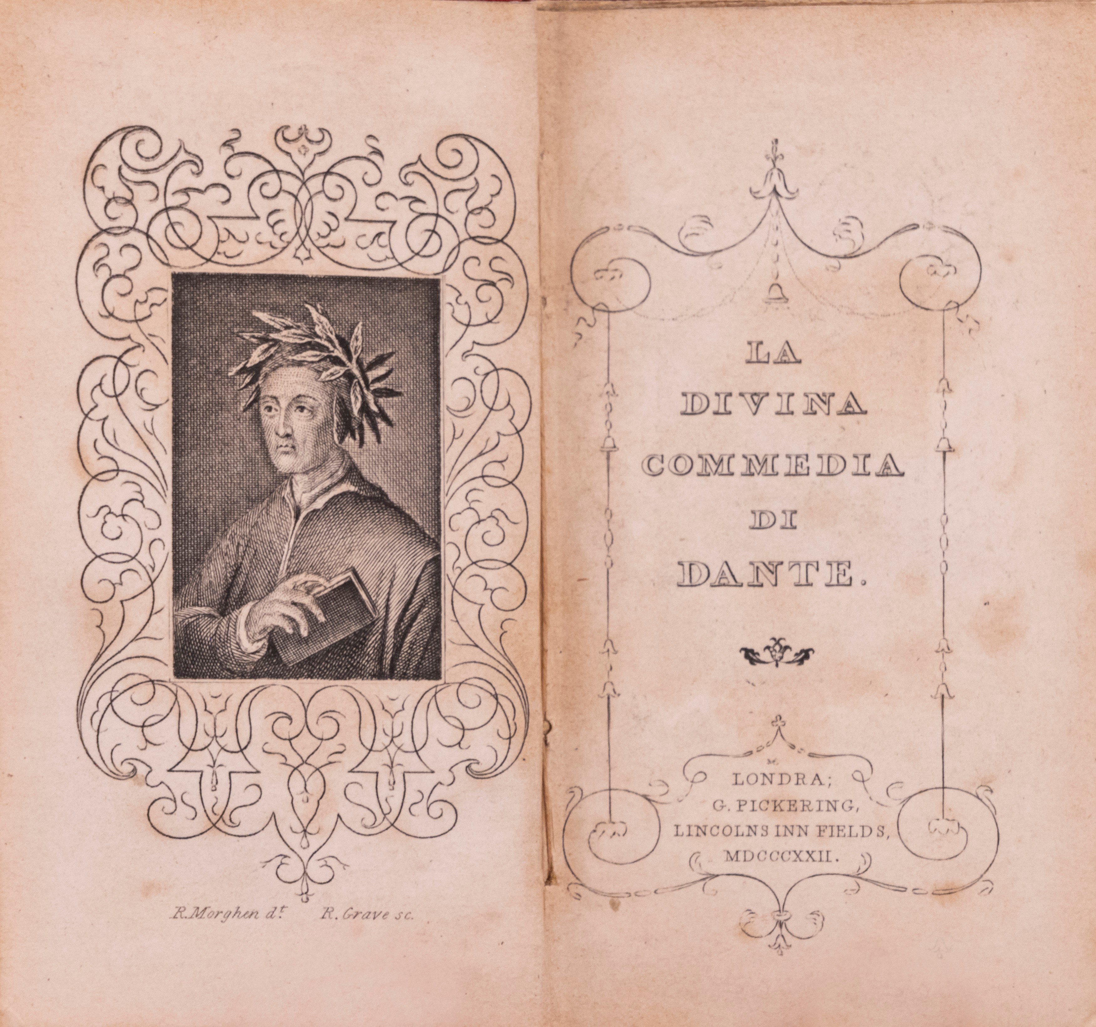 London, C. Corrall and G. Pickering, 1822. In 32°. Two volumes, frontispiece portrait of Dante engraved by Grave after a design by Morghen, red percale bindings. § Dante Alighieri. The Divine Comedy. Florence, Davide Passigli, 1840. In 24°. 85 x 50 mm. Splendid romantic blue morocco binding, with blind embossing on the covers and gold decorations, gilt edges.