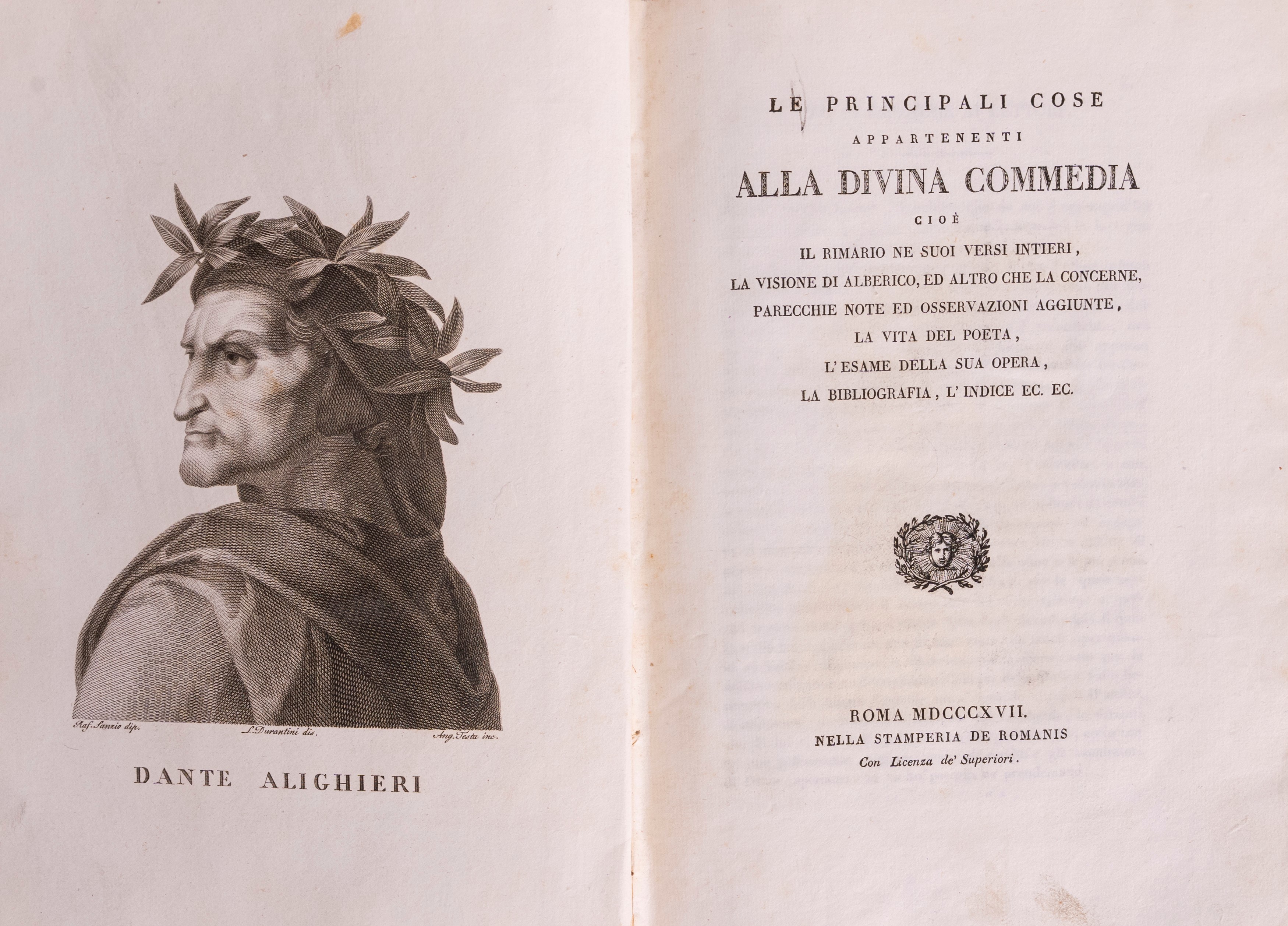 Rome, Stamperia De Romanis 1815 - 1817. In 4°. 4 volumes. With a portrait of the Poet drawn by Durantini and engraved by Angelo Testa and three prints representing the three kingdoms at the beginning of each canticle. Light foxing. Contemporary half-leather binding on marbled cardboard.