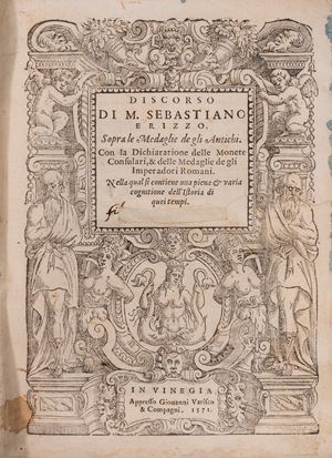 Vinegia, Appresso Giouanni Varisco & Compagni, 1571. In-8°; Hardback binding in full parchment with three raised bands (with traces of light, restored defects and colored in green), edges colored in green, title handwritten on the lower edge; fully illustrated title page in black and white with a framed title, historiated initials, woodcut headpieces, and numerous clear engravings of medals in the text. Old abrasion on the title page due to the removal of an old handwritten ownership indication under the title, without affecting the text; small tear on the frontispiece, without losses; work in good condition.