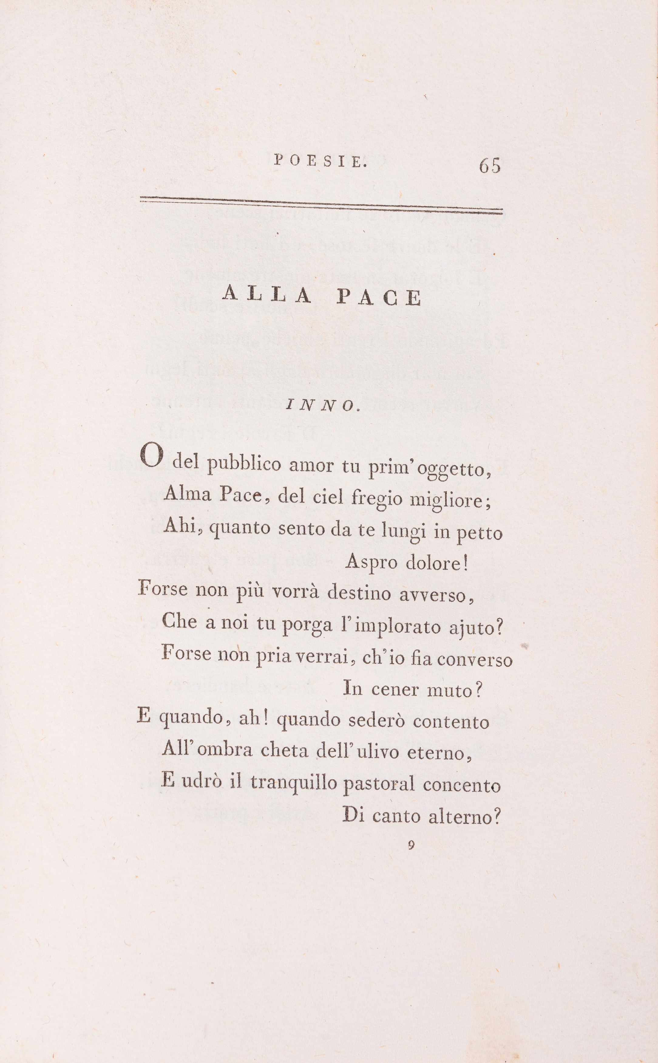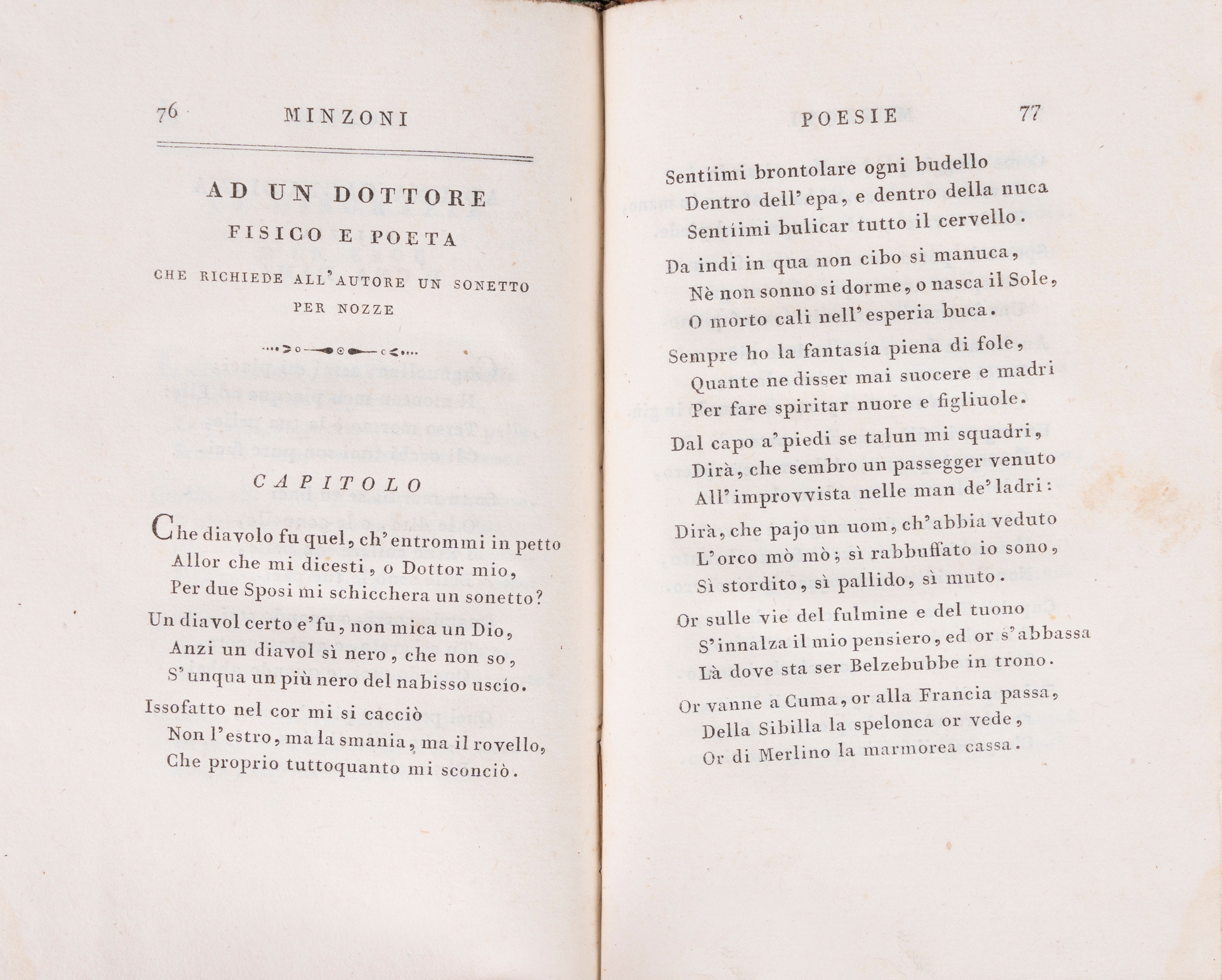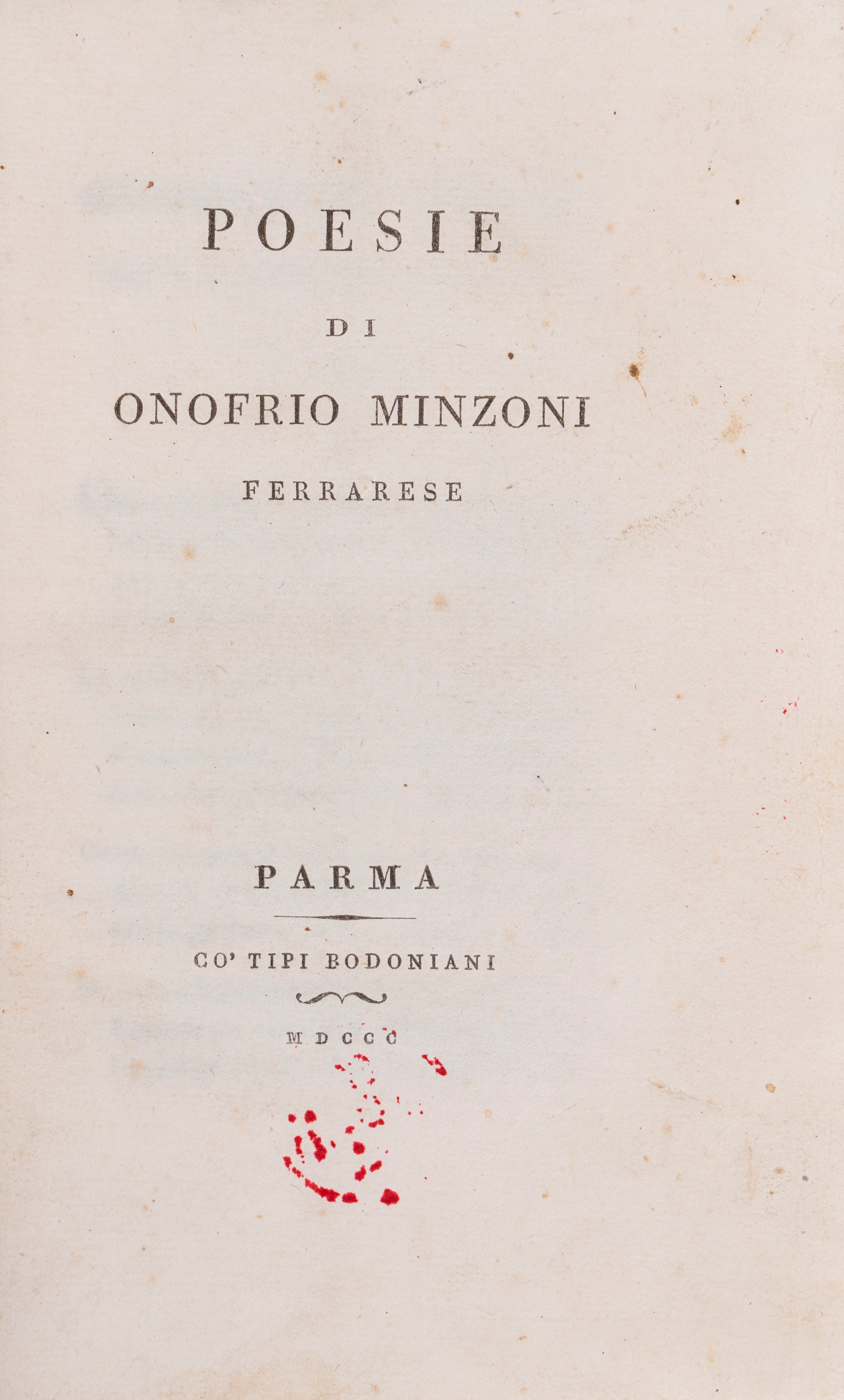 Parma, with Bodoni types, 1802. In 8vo. Copper-engraved vignette on the title page, elegant contemporary sponged calf binding with gilt decorations on the covers and spine, gilt title within a tag on the spine, red edges. § Also in the lot: Minzoni, Onofrio. Poesie , Parma, Bodoni, 1800. In 16vo. Contemporary half-leather and marbled paper binding, gilt title within a red tag on the spine, minor defects.