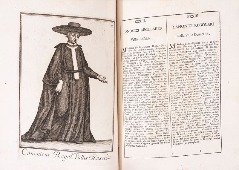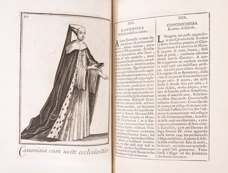 Rome, in the printing house of Giorgio Placho, Engraver and Type-Gutter in San Marco, 1714. In 4°. 3 volumes. Title pages in Italian and Latin, with a restored tear on the third leaf of vol. I, a small stain on the front of vol. II, slight foxing and browning, contemporary calf binding, spines richly decorated in gold, titles within a red label, some small losses on the spine, minor defects.