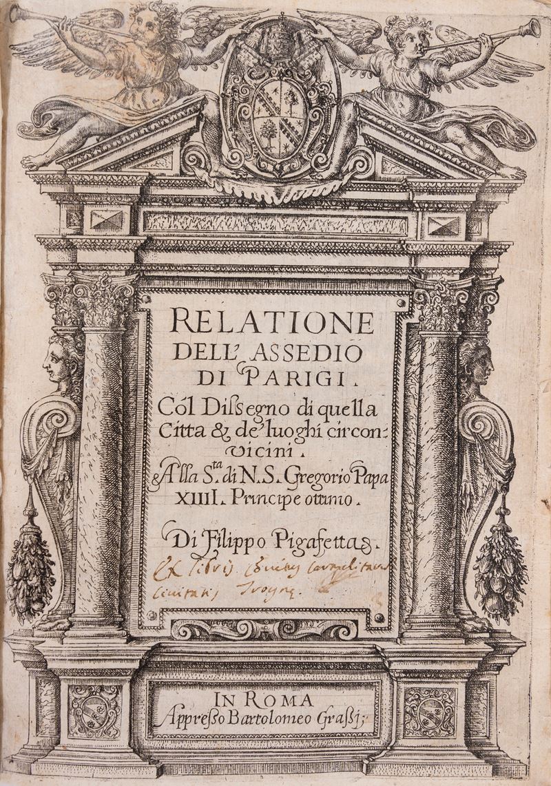 "In the Relatione dell'siedio di Parigi col di quella città e de' luoghi dintorni (Rome, B. Grassi, 1591) dedicated to Pope Gregory XIV, he analysed the political and military situation of the two opposing camps, described the city (strong on the knowledge gained from his previous stays) and set out the attempts at a political solution; he personally participated in a meeting with Henry of Navarre to dissuade him from the siege." Treccani, sub vocis .