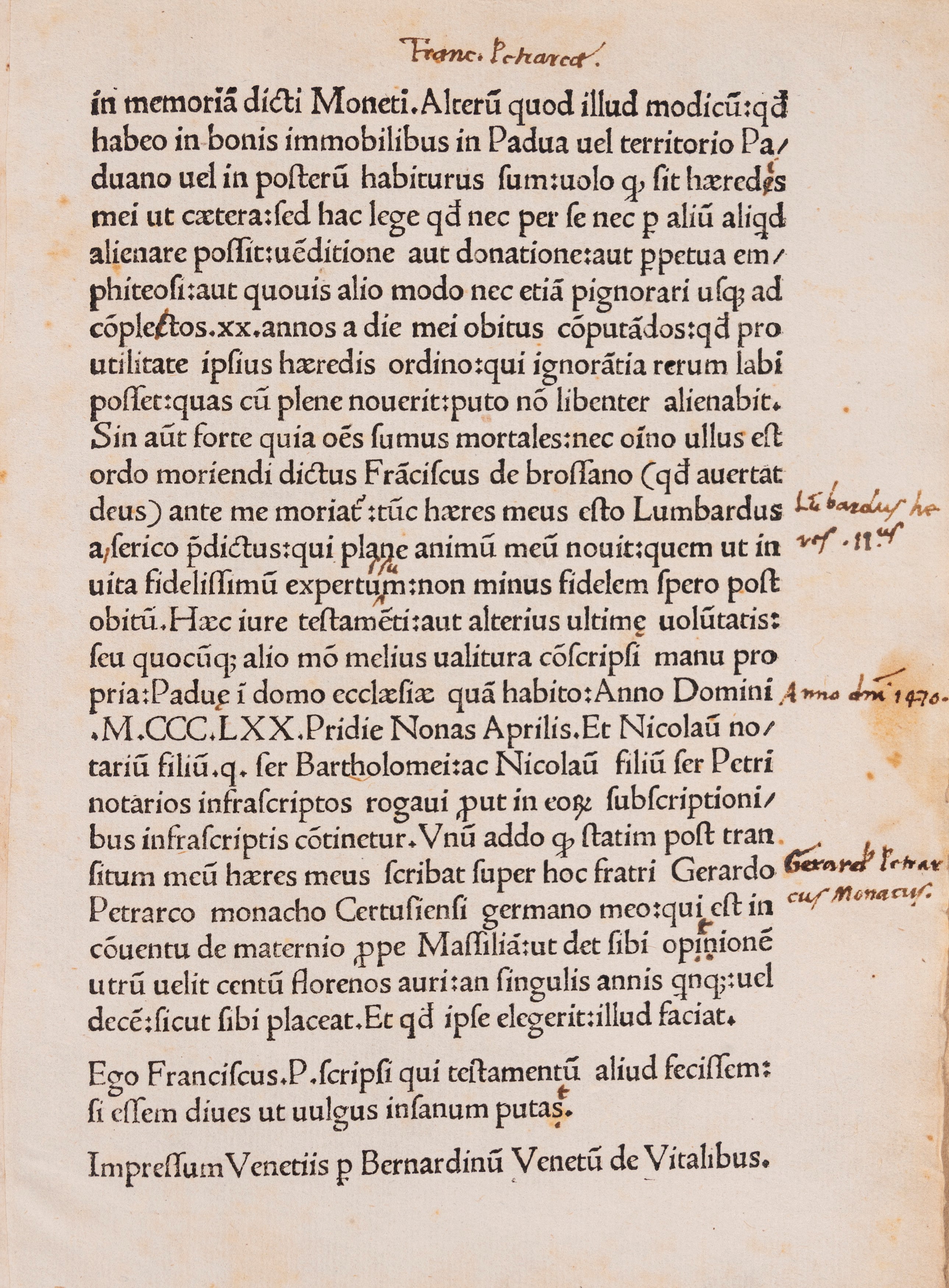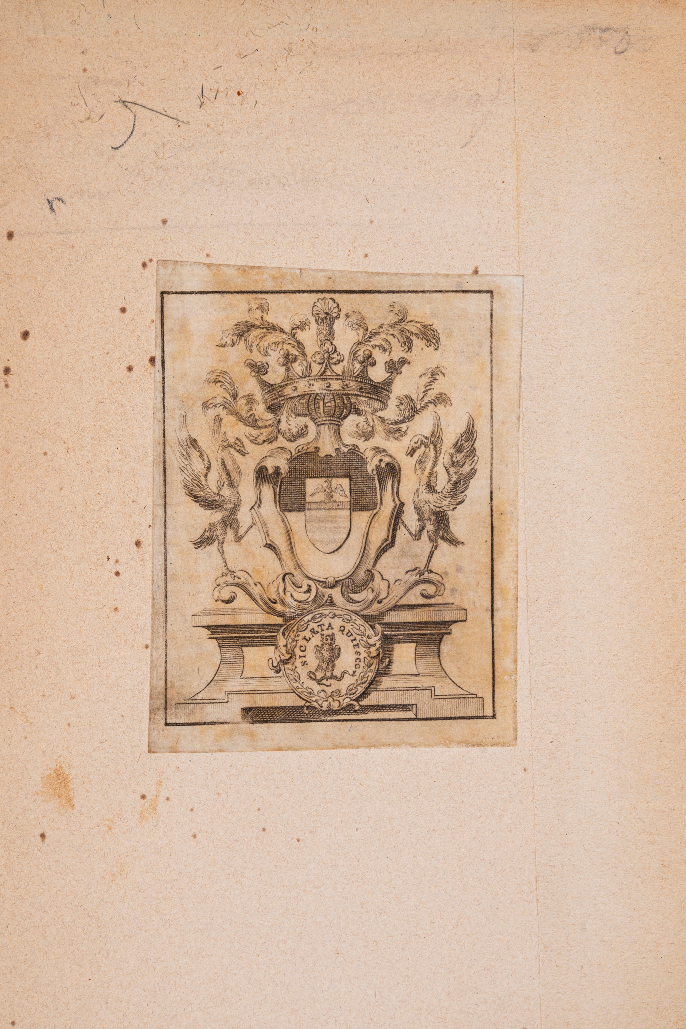 Venice, Bernardinus Venetus, de Vitalibus, [after 1498]. In 4th. 4 cc. Decorated drop cap, marginal glosses by a contemporary hand, binding in green half cloth and 19th century cardboard. Noble ex libris on the pastedown, bearing the "Sic laeta quiesco" coat of arms.
